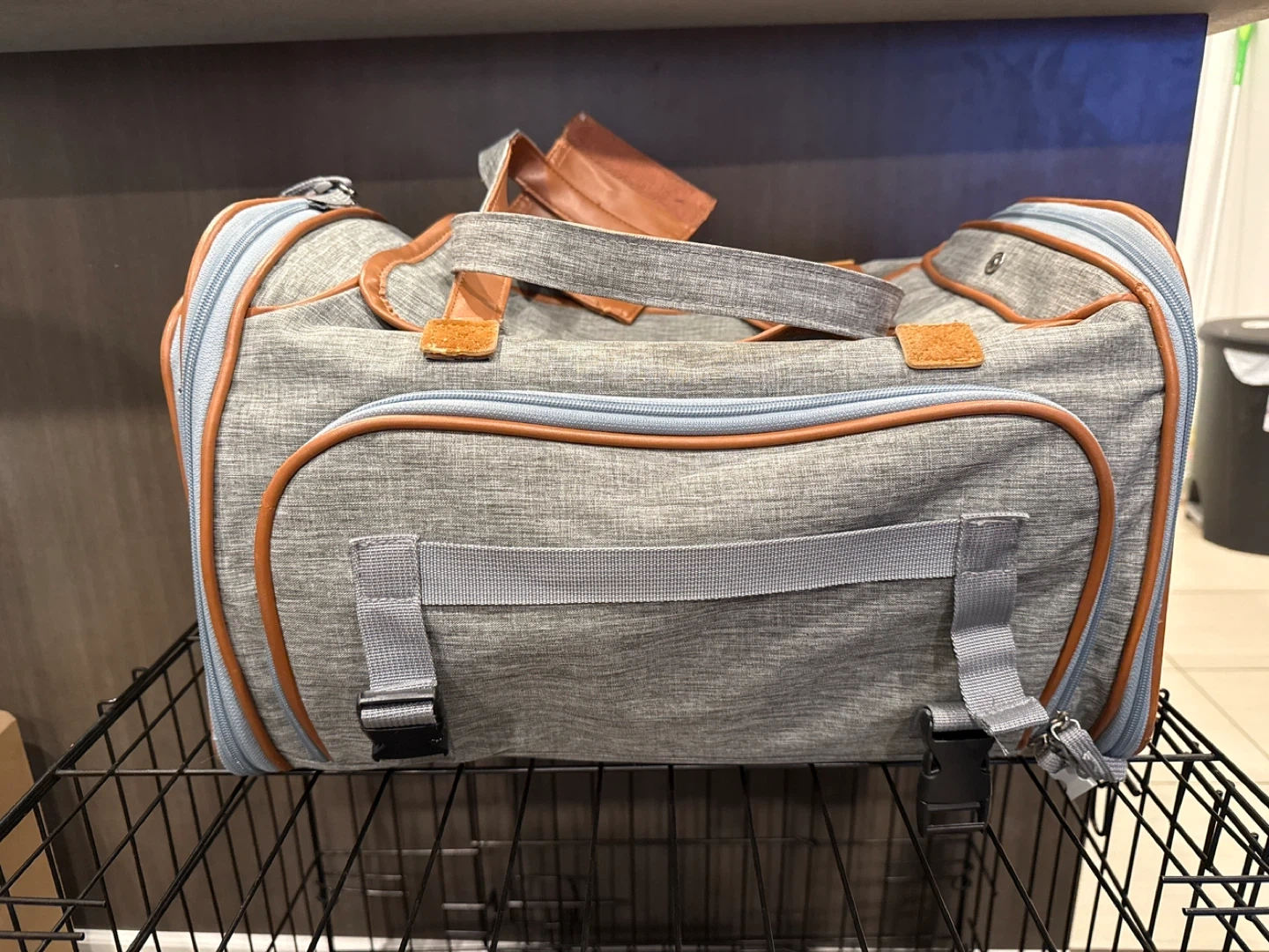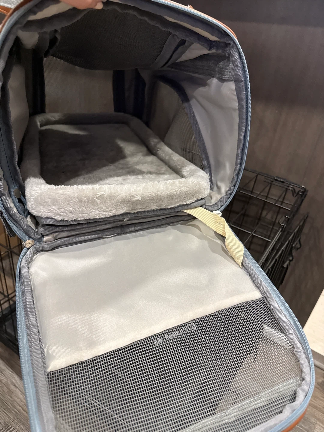 Grey and tan pet carrier bag with mesh windows. It has comfortable handles and a padded interior. Includes a removable mat for easy cleaning.