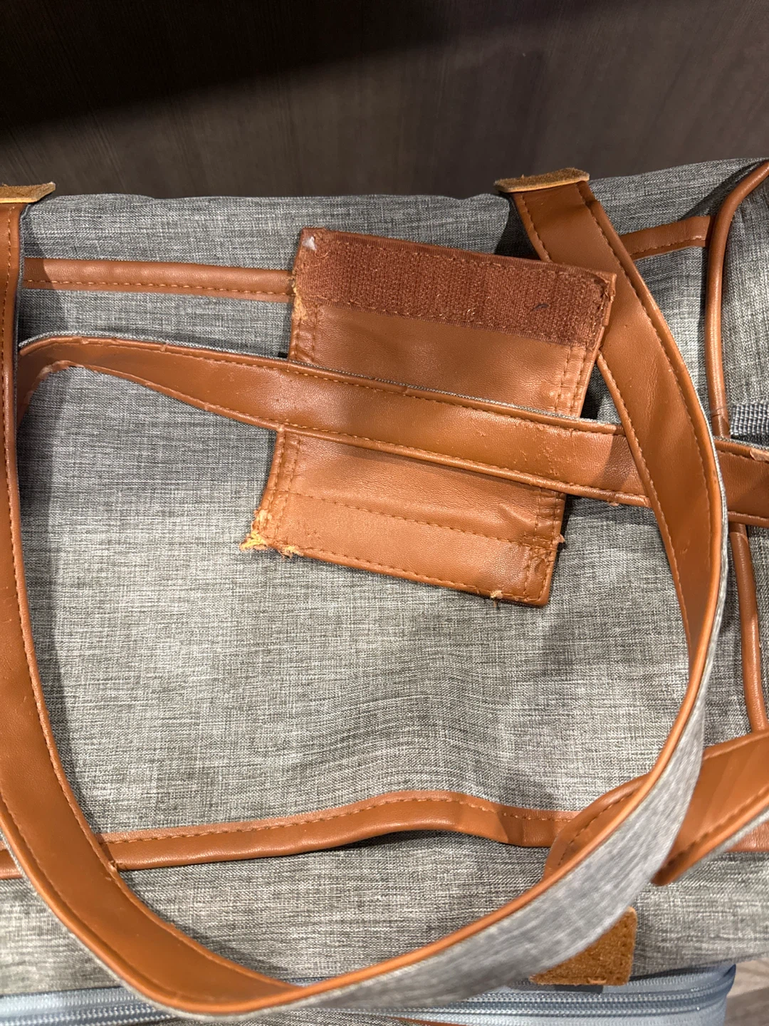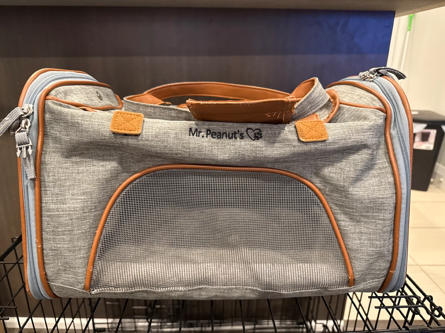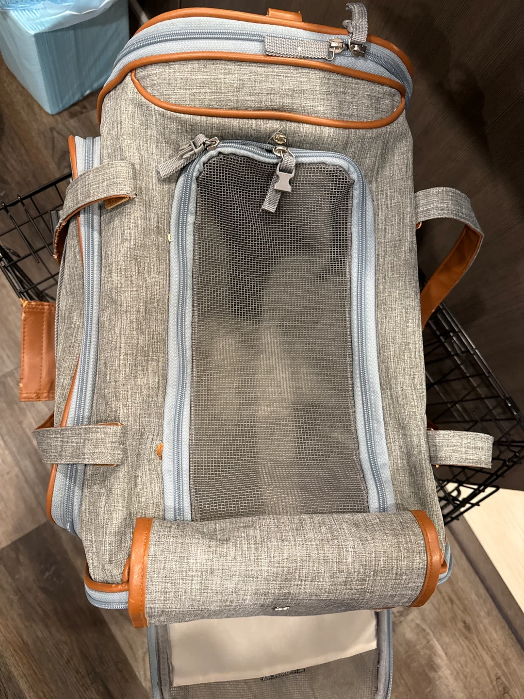 Grey and tan pet carrier bag with mesh windows. It has comfortable handles and a padded interior. Includes a removable mat for easy cleaning.