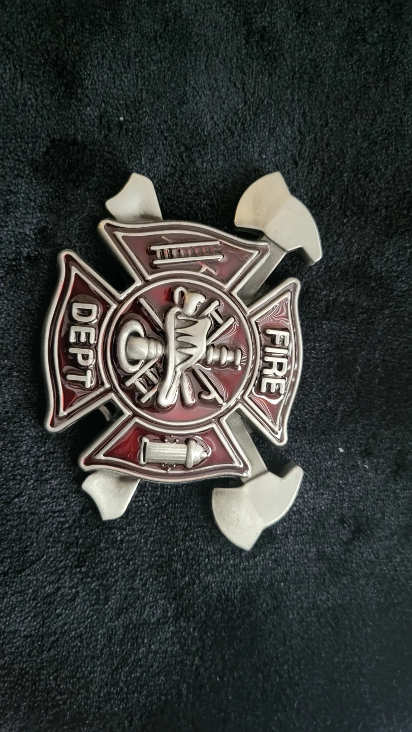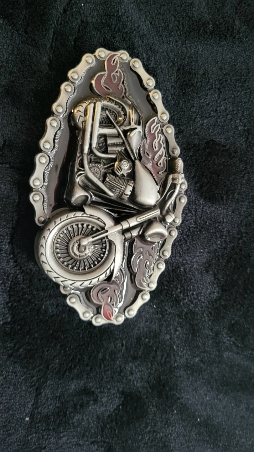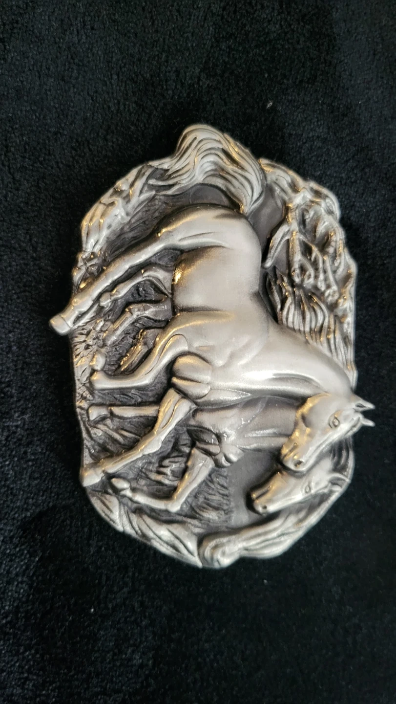 Set includes four decorative belt buckles featuring a horse scene, a deer scene, a firefighter emblem, and a motorcycle design. Each buckle is made of metal with detailed relief work. These would be great statement pieces for any belt! 10.00 each