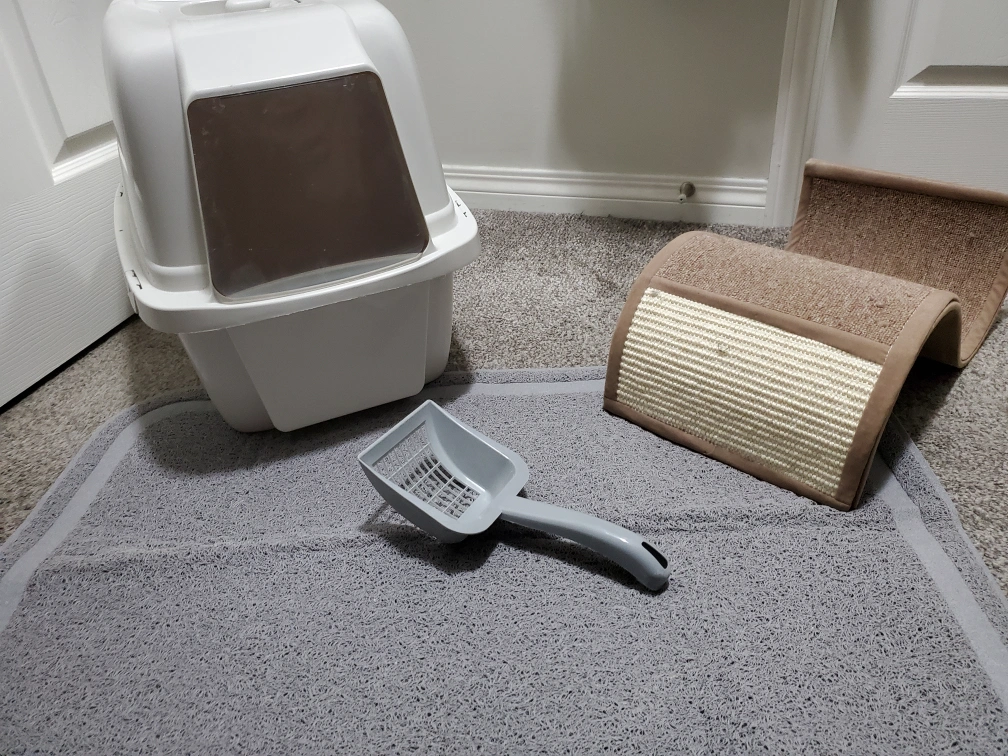 Cat litter box set. Includes a litter box with air filter and easy access door, scoop, and a large litter catching anti-microbial mat. Scratching post included. Originally purchased to babysit a friend's cat and used for less than a week. Everything is in great condition and ready to go to a good home. I believe everything together was originally $130, so this is a great price.