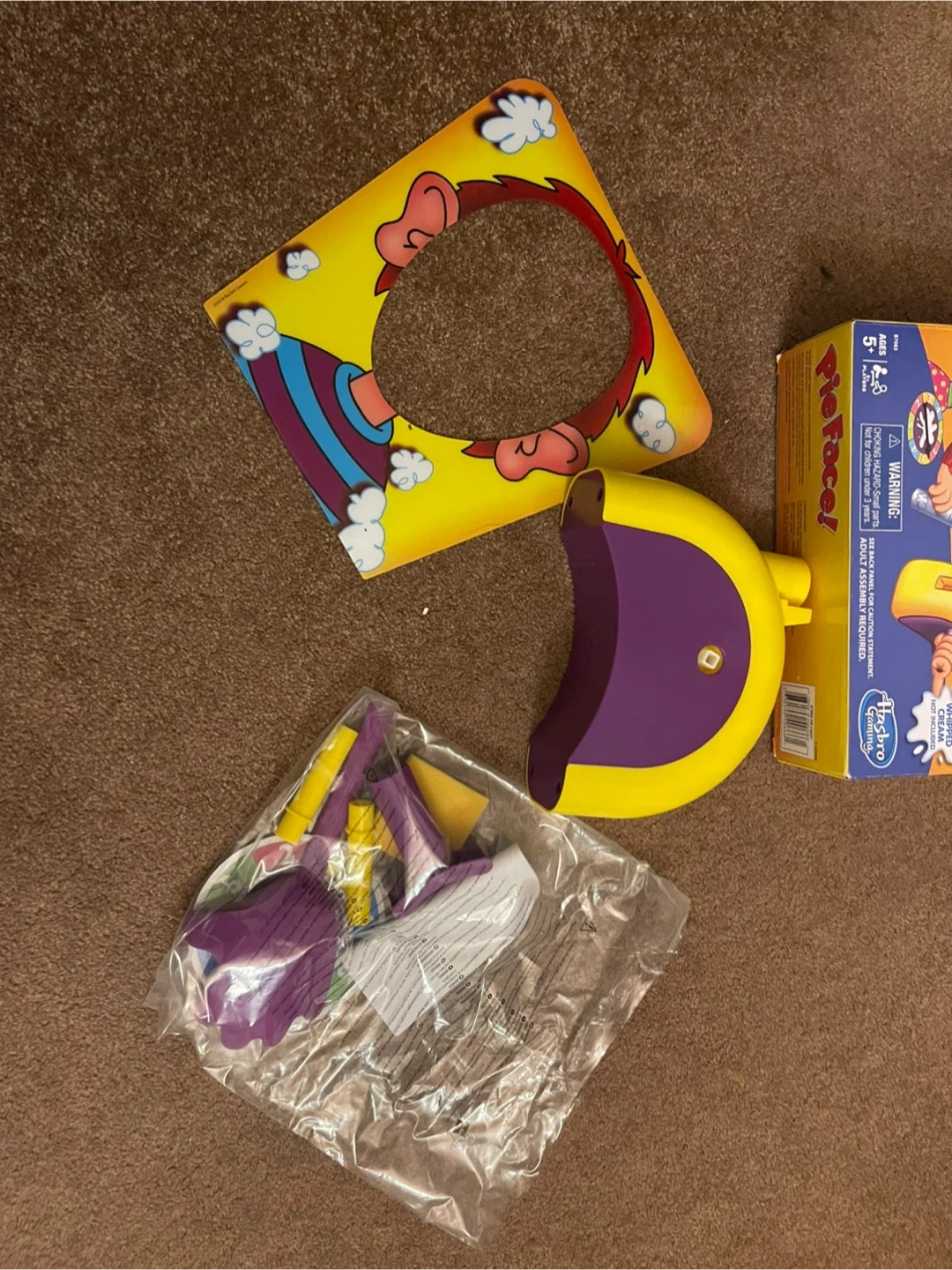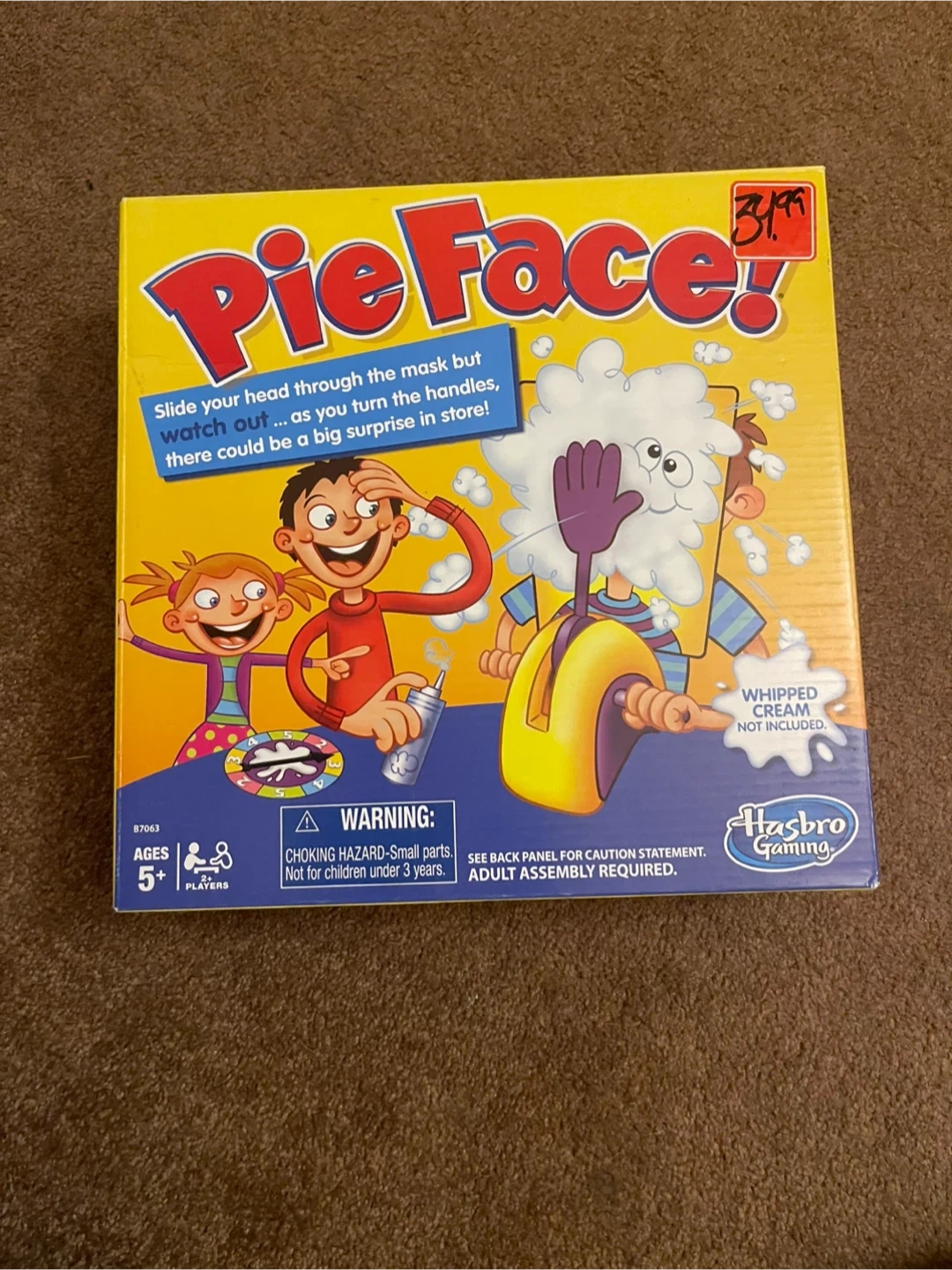 It's the classic Pie Face! game from Hasbro. Players take turns spinning the spinner and trying to avoid getting pied. Great fun for families and friends!