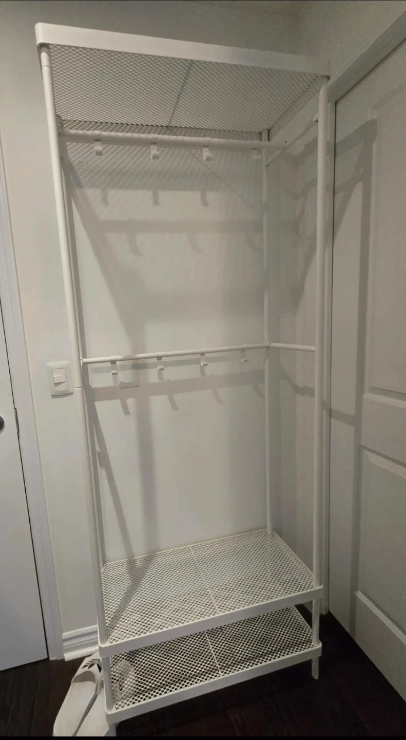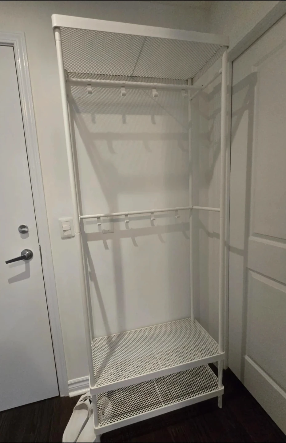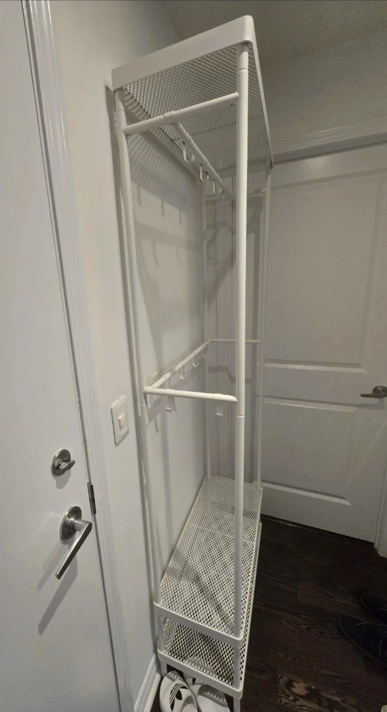 MOVING SALE- Keep your space neat and organized with this sturdy white metal garment rack! Perfect for entryways, bedrooms, or closets.