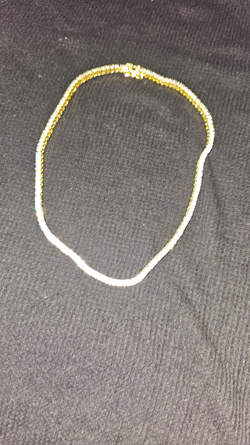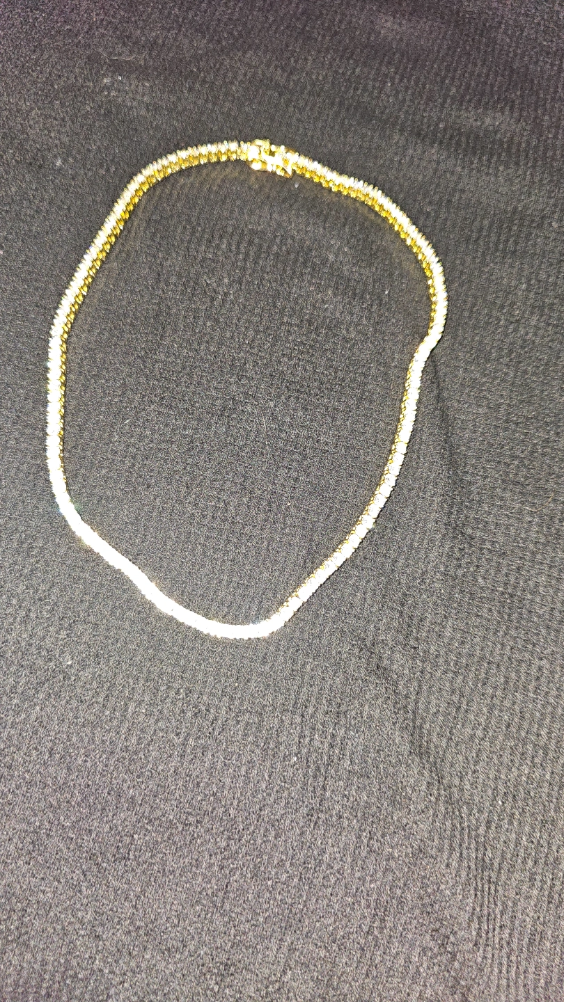 Elegant gold tennis necklace. Features small, sparkling cubic zirconia stones. Classic design, perfect for everyday wear or special occasions. Secure clasp. Females
