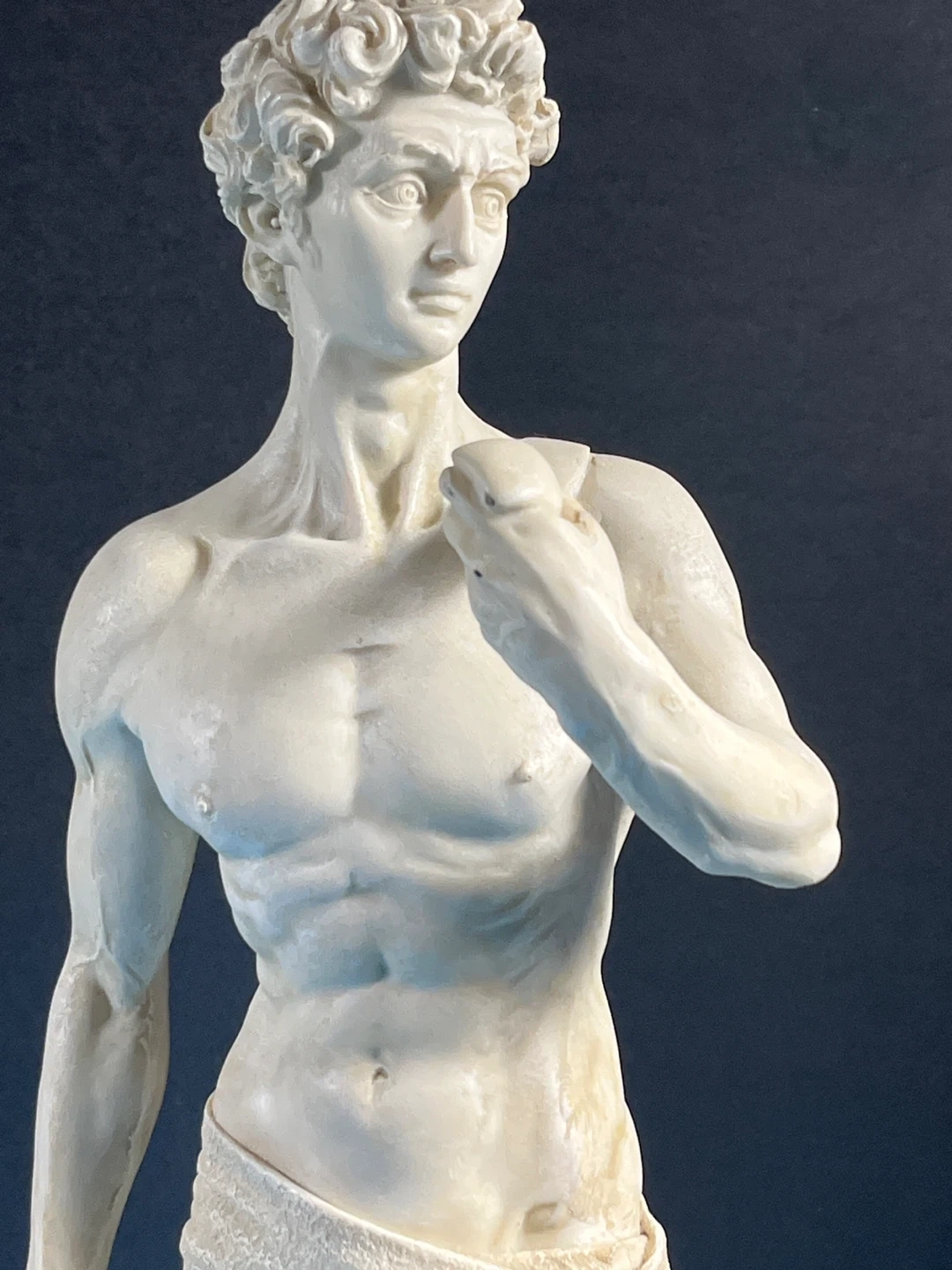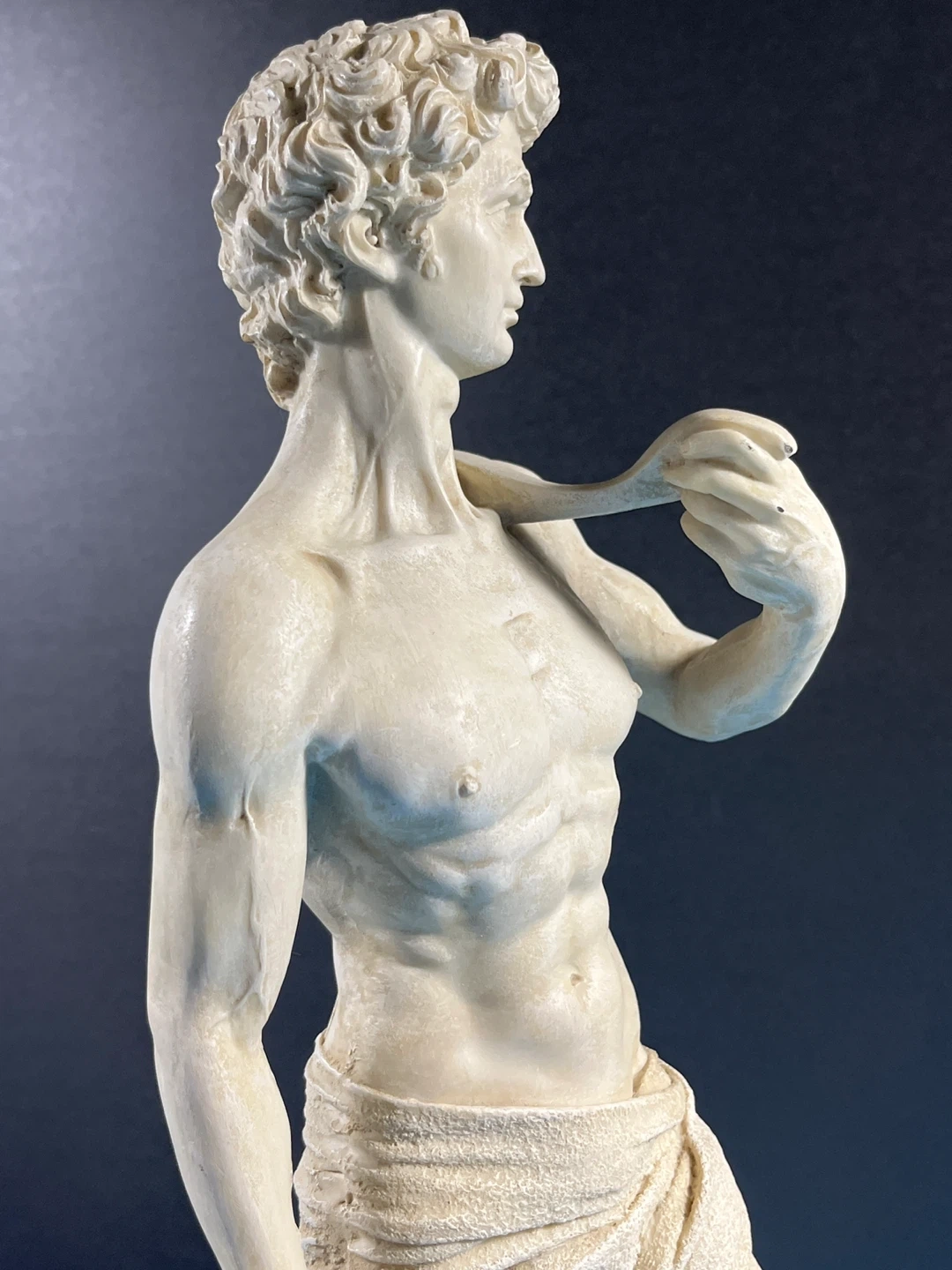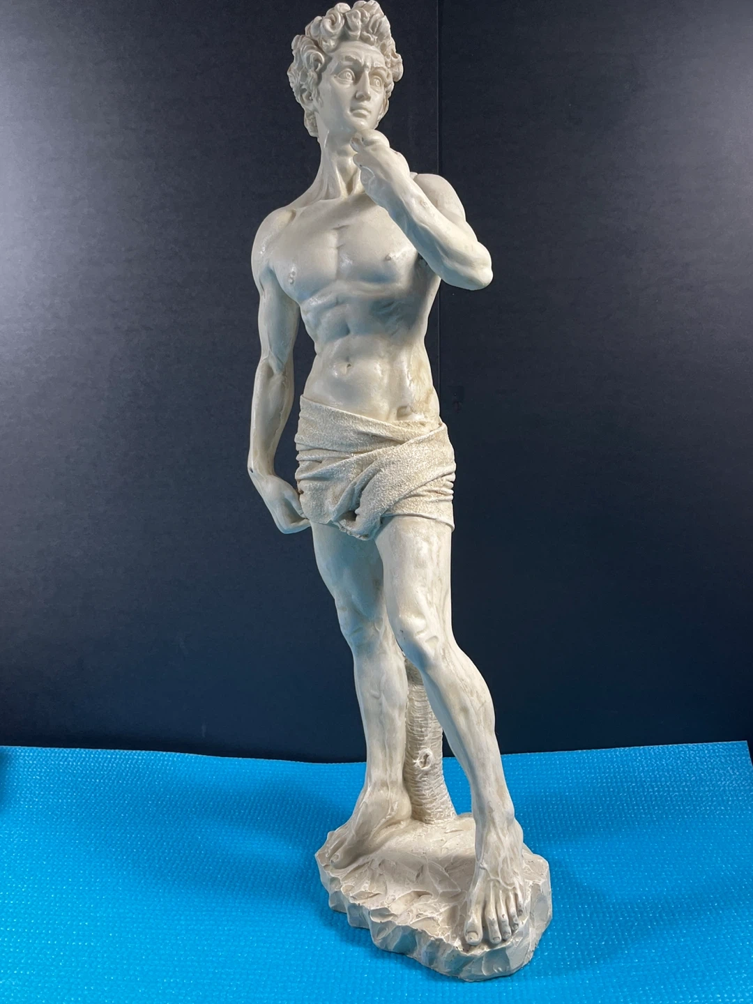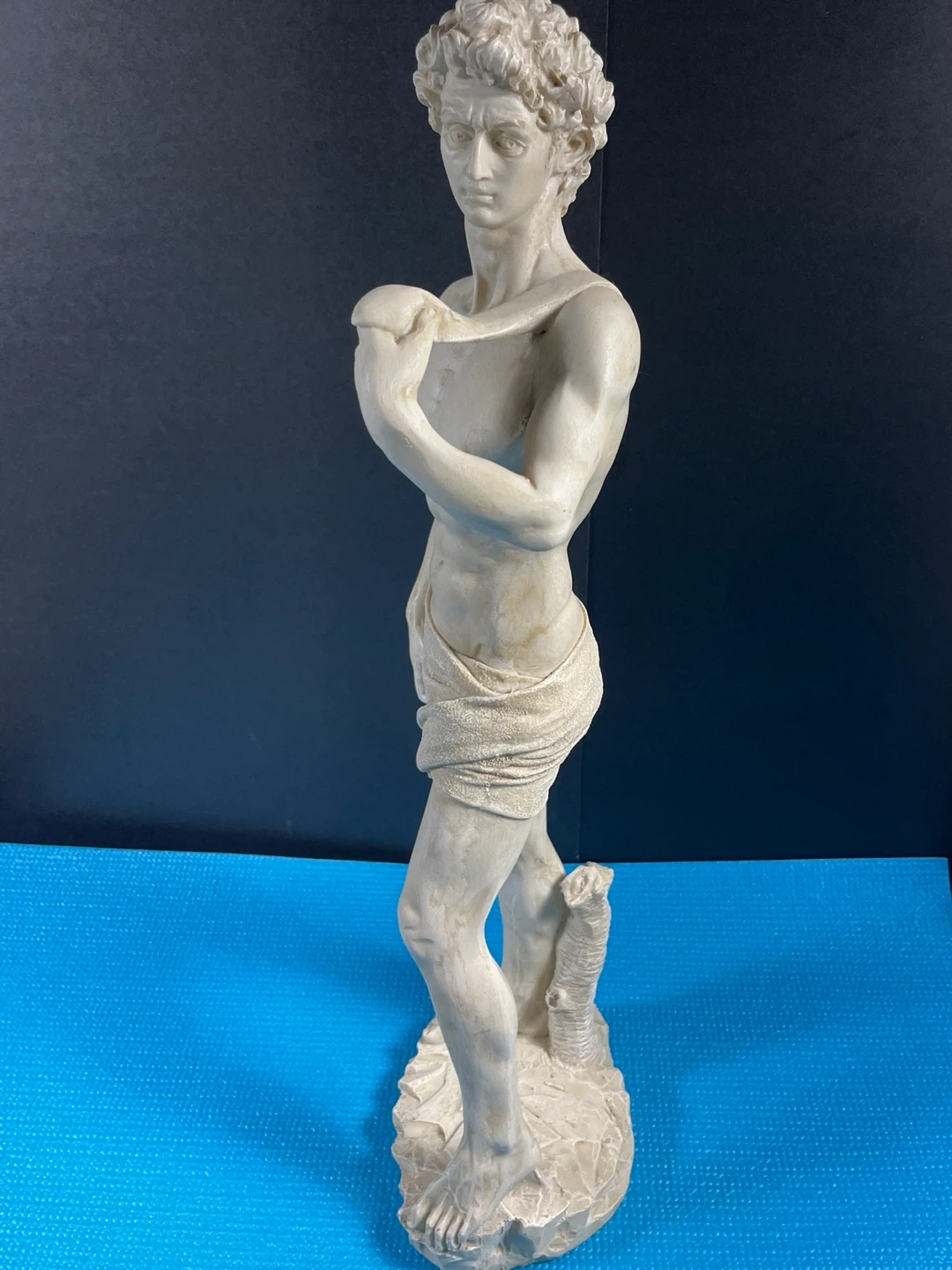 Add a touch of classical elegance to your home with this striking David Statue, standing at approximately 18 inches tall. This statue captures the iconic pose and intricate details of Michelangelo's masterpiece. Please note that this is a used item, though it remains in great shape, ready to be displayed and admired.