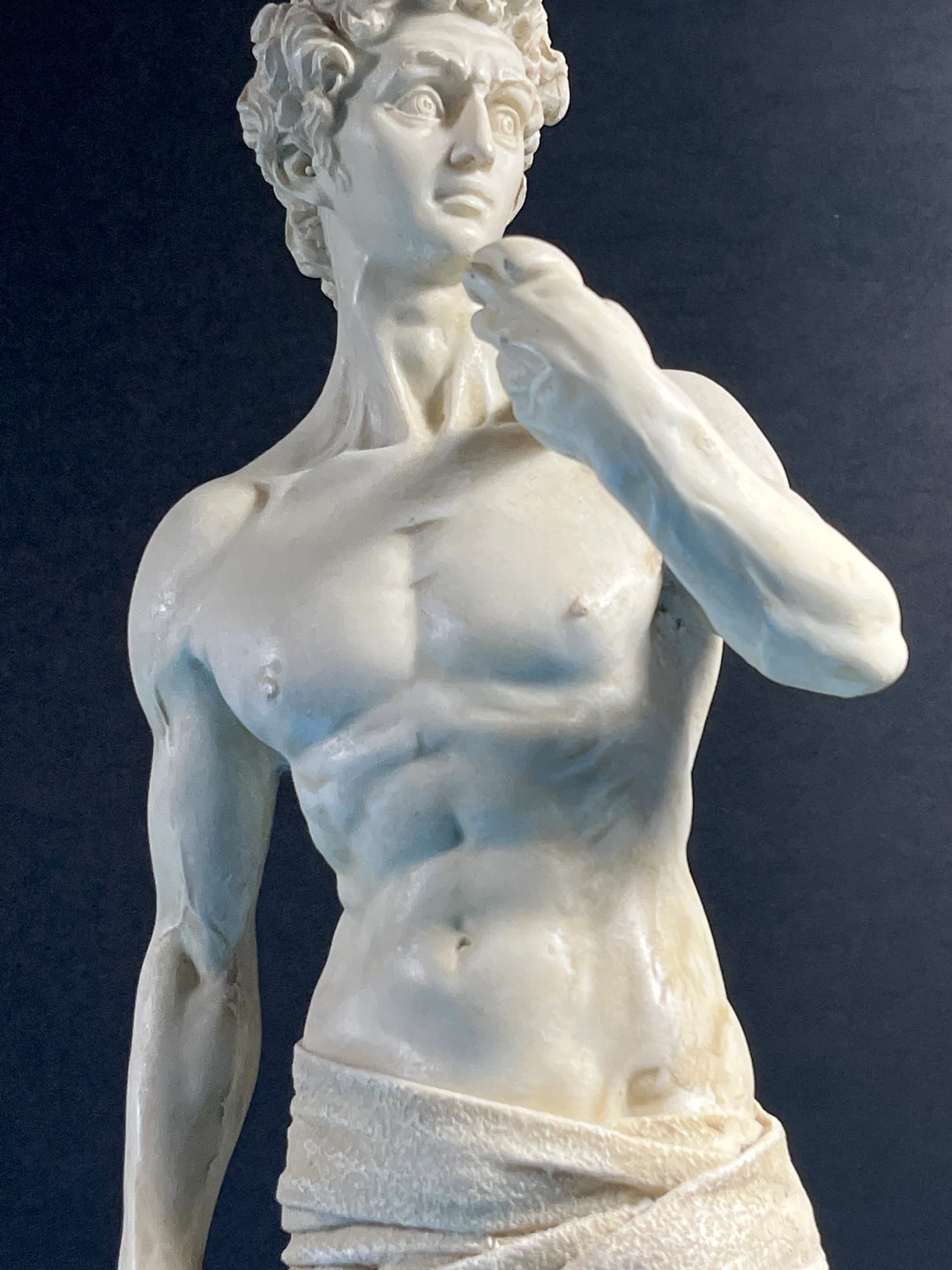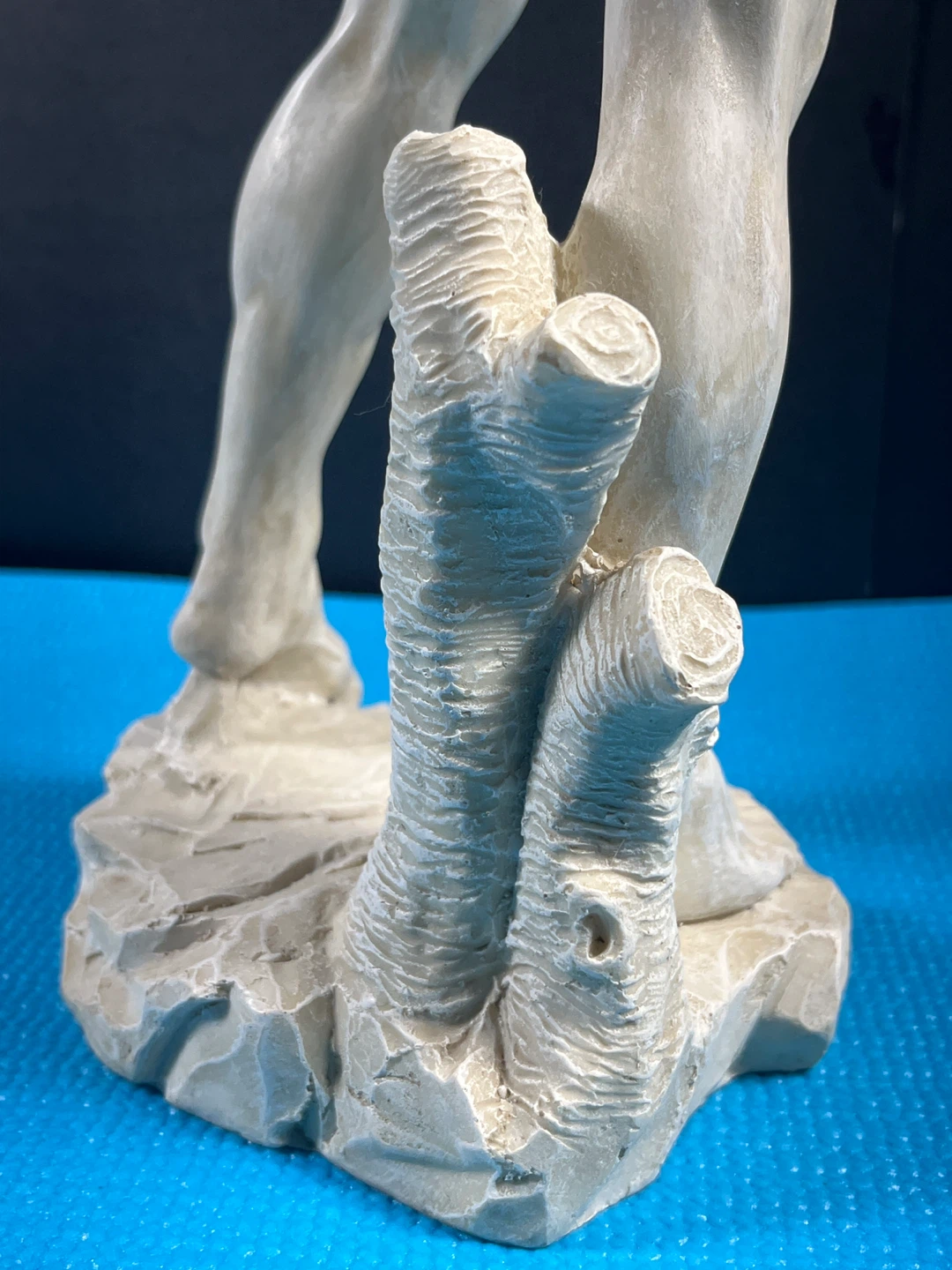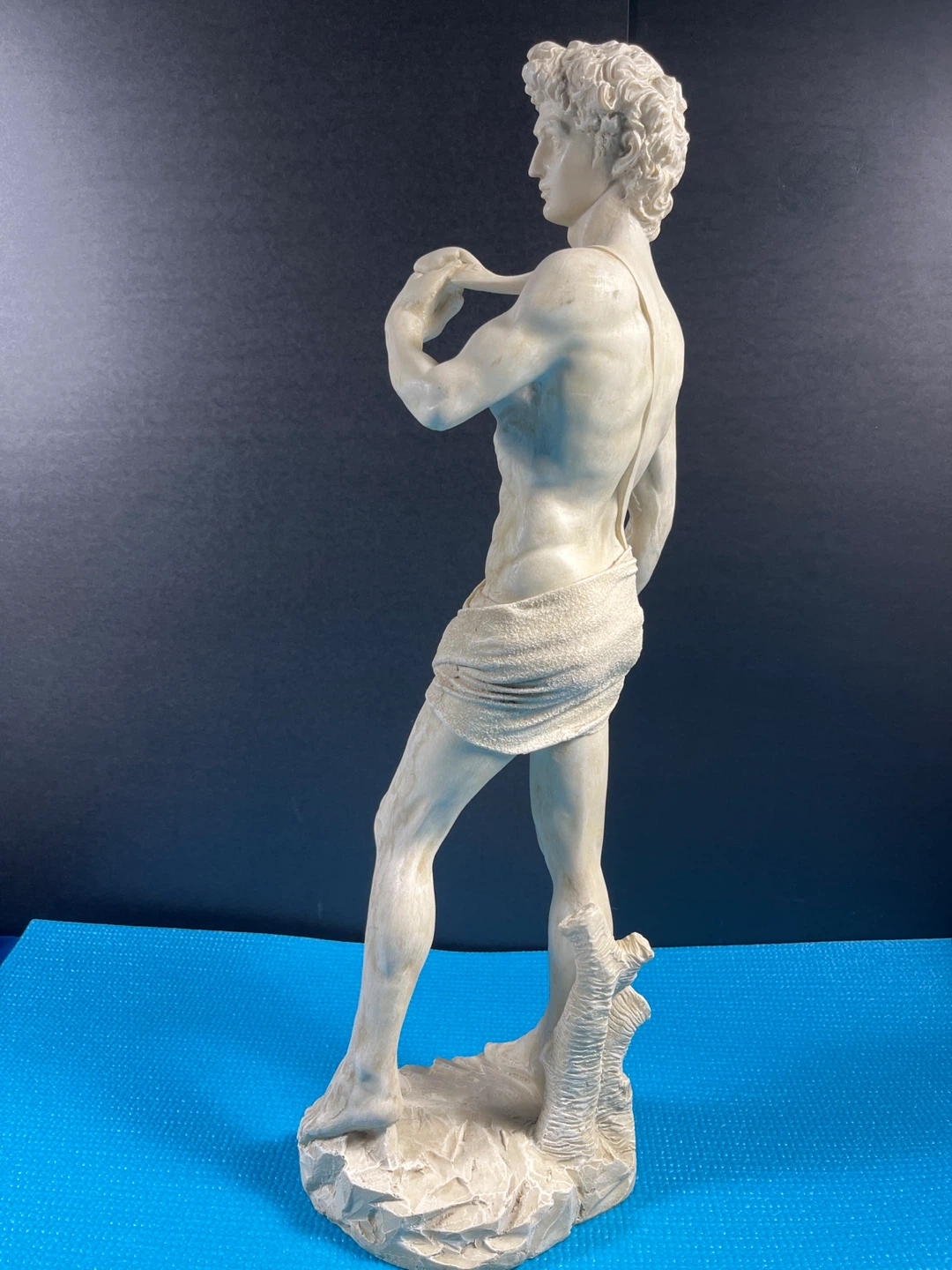 Add a touch of classical elegance to your home with this striking David Statue, standing at approximately 18 inches tall. This statue captures the iconic pose and intricate details of Michelangelo's masterpiece. Please note that this is a used item, though it remains in great shape, ready to be displayed and admired.