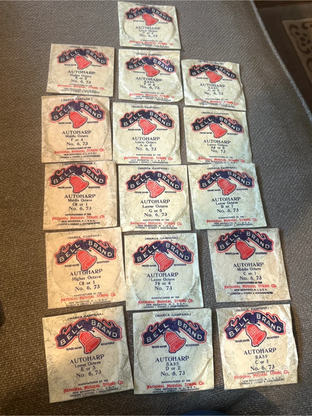 π₯ This is a collection of vintage Bell Brand Autoharp strings, model No. 73. The set includes various octaves and bass strings. Manufactured by the National Musical String Co. in the U.S.A. There are 16 strings in original unopened packs - from my parents long closed antiques shop