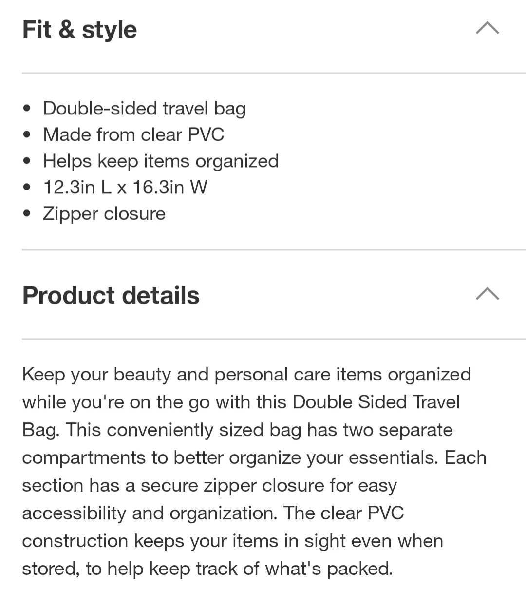 Keep your beauty and personal care items organized while you're on the go with this Double Sided Travel Bag! This conveniently sized bag has two separate compartments to better organize your essentials. Each section has a secure zipper closure for easy accessibility and organization. The clear PVC construction keeps your items in sight even when stored, to help keep track of what's packed. It's 12.3 inches long and 16.3 inches wide