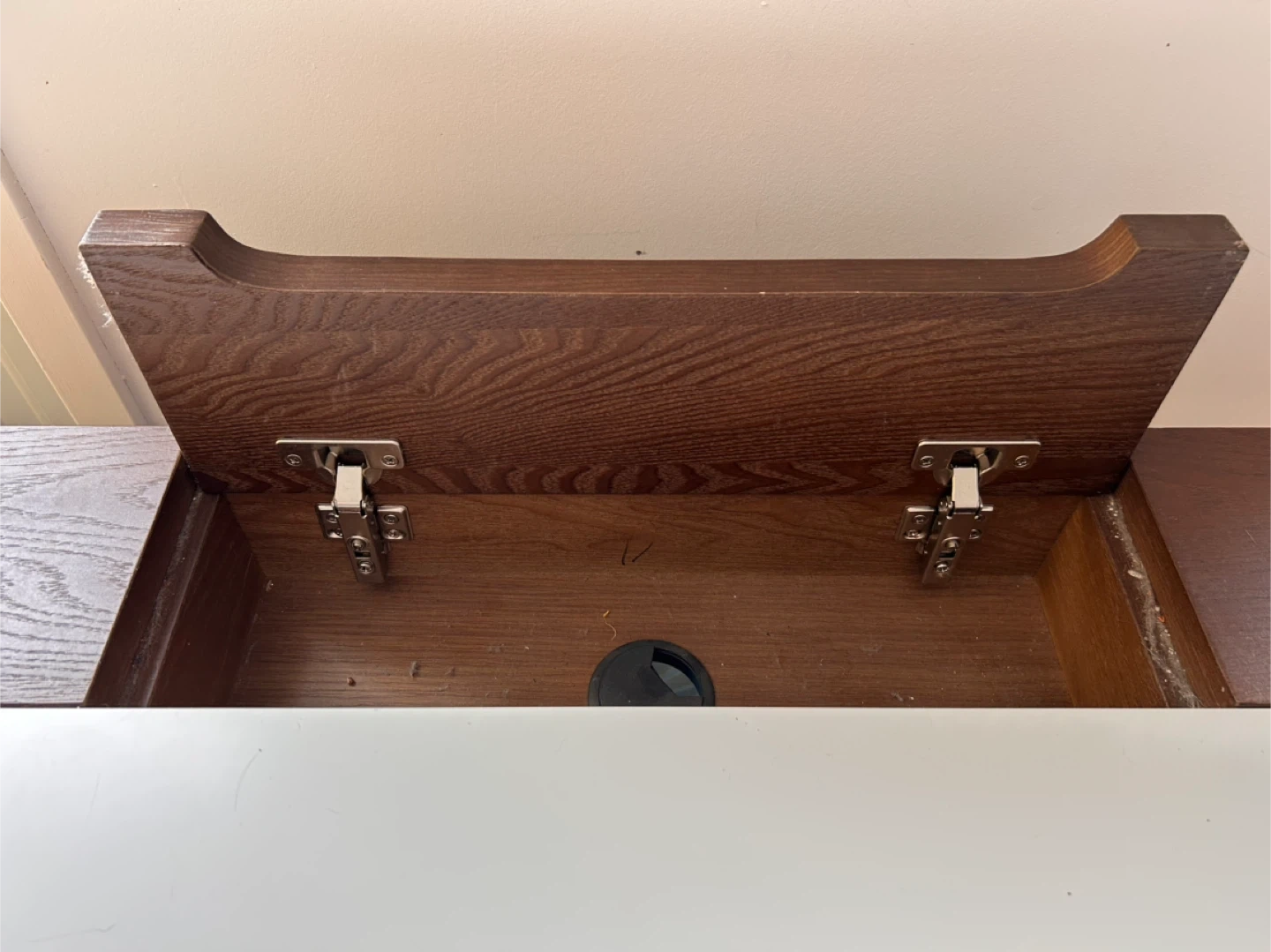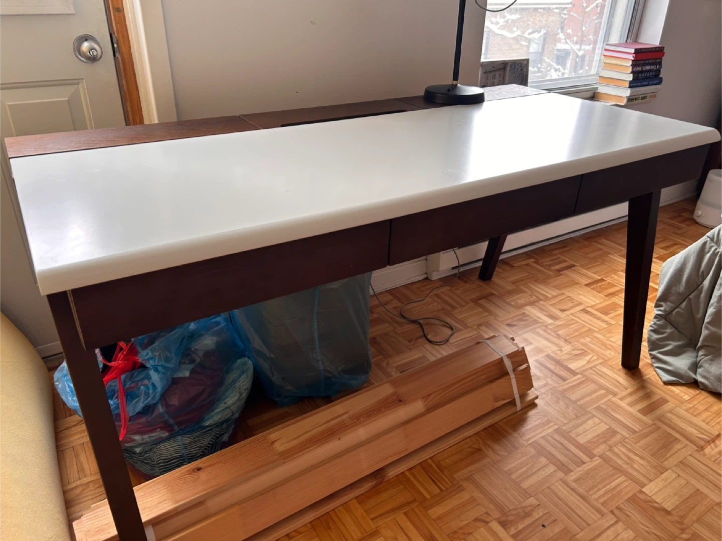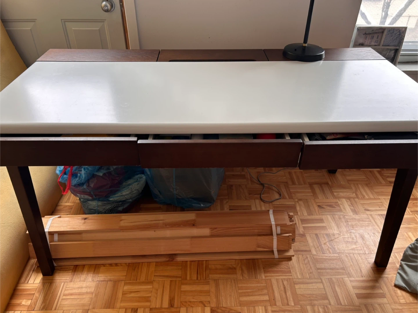 This desk features a dark wood frame with a contrasting white top. It has three drawers for storage and a lift-top section for hidden space and cable management hole included. Left side slightly damaged but functional overall.