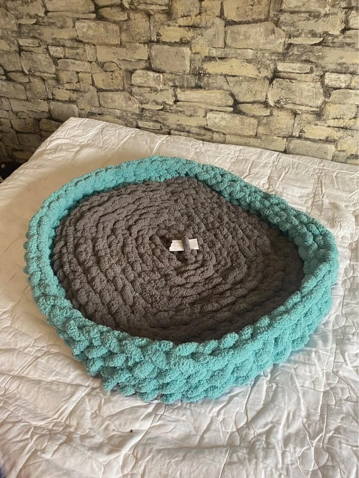 Cozy and stylish pet beds made from Bernat Blanket Big Yarn by Yarnspirations! Small (20 x 15) in black and orange for $35. Medium (20 x 25) in teal and gray for $55. Large (25 x 30) in purple and black for $75.