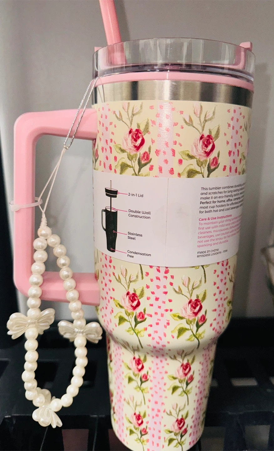 This tumbler combines durability and style with a pink floral design. It features double-wall construction and is condensation-free. This 40oz (1185 ml) tumbler is perfect for home, office, or travel.