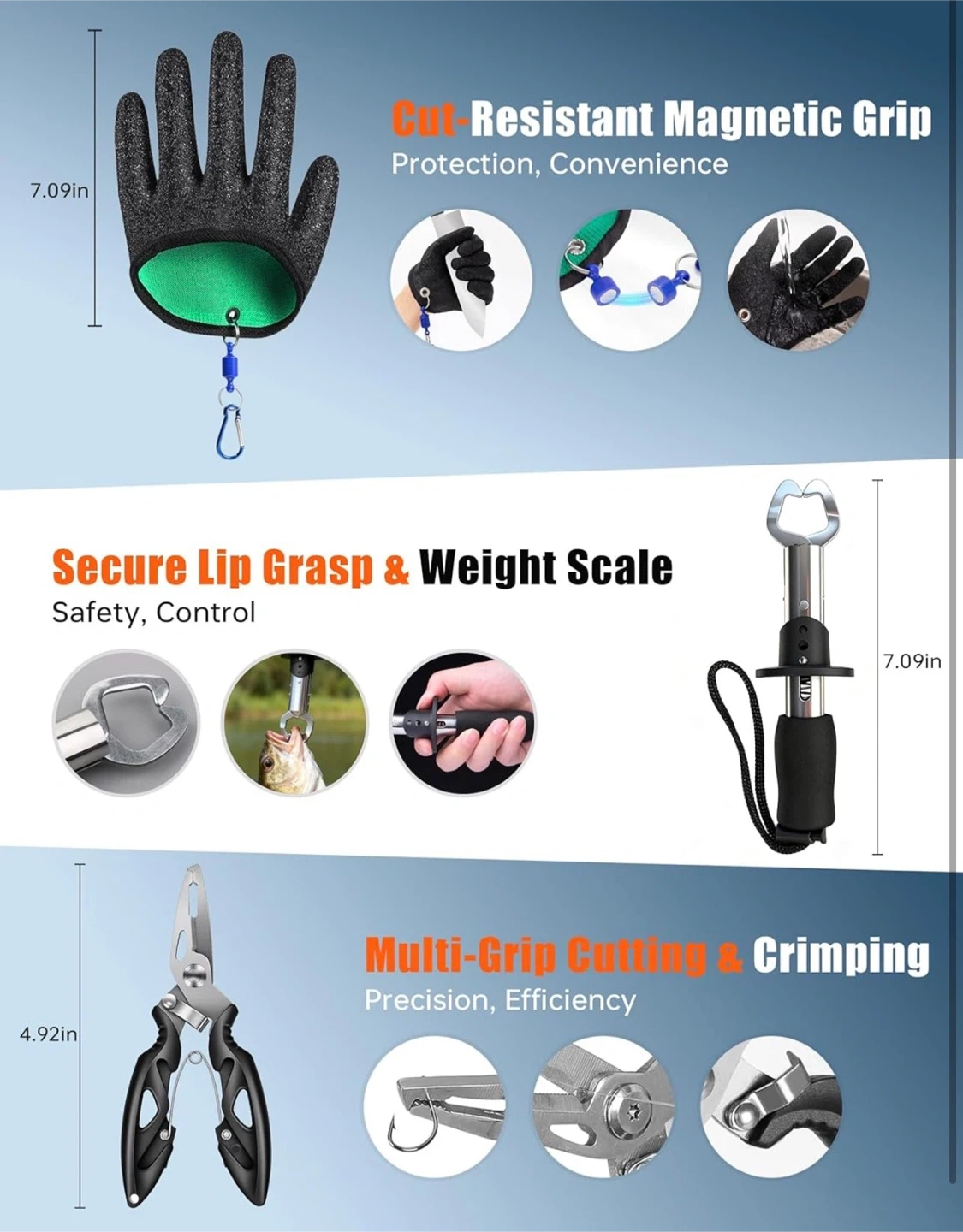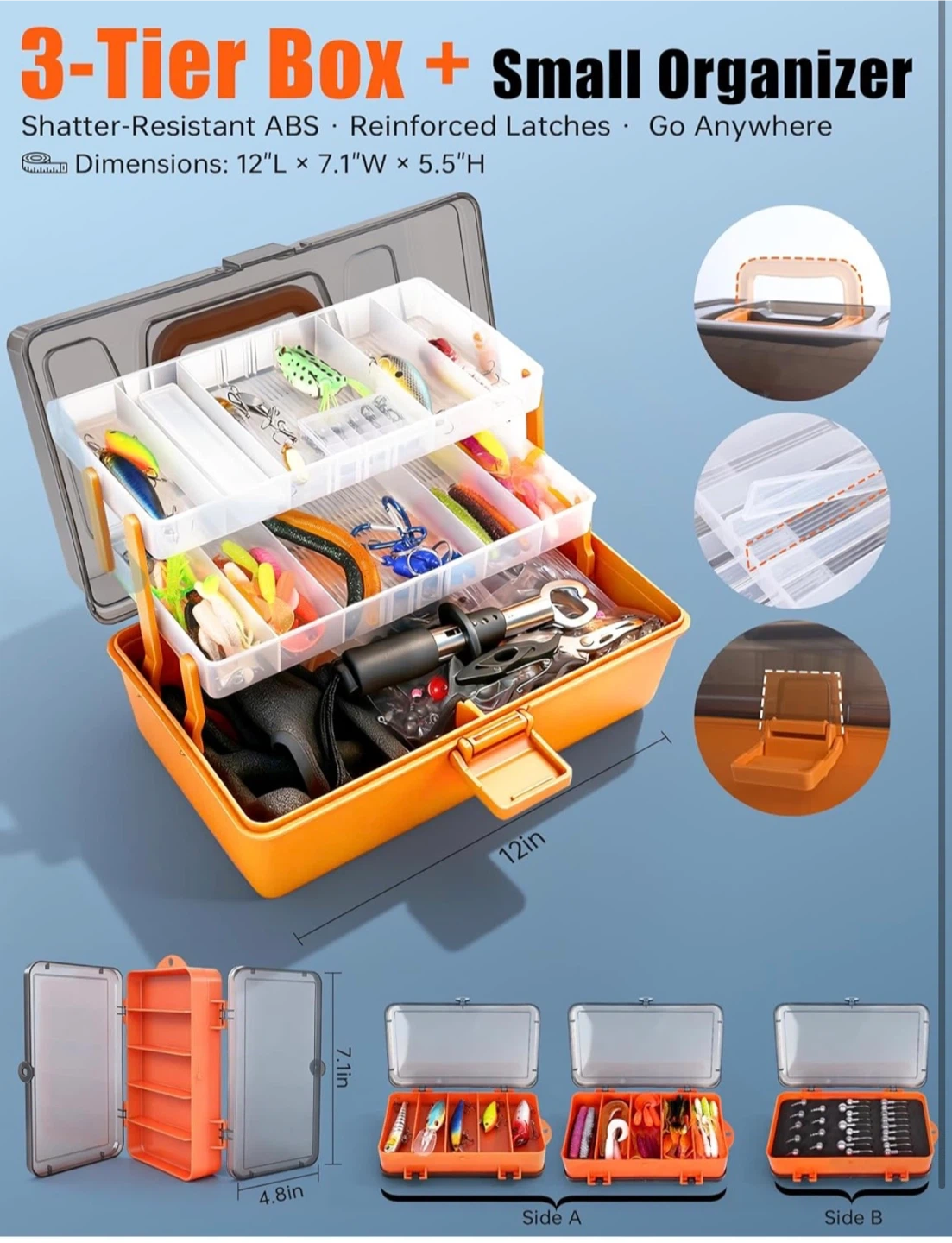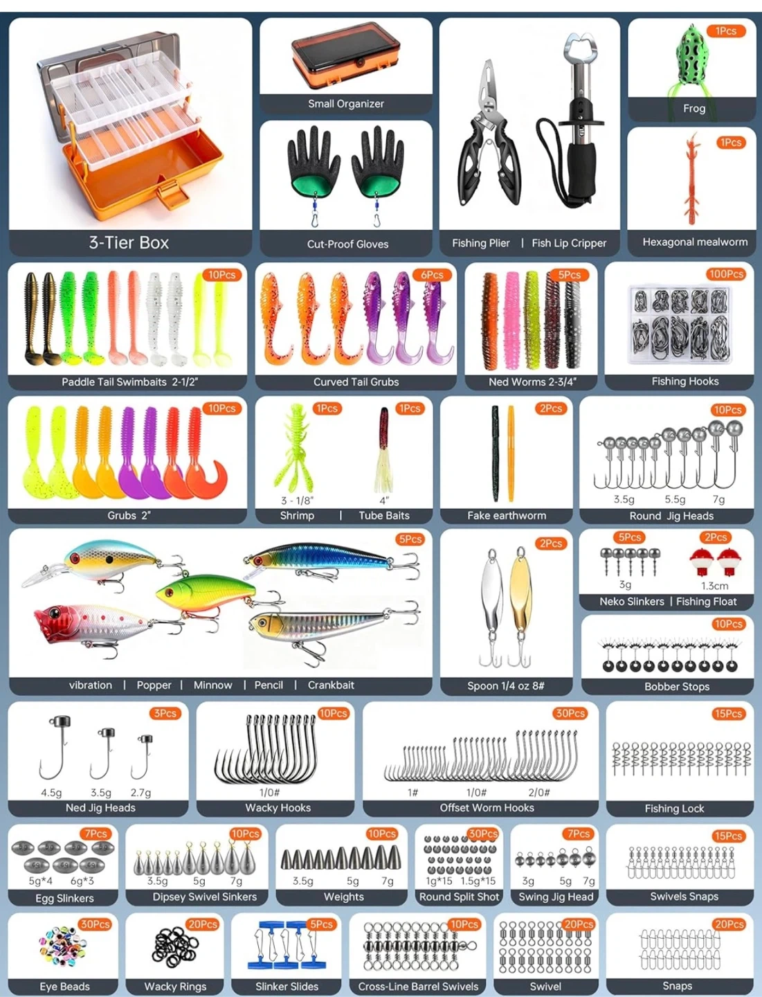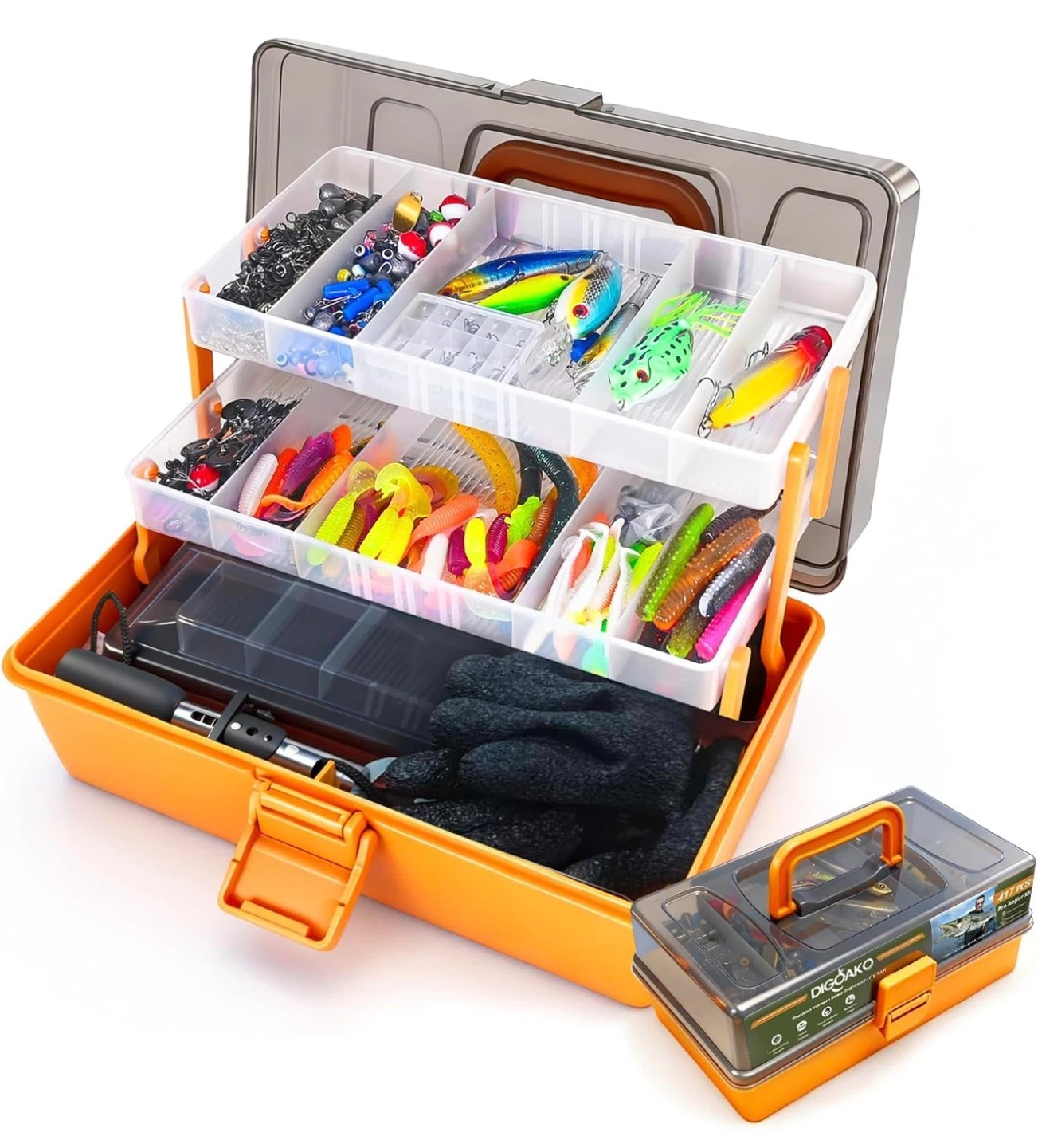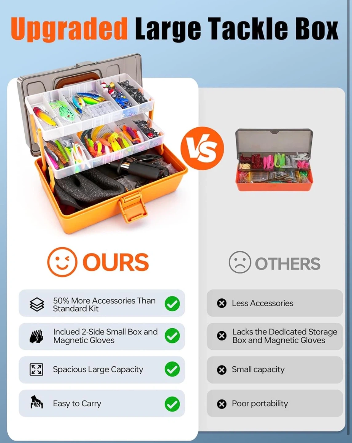 Large 3-Layer Fishing Tackle Box with Tackle Included, All-in-One 417 Pcs Fishing Lures Kit with Small 2-Sided Box & Gloves for Anglers, Complete Freshwater Bass Fishing Gear