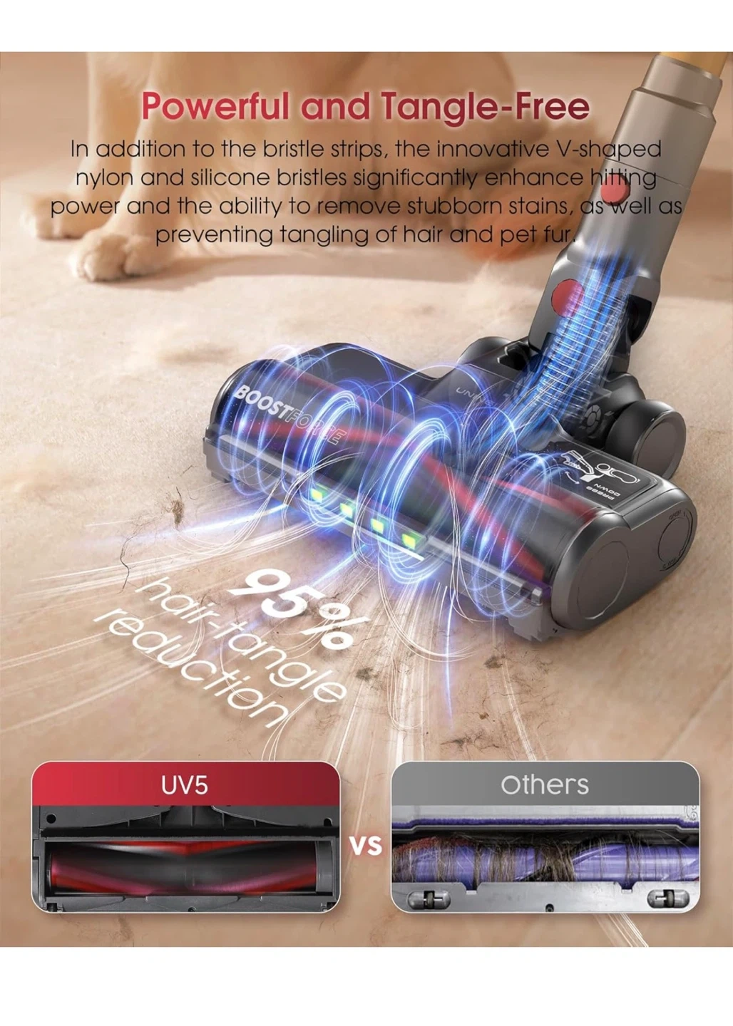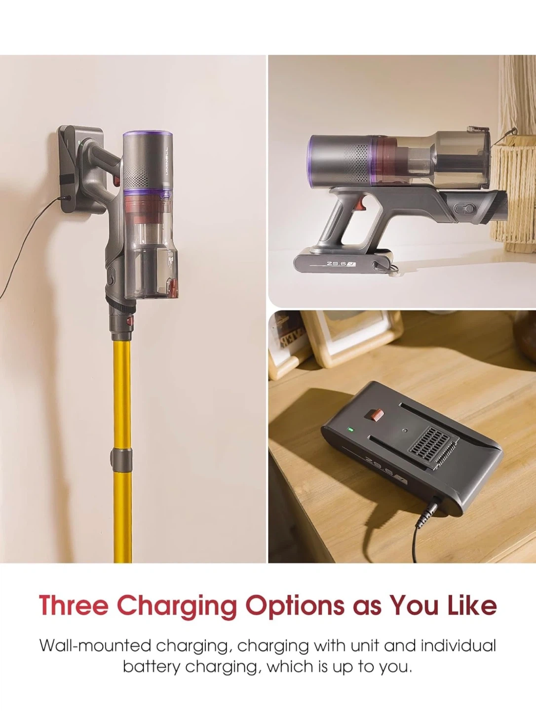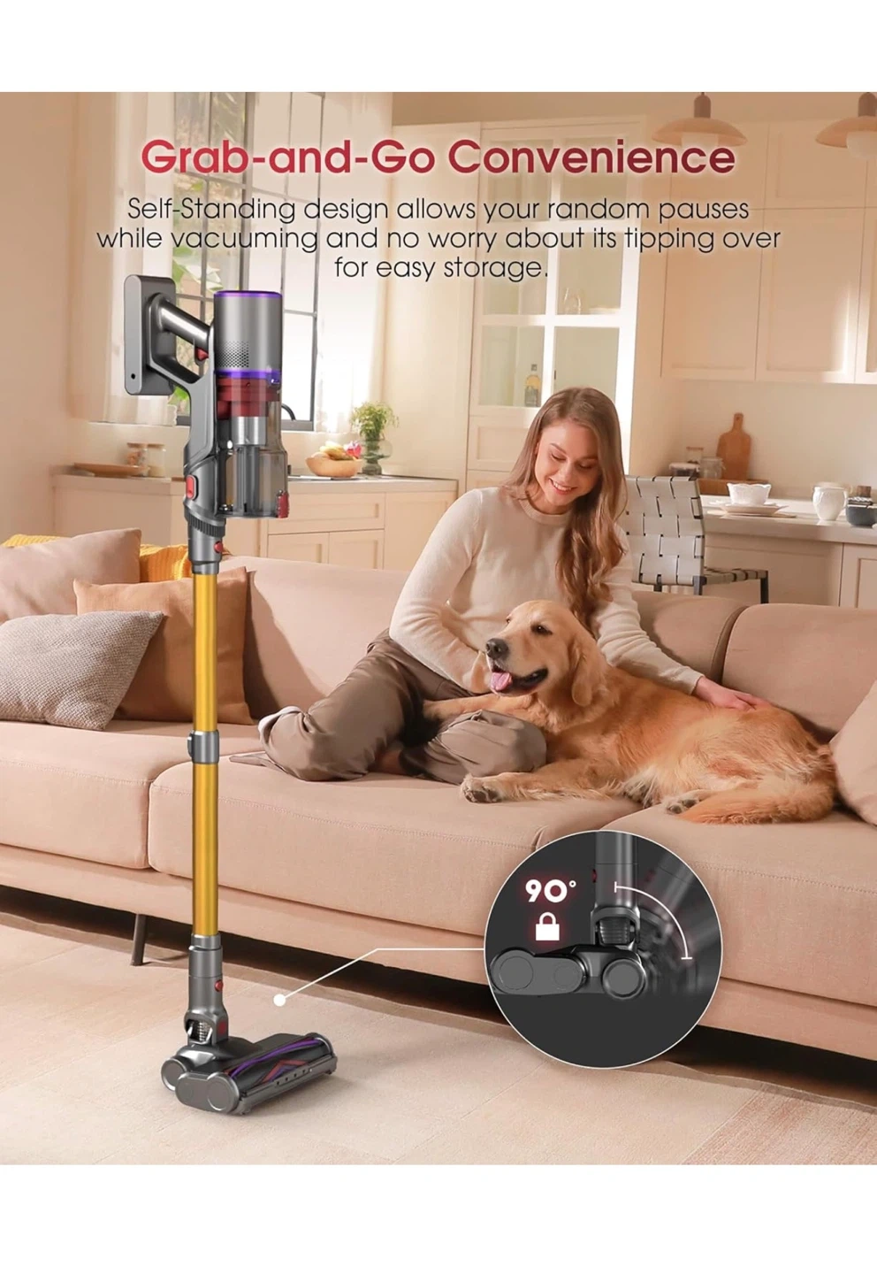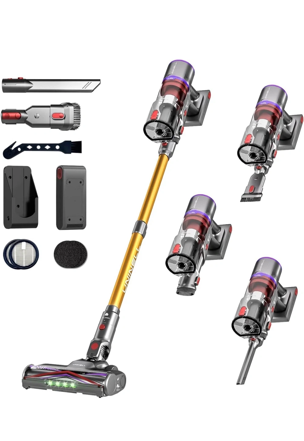 This cordless vacuum features up to 70 minutes of runtime on a single charge. It has 50000PA suction power and an all-in-one touchable LED display for modes and alerts. The design is tangle-free for efficient cleaning.