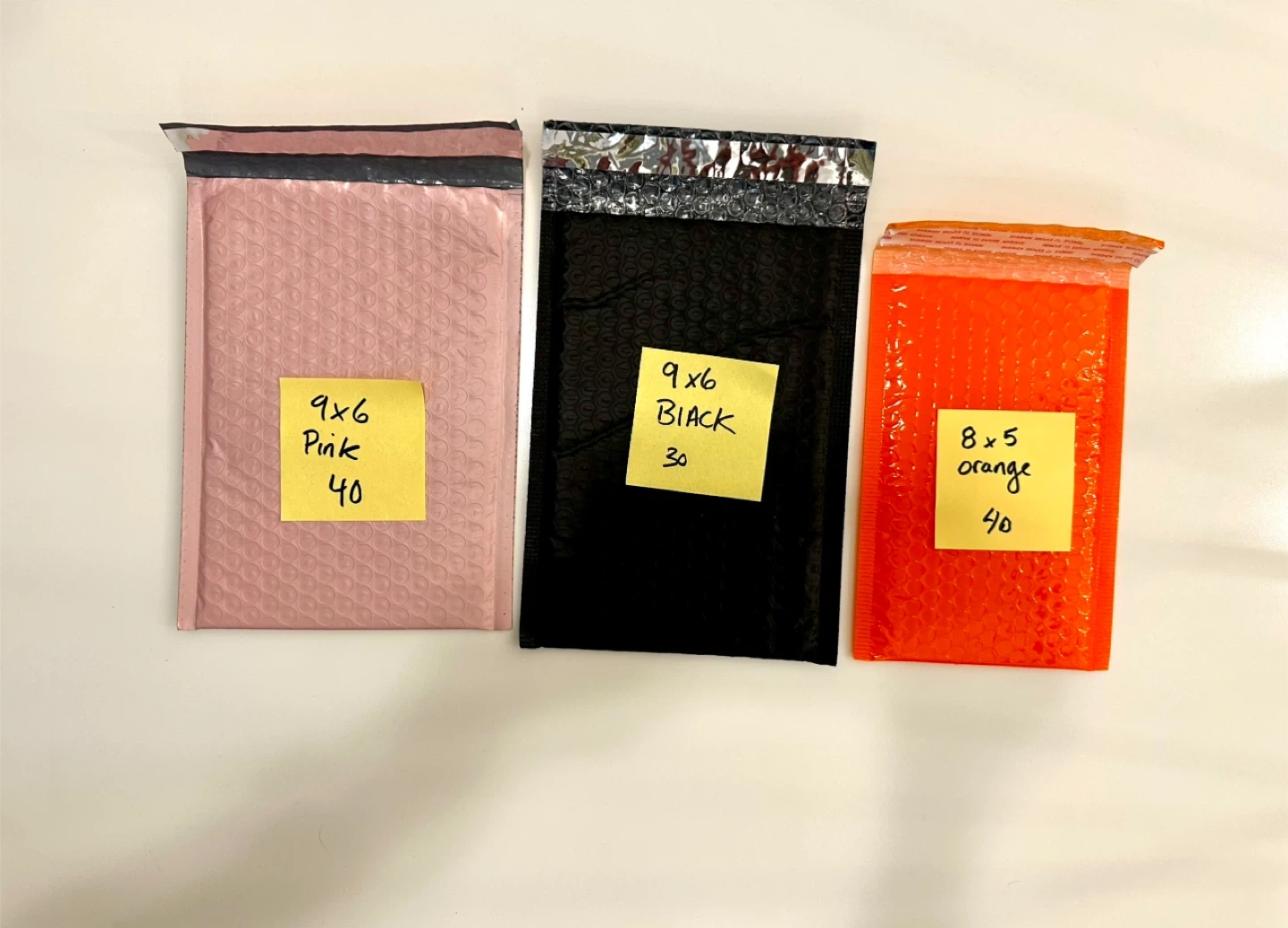 You get a lot of bubble mailers in different colours and sizes. Pink and black are 9x6 inches, with 40 pink and 30 black. The orange ones are 8x5 inches and there are 40 of them. They're great for shipping small items safely!