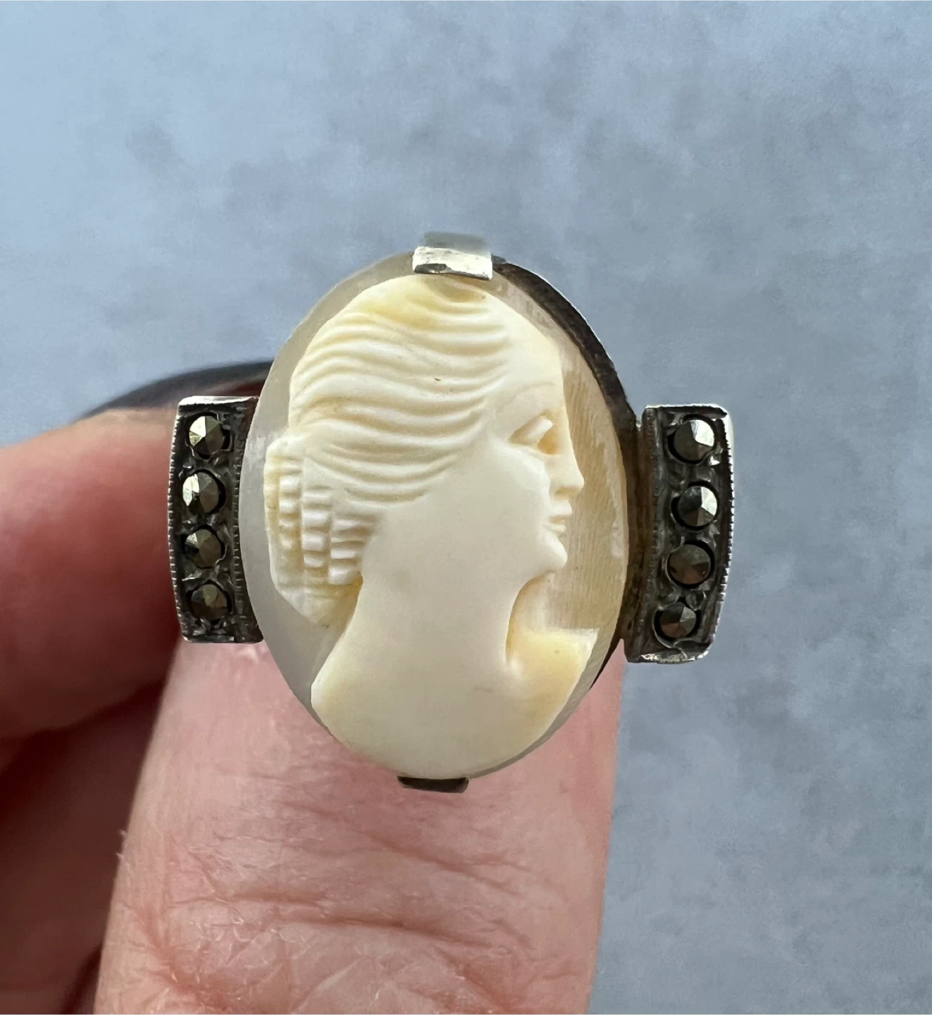 Vintage carved shell cameo ring with marcasite accents