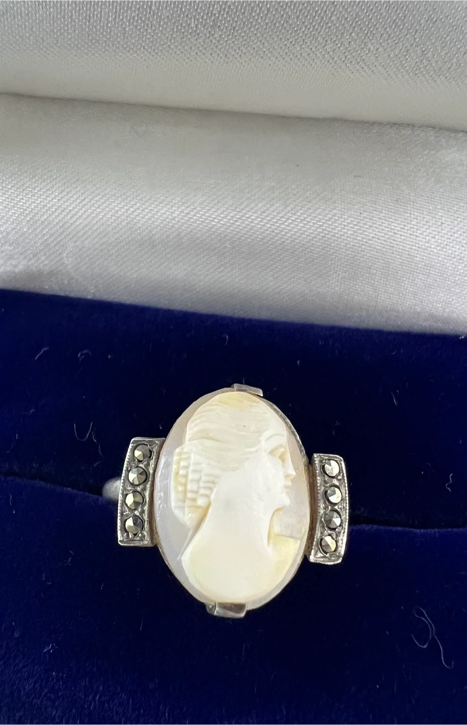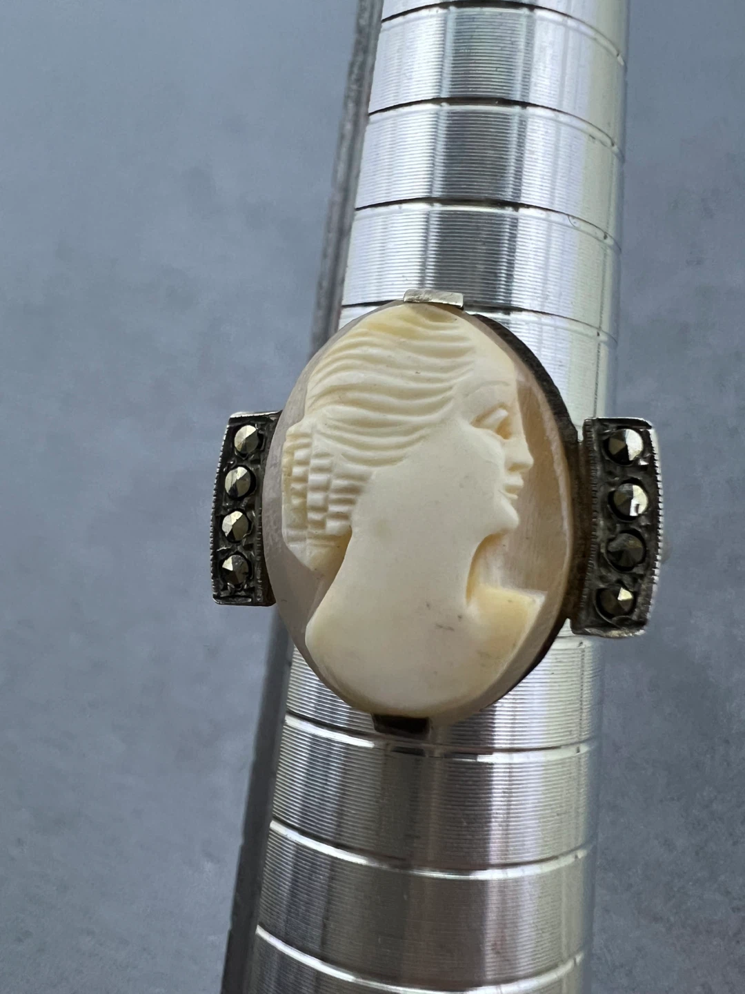 Vintage carved shell cameo ring with marcasite accents
