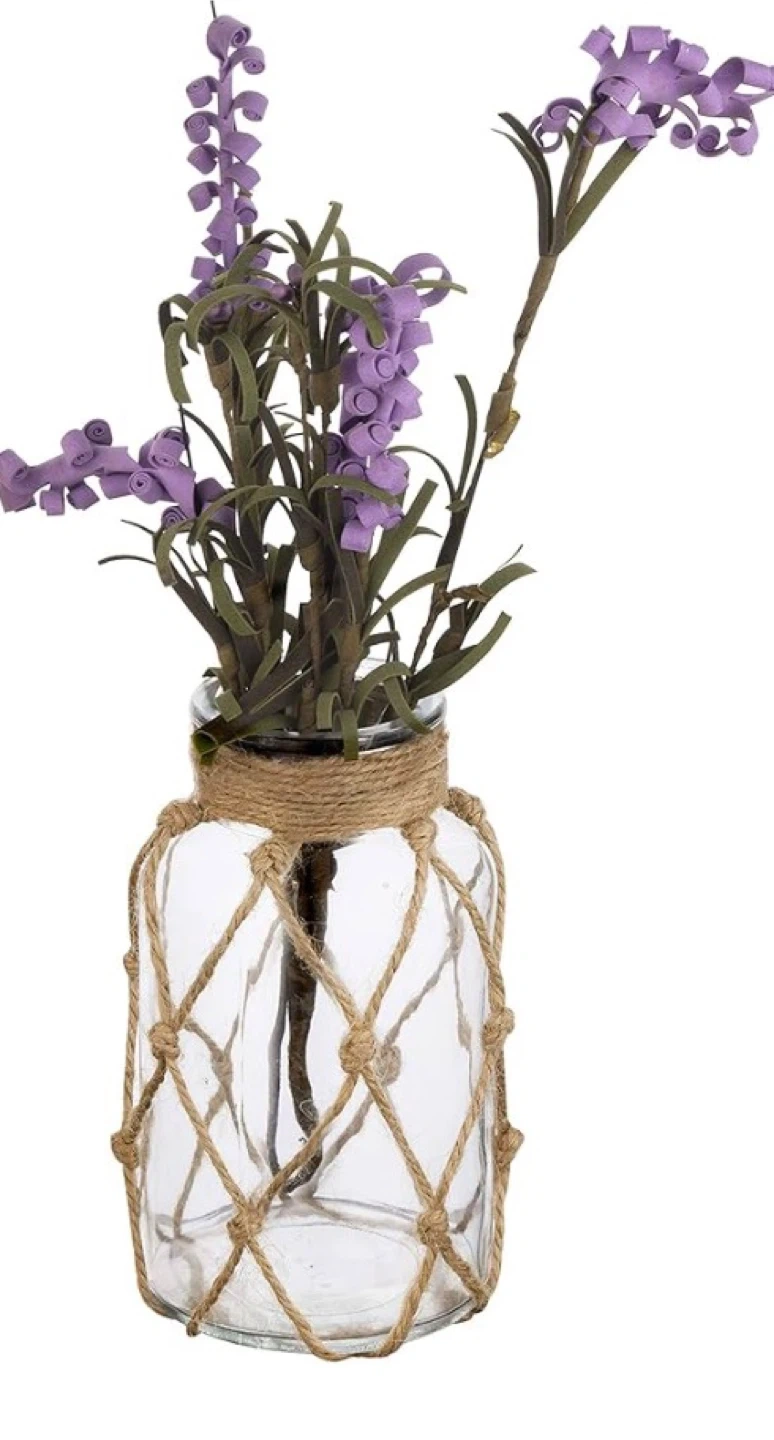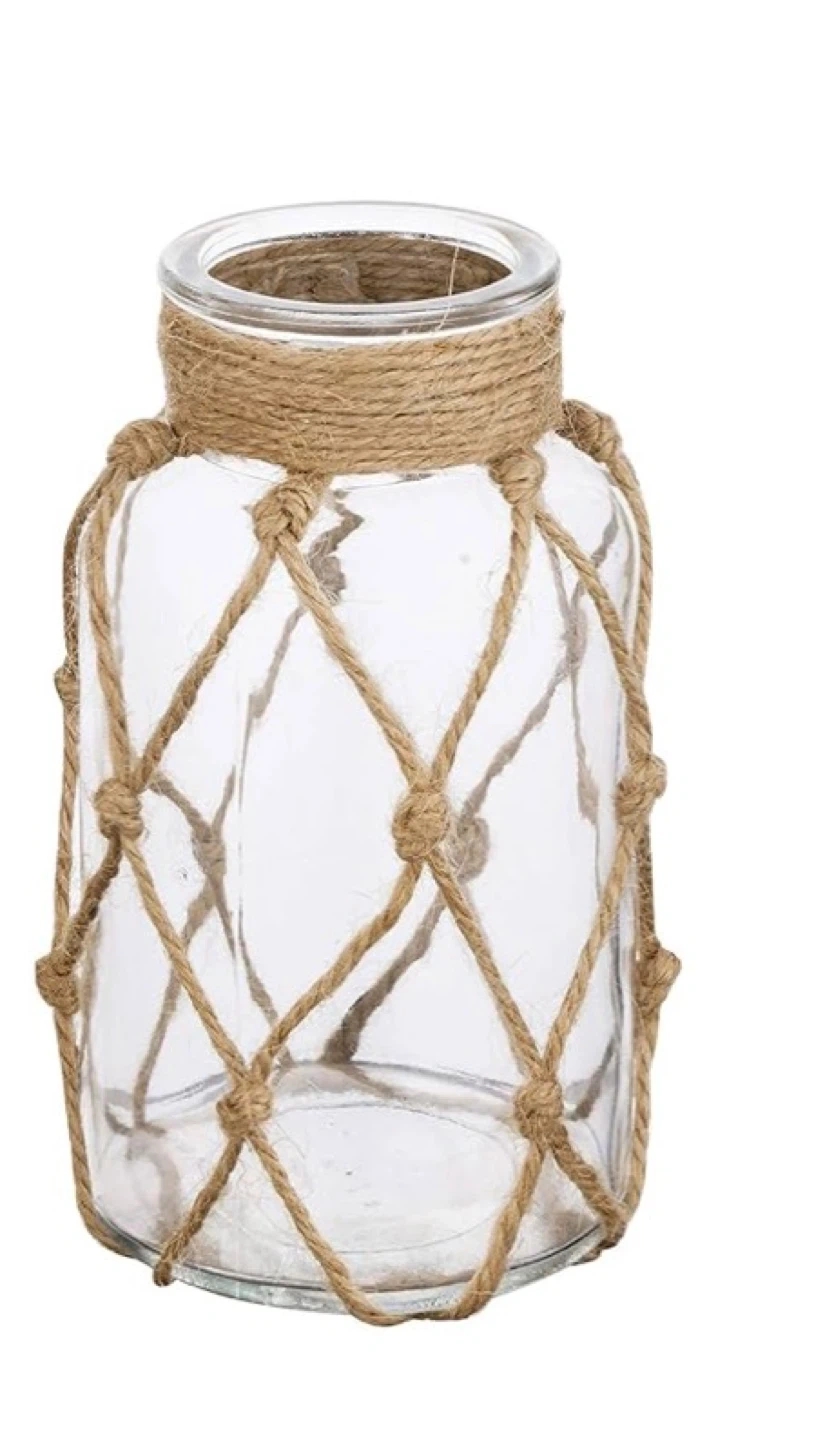 This decorative glass vase features a rustic jute netting wrap. It's perfect for displaying flowers or as a standalone piece. The clear glass allows the contents or the vase itself to be the focus.
