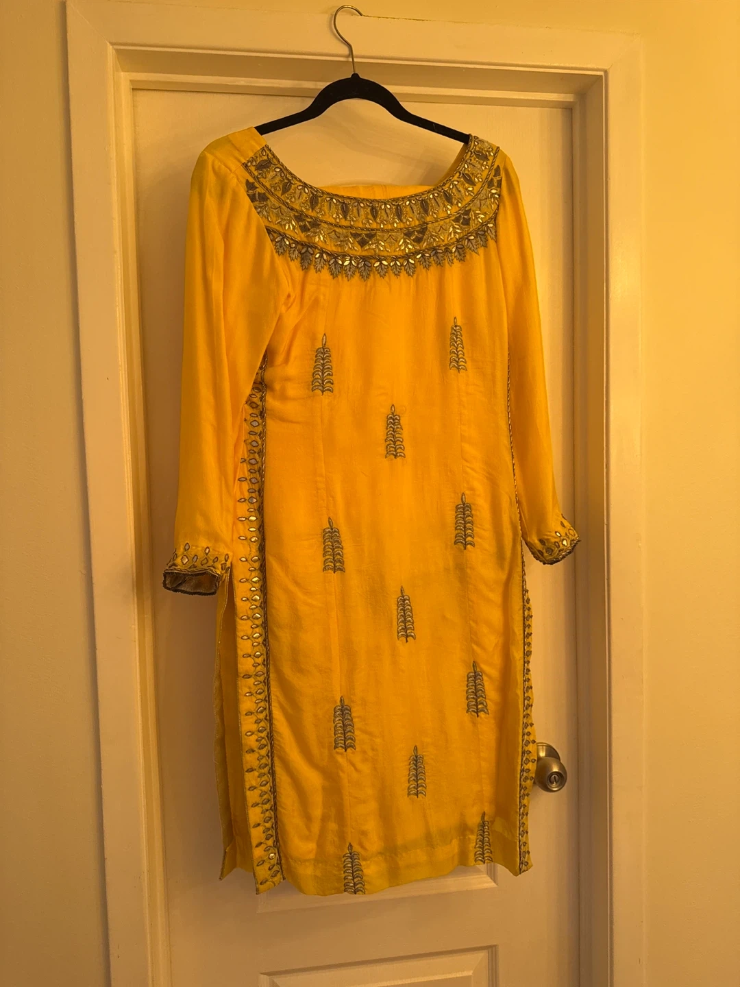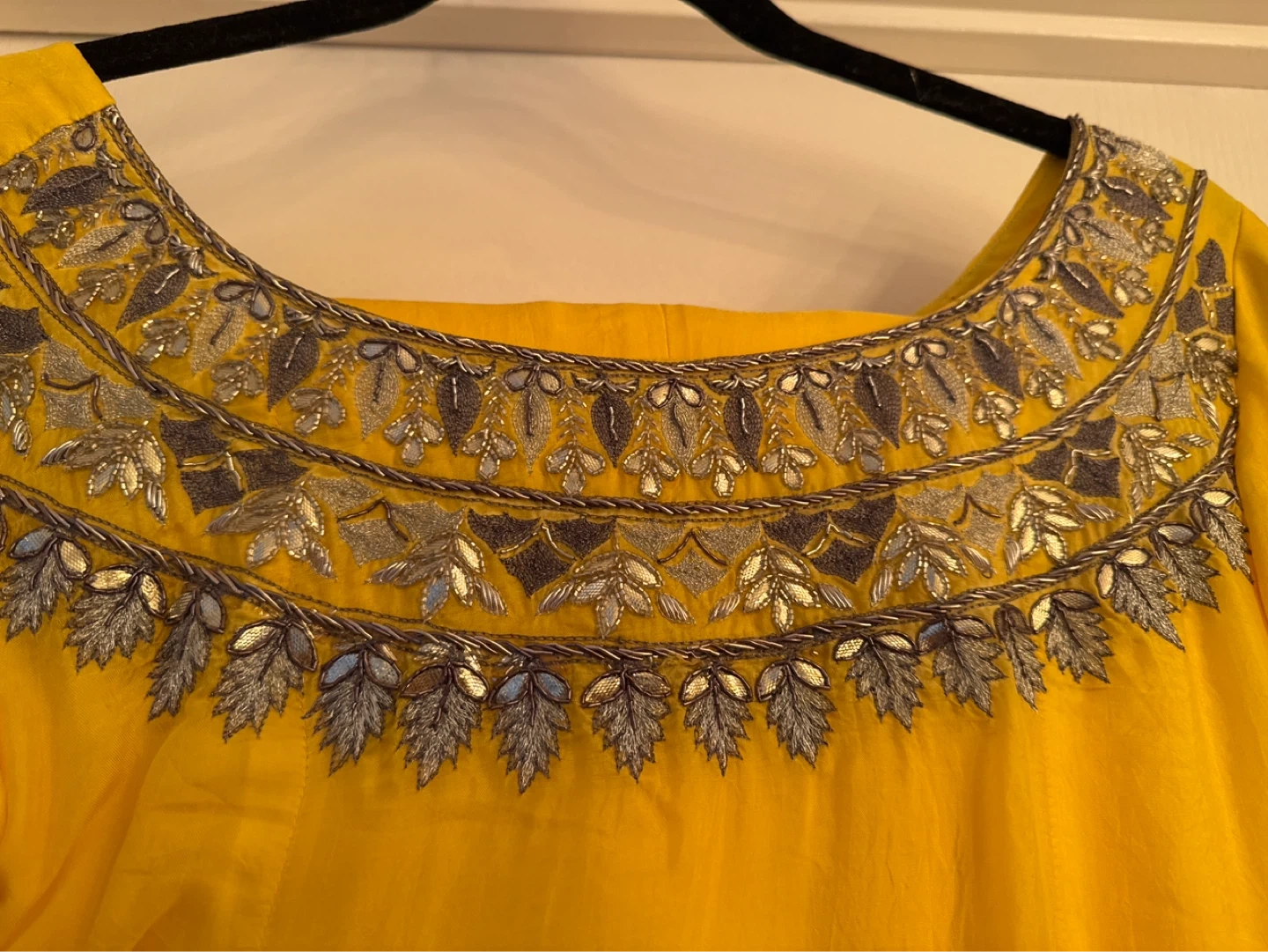 Bright yellow kurti with intricate silver and grey embroidery around the neckline and cuffs. Mirror work detailing along the sides and sleeves adds a festive touch. Perfect for cultural events or stylish everyday wear.