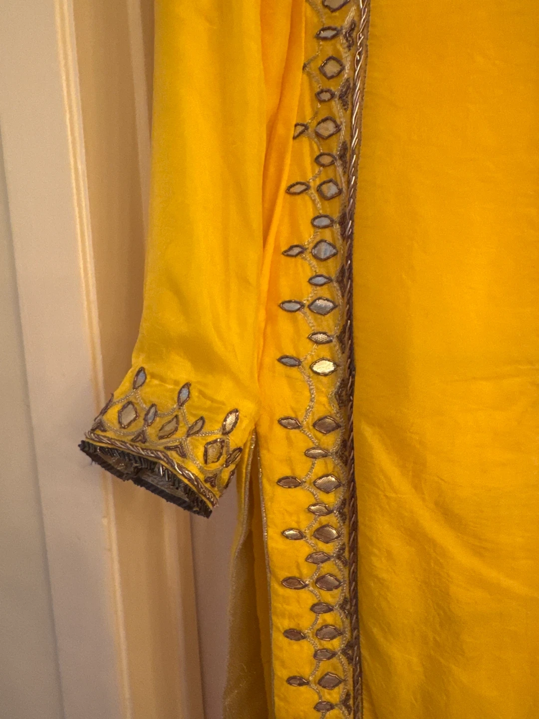 Bright yellow kurti with intricate silver and grey embroidery around the neckline and cuffs. Mirror work detailing along the sides and sleeves adds a festive touch. Perfect for cultural events or stylish everyday wear.