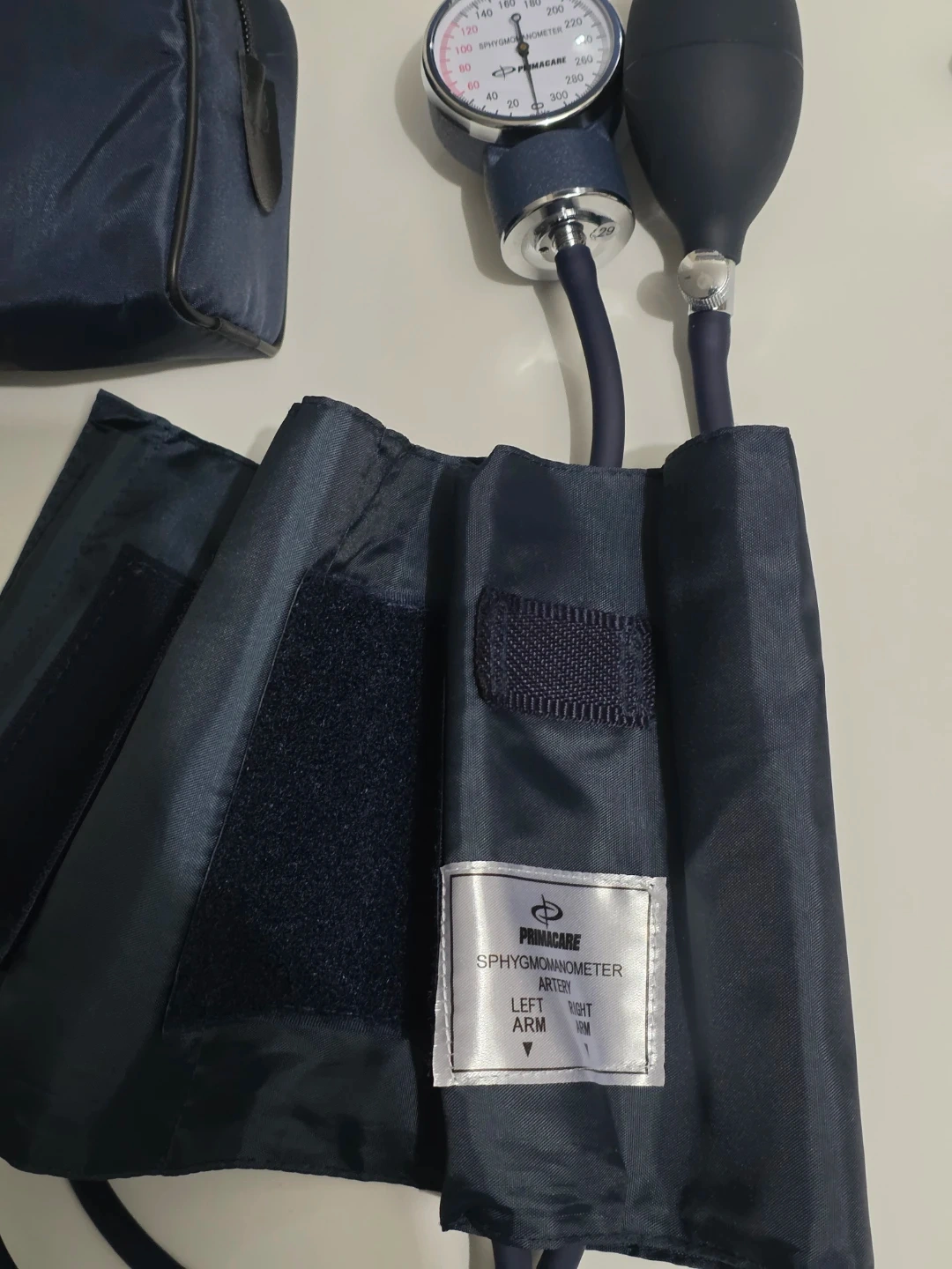 This is a Primacare adult size sphygmomanometer and stethoscope set. It includes a dark blue cuff, gauge, bulb, and stethoscope tubing with earpieces. A matching dark blue carrying bag is also included for easy transport.