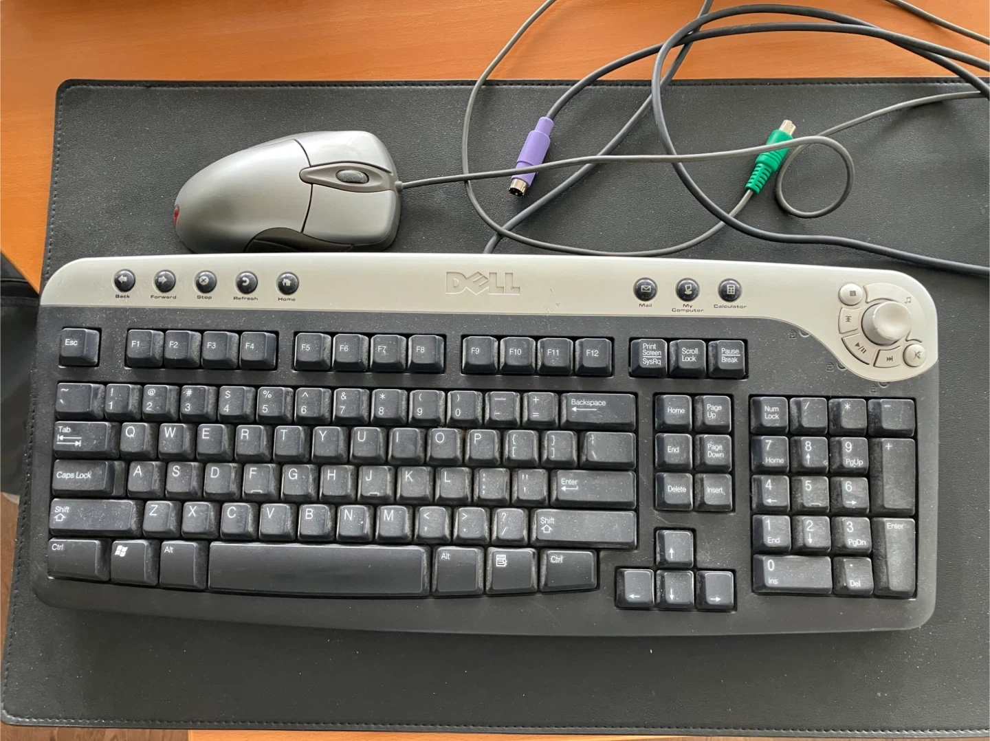 This is a Dell wired keyboard and mouse set with PS/2 connectors. The keyboard has multimedia buttons and a standard QWERTY layout. It's a reliable combo for desktop computers.