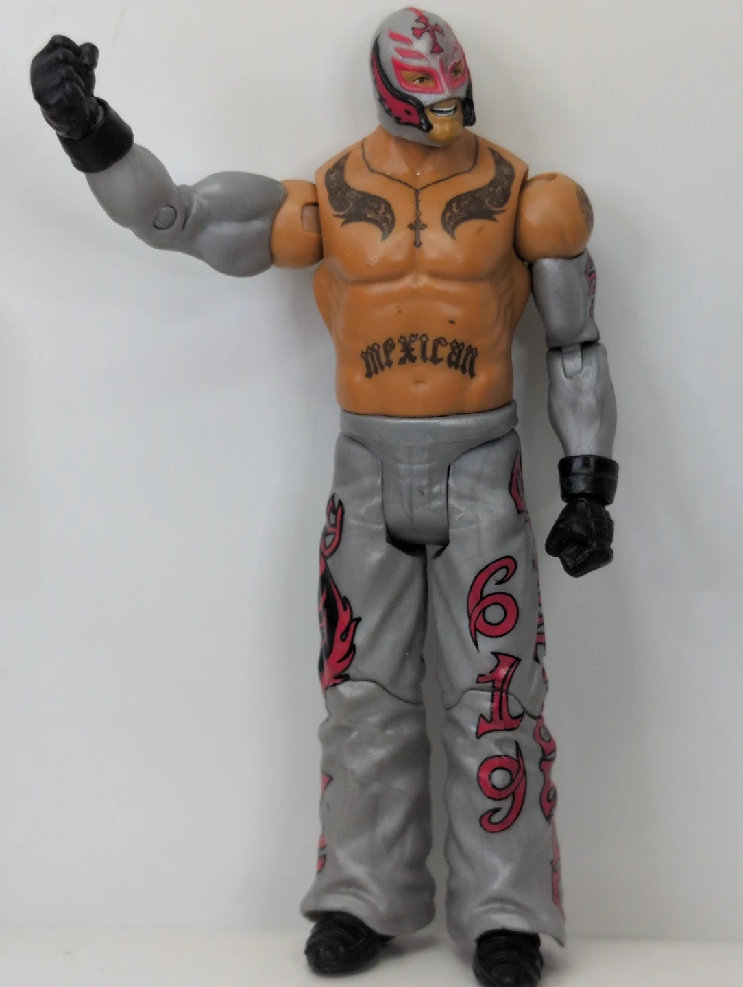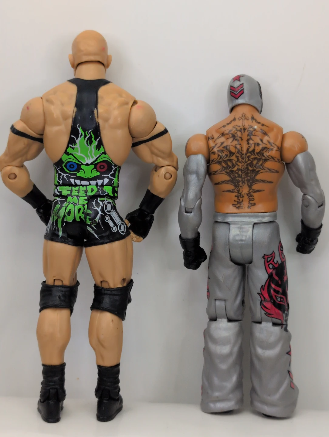 Two WWE action figures, one resembling Rey Mysterio and the other "Stone Cold" Steve Austin. They're articulated and ready for display or play. These figures capture the iconic looks of the wrestlers. (We offer Canada Post shipping) All item are clean and plastic wrap before shipping or pickup.