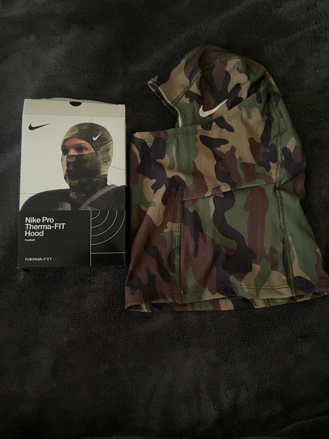 Nike Pro Therma-FIT hood in a camouflage pattern. It's designed for football and features HyperWarm technology. Made in Thailand, one size fits most.