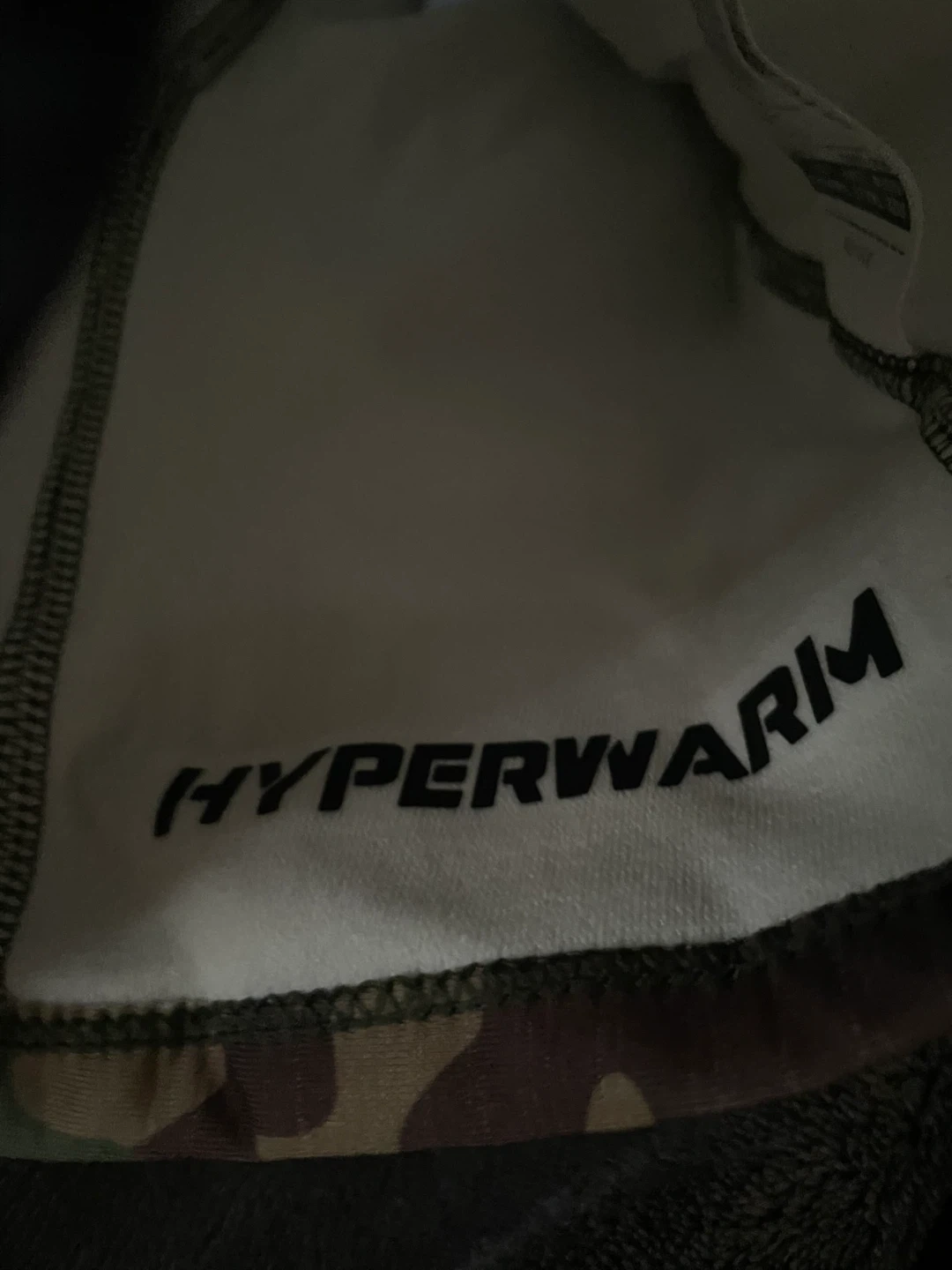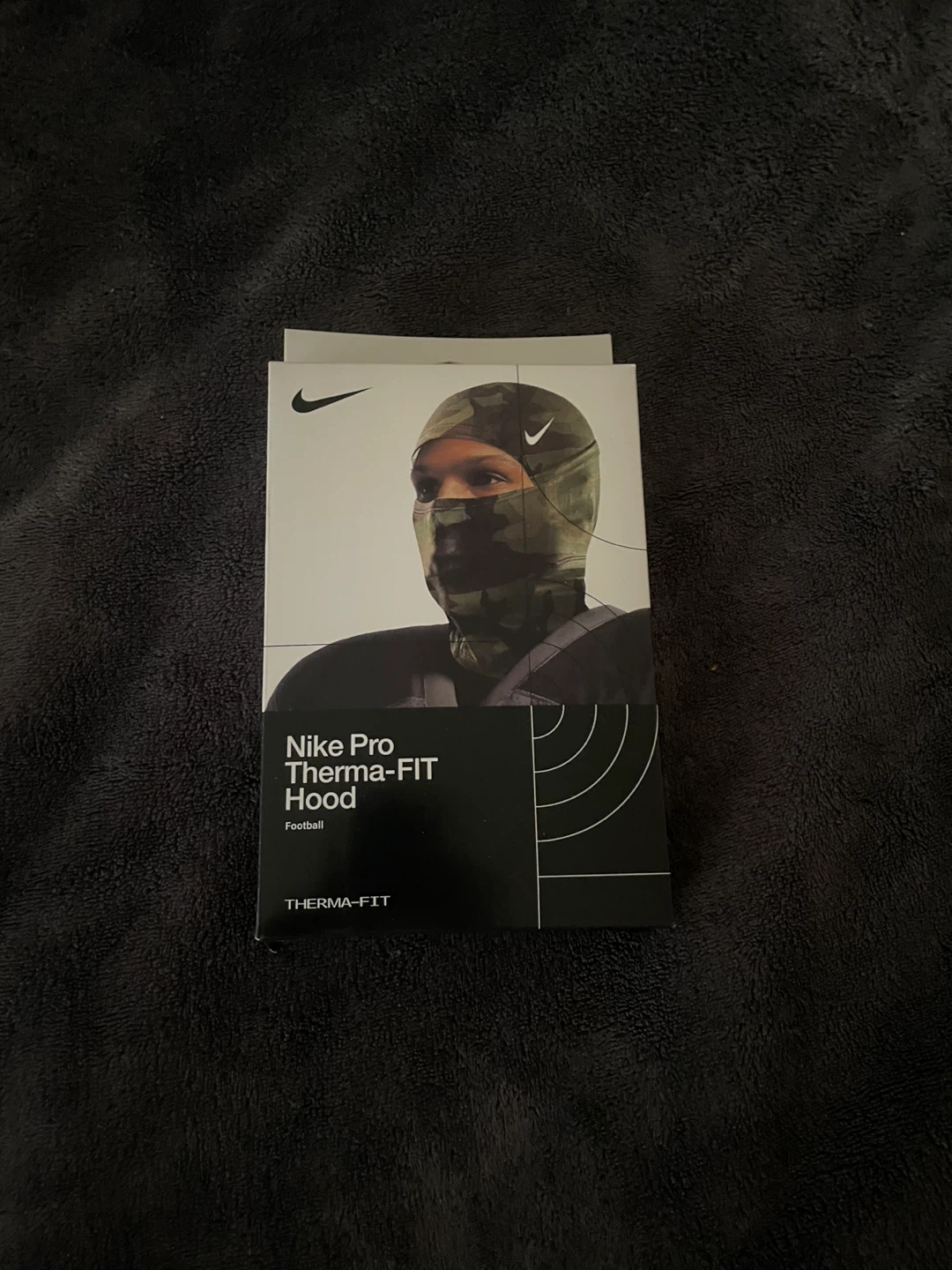Nike Pro Therma-FIT hood in a camouflage pattern. It's designed for football and features HyperWarm technology. Made in Thailand, one size fits most.