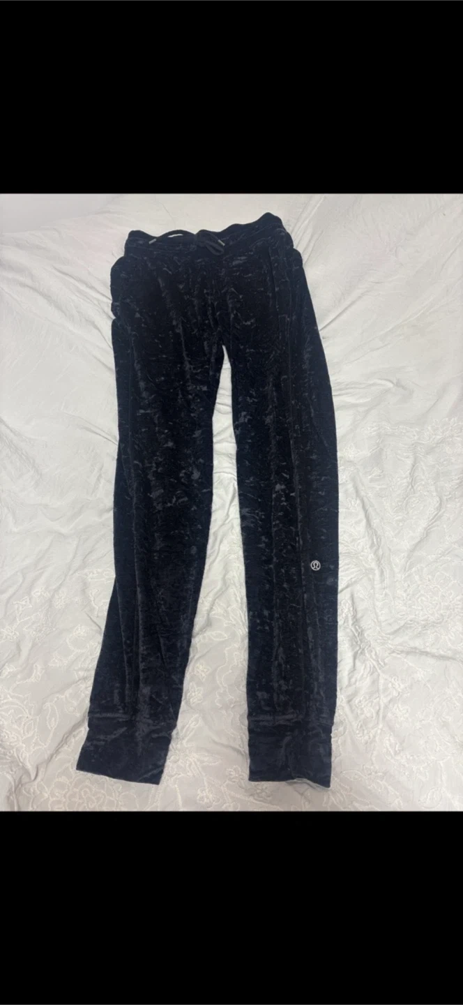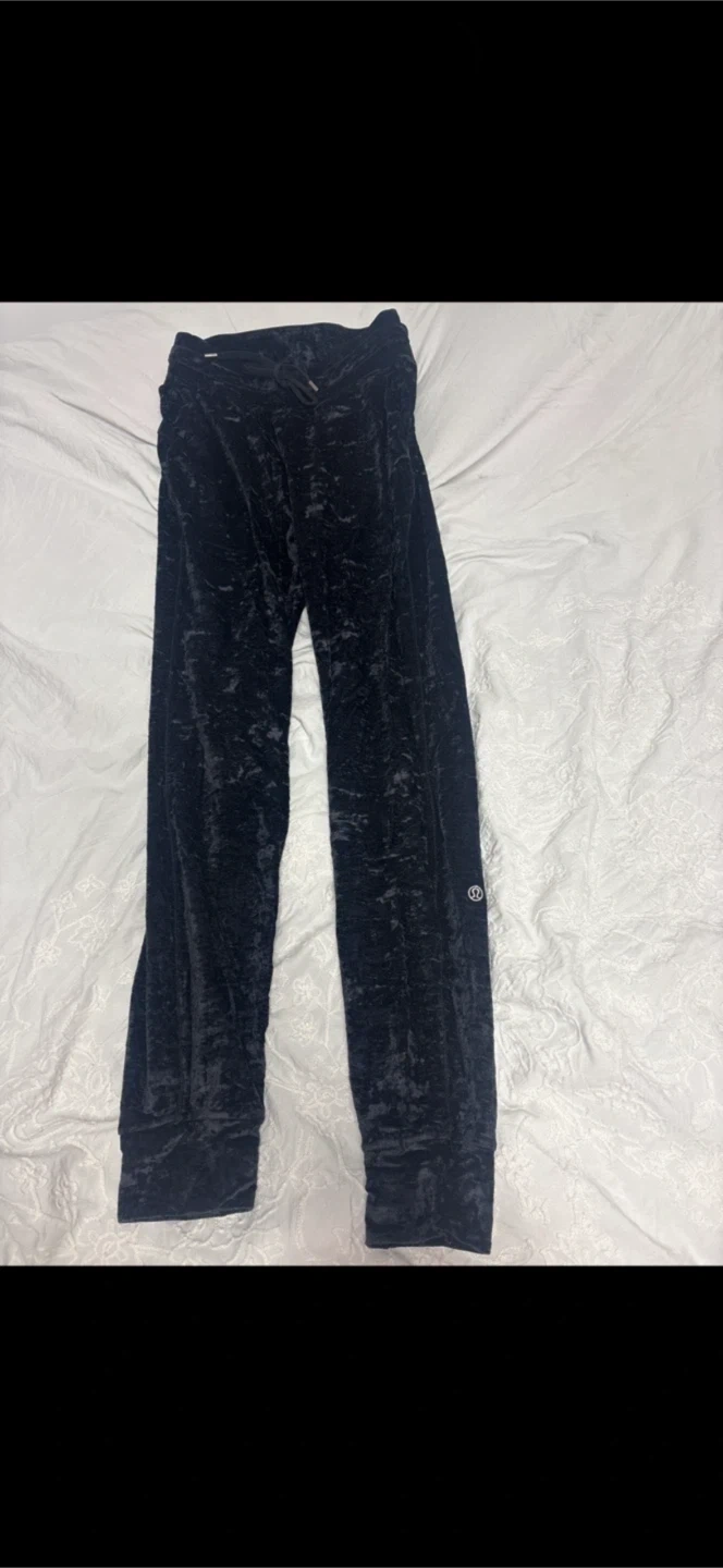 Black Lululemon crushed velvet track pants with a small logo detail. Also includes a light pink zip-up jacket with a floral print. Perfect for athleisure wear! 30 each pick up cash only
