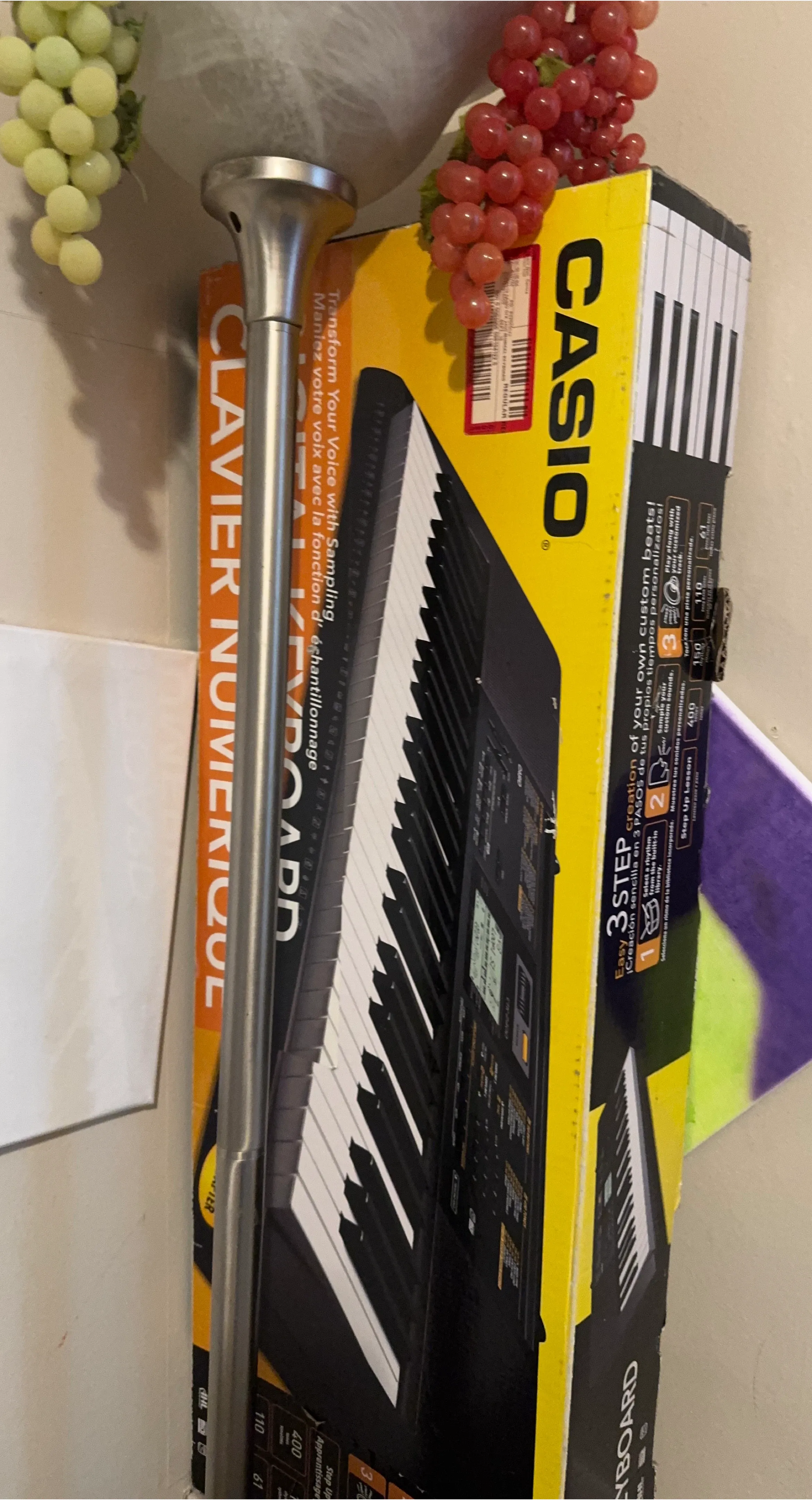 Casio keyboard in original packaging. Transform your voice with sampling and create your own custom beats. It has 61 keys and comes with step-up lessons.