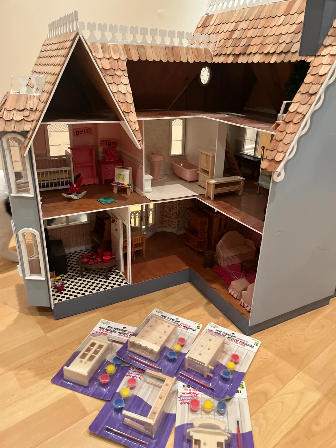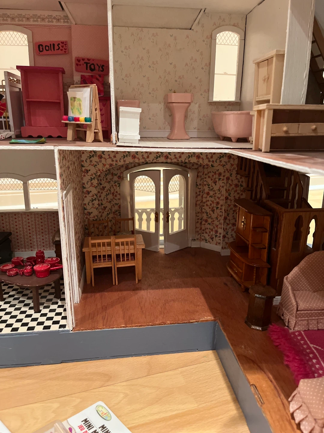 Selling a dollhouse with lots of miniature furniture! It's in great shape and ready for a new owner. Includes various rooms and accessories for imaginative play