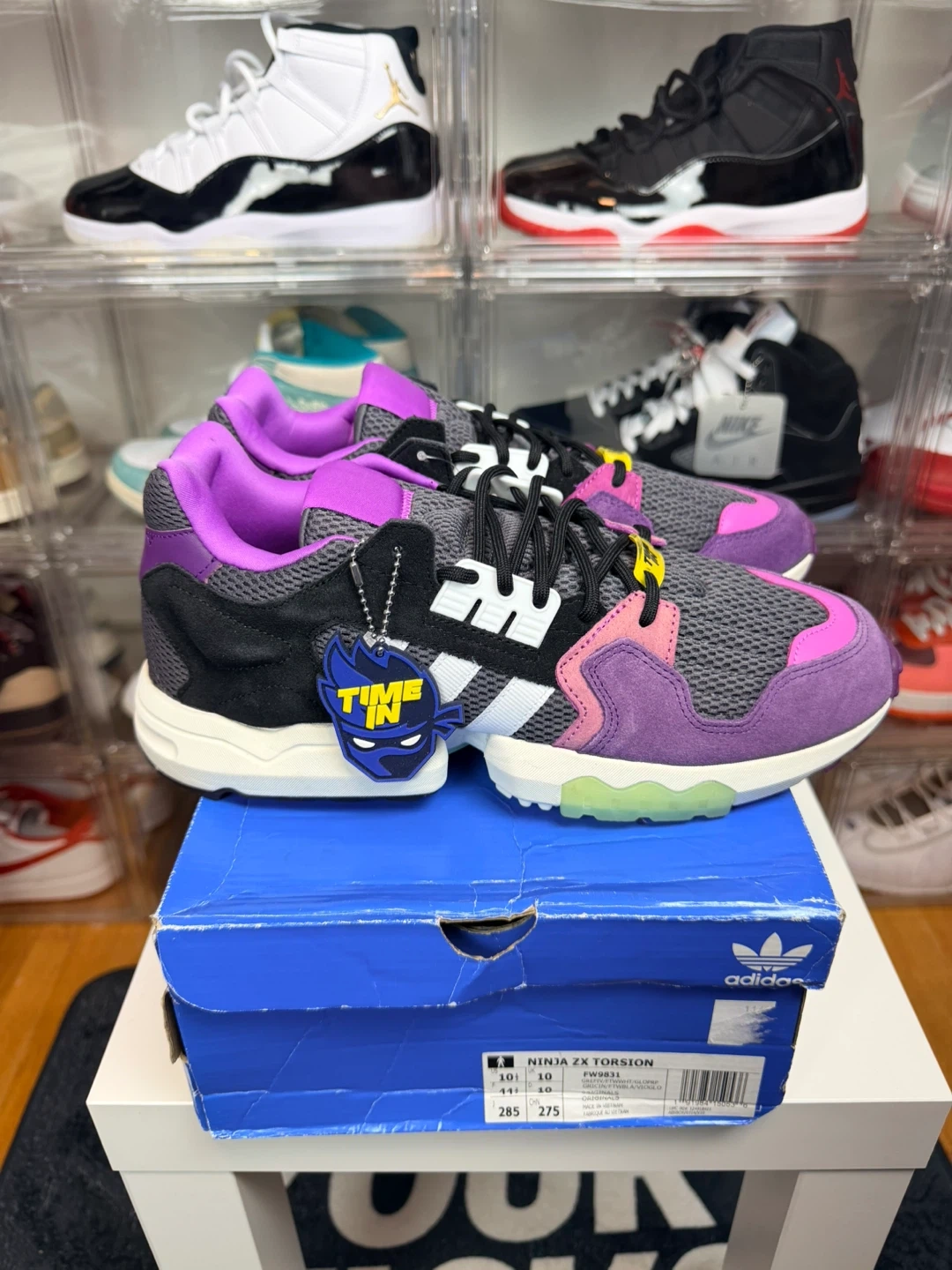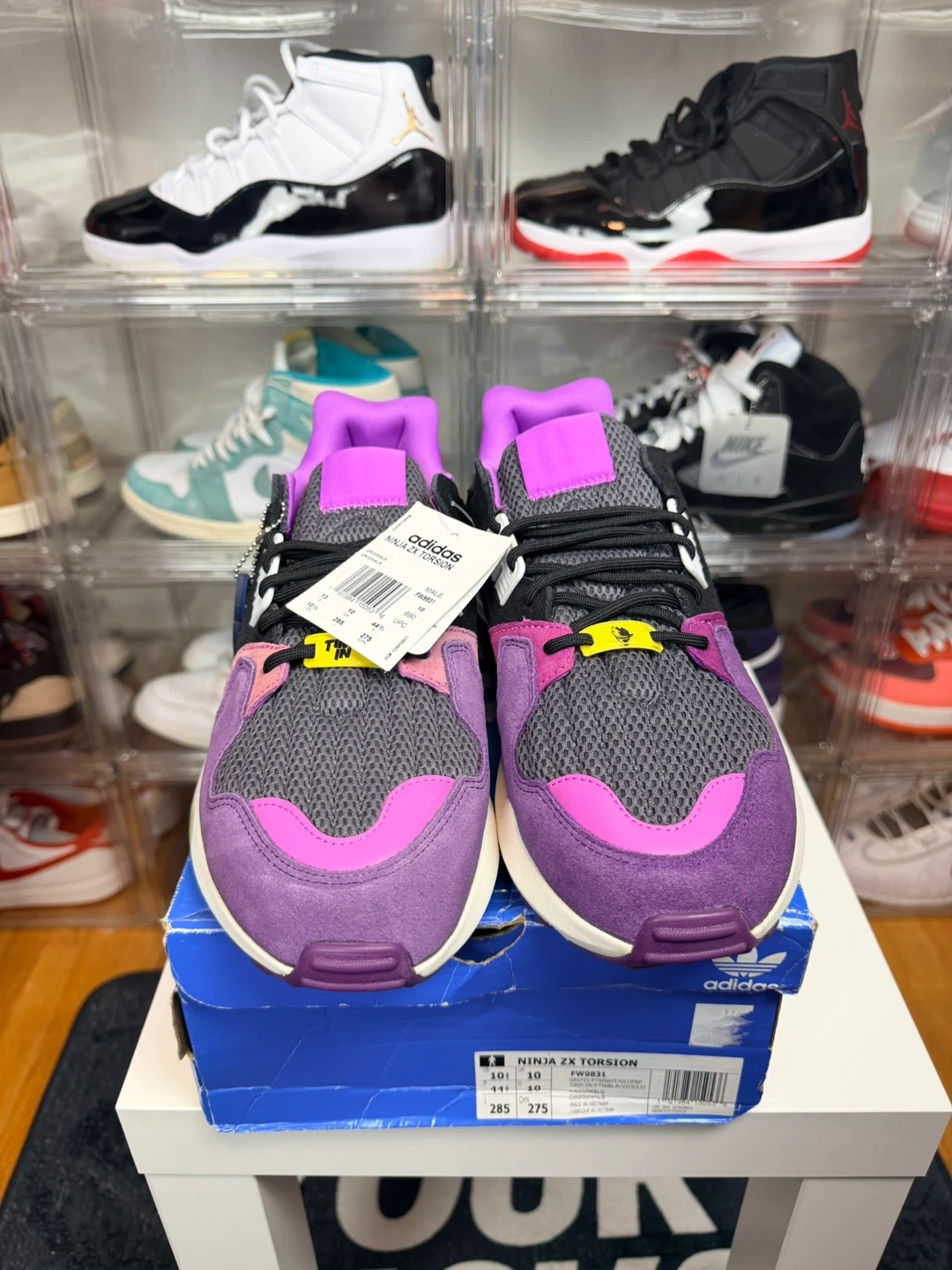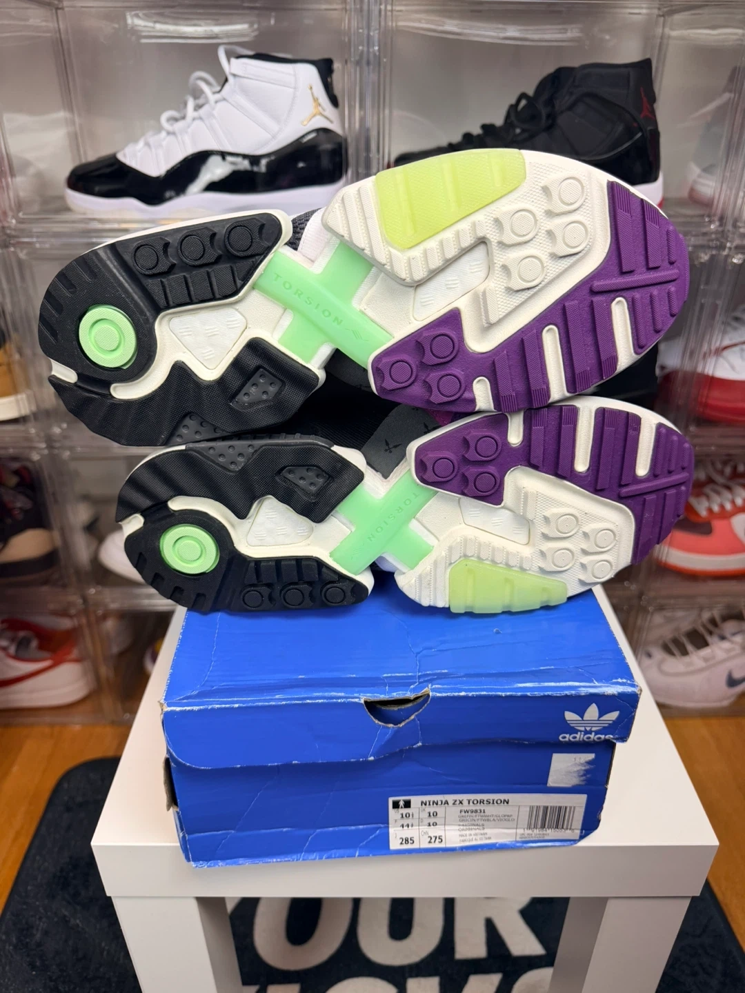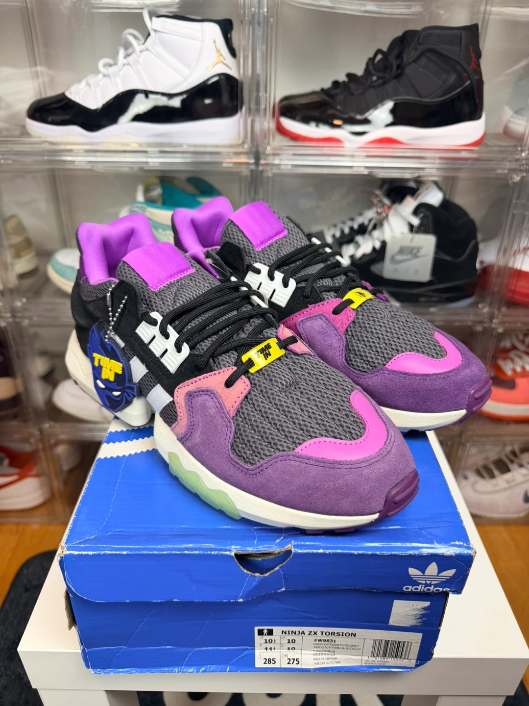 Selling a pair of Adidas Ninja ZX Torsion shoes in size 10! They come with the original box. The shoes feature a unique design with black, grey, and purple accents. Perfect for adding a pop of colour to your wardrobe!