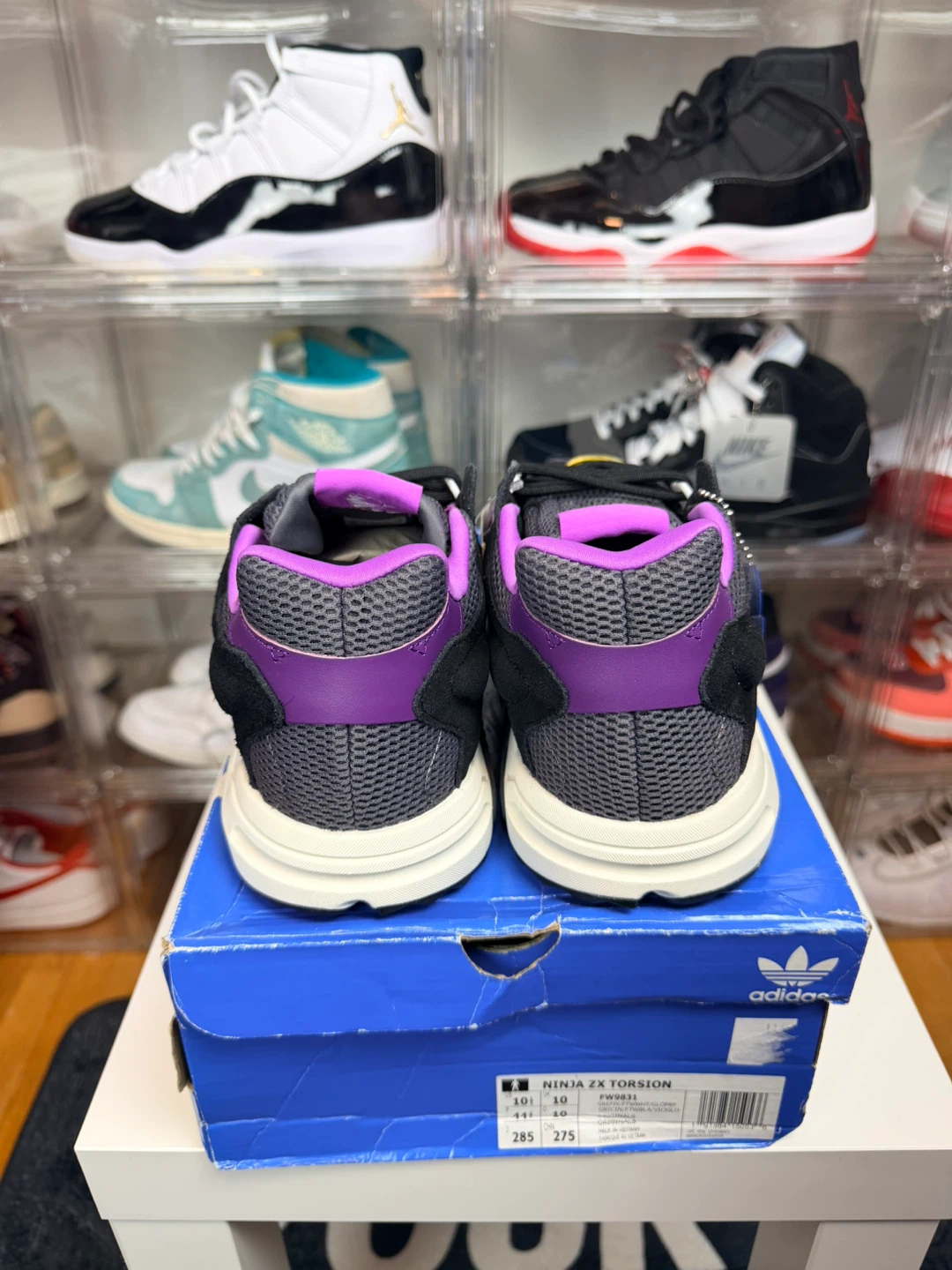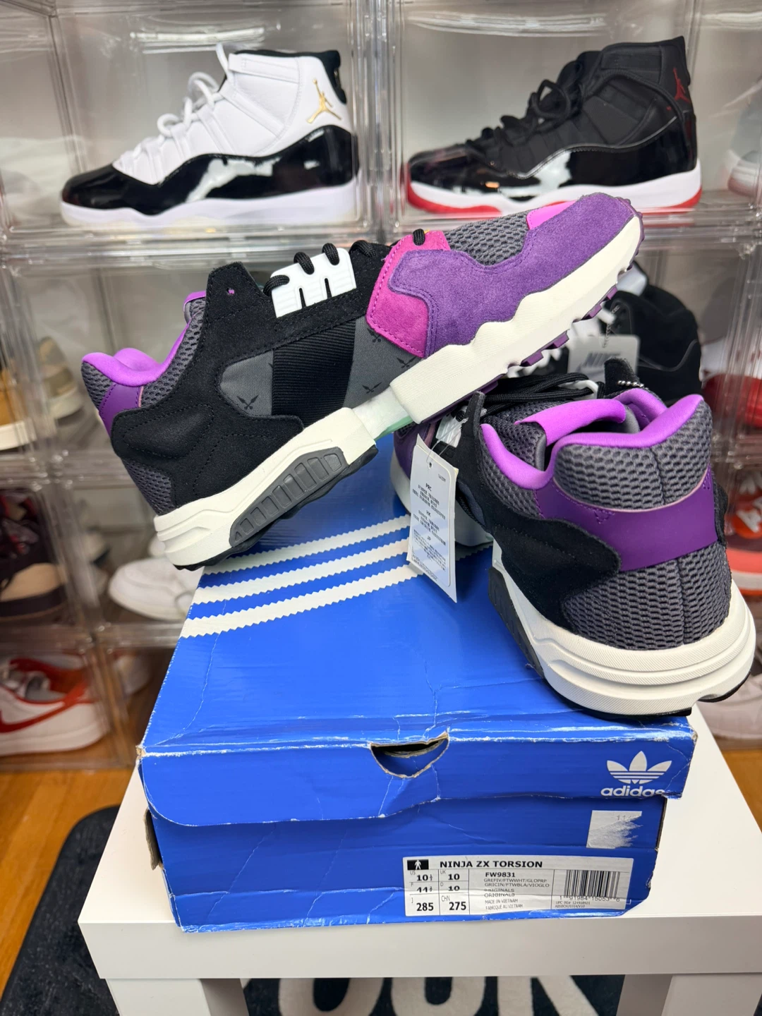 Selling a pair of Adidas Ninja ZX Torsion shoes in size 10! They come with the original box. The shoes feature a unique design with black, grey, and purple accents. Perfect for adding a pop of colour to your wardrobe!