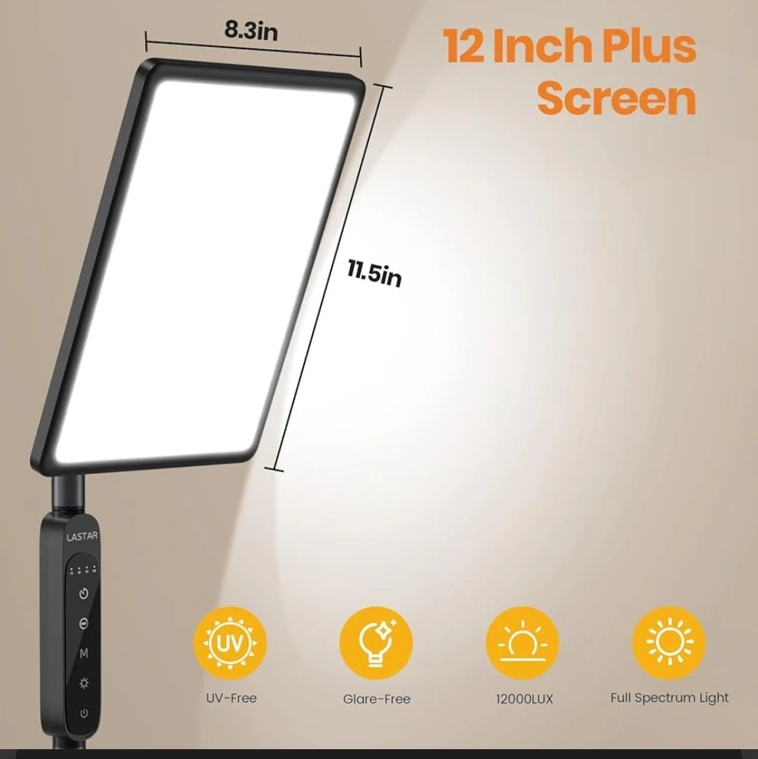 This LASTAR floor lamp offers 12,000 lux brightness and has 4 colour temperatures and 5 brightness levels. It features touch and remote controls for easy adjustment. The screen is 12 inches plus, measuring 8.3in x 11.5in.