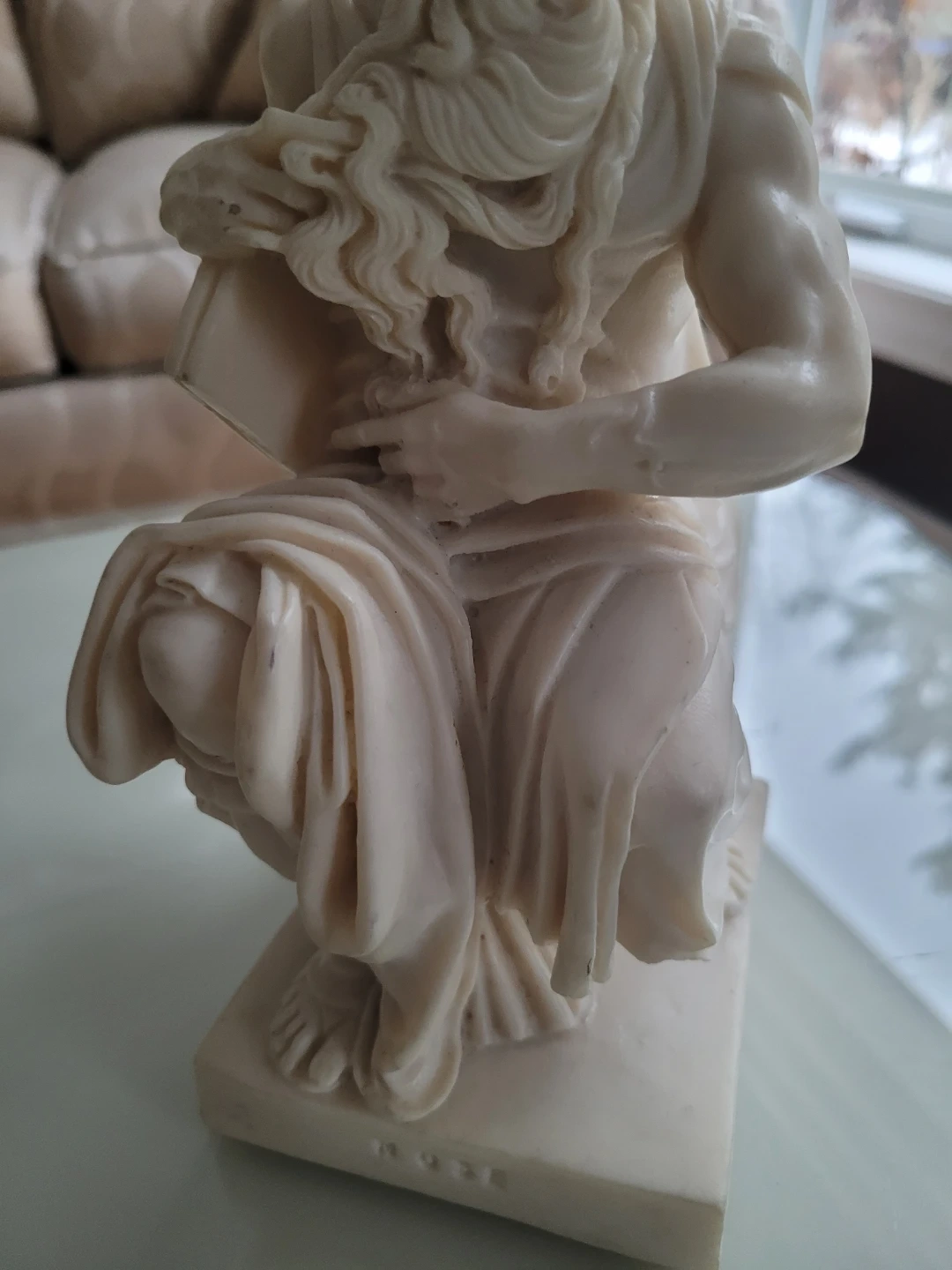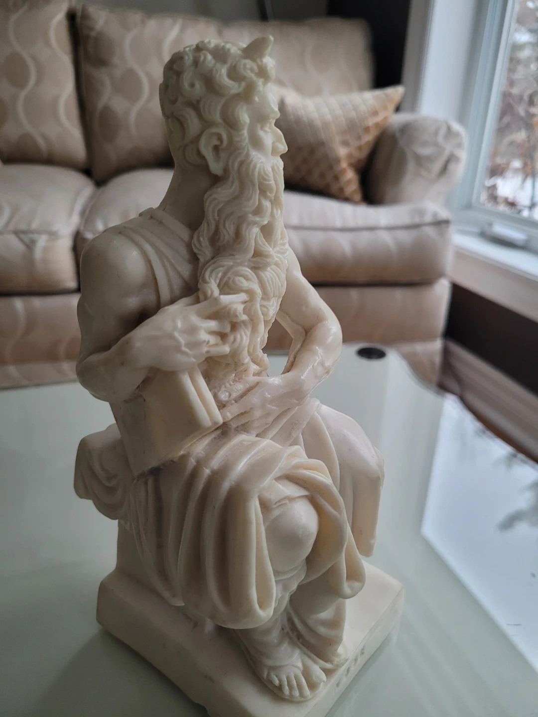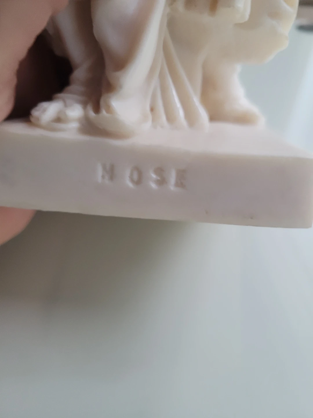 This is a vtg statue of Horns of Moses. It appears to be made of a resin or alabaster like material--heavy. The inscription "MOSE" is visible on the base, he is carrying a book, probably the 10 commandments.