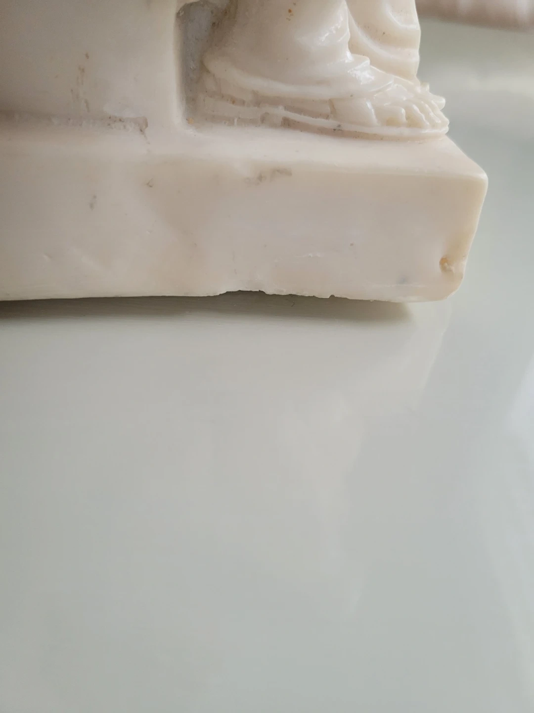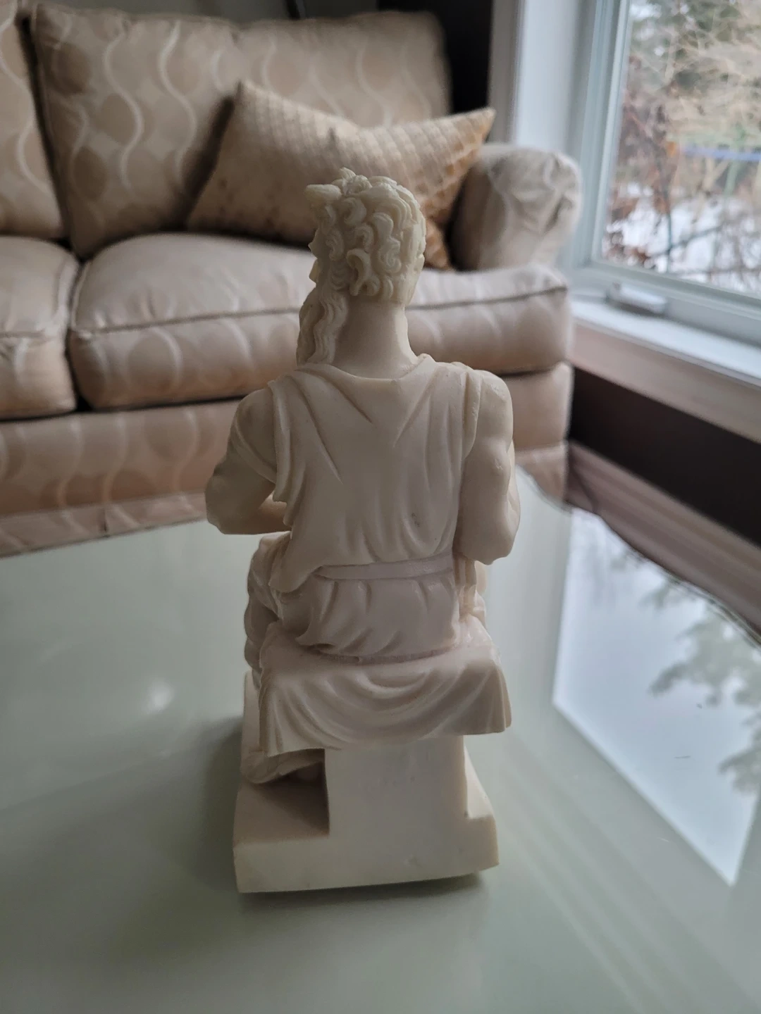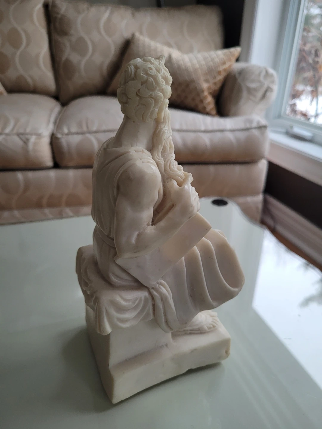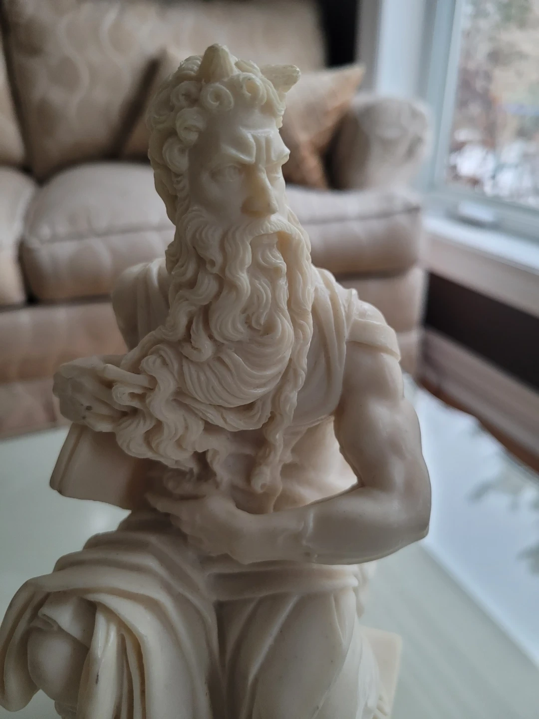 This is a vtg statue of Horns of Moses. It appears to be made of a resin or alabaster like material--heavy. The inscription "MOSE" is visible on the base, he is carrying a book, probably the 10 commandments.