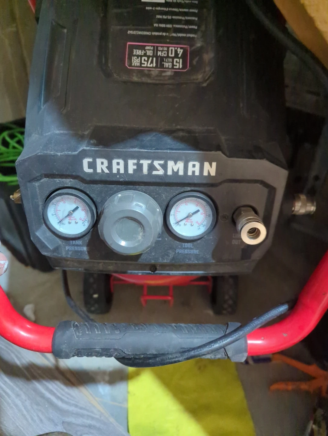 Selling a Craftsman air compressor. It's a 15-gallon tank with a maximum pressure of 175 PSI. It's an oil-free pump and operates at 120V 60Hz 15A. Model number is CMXECXA0231542.
