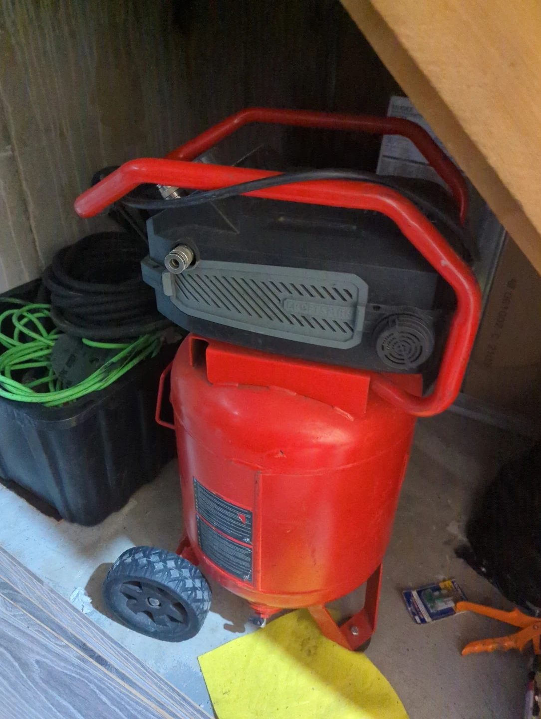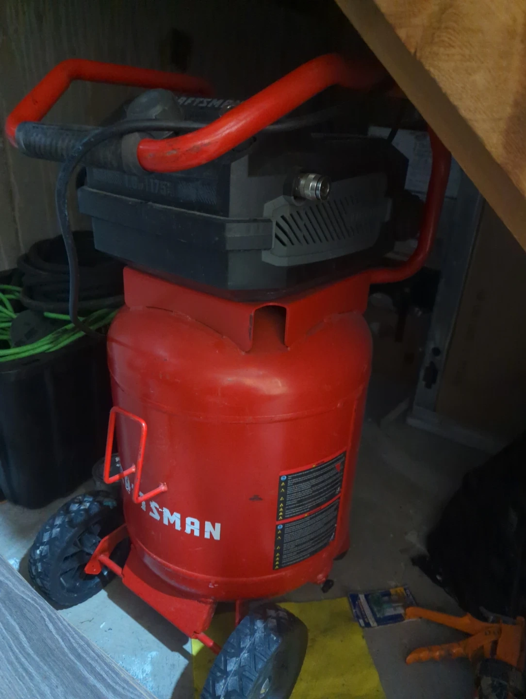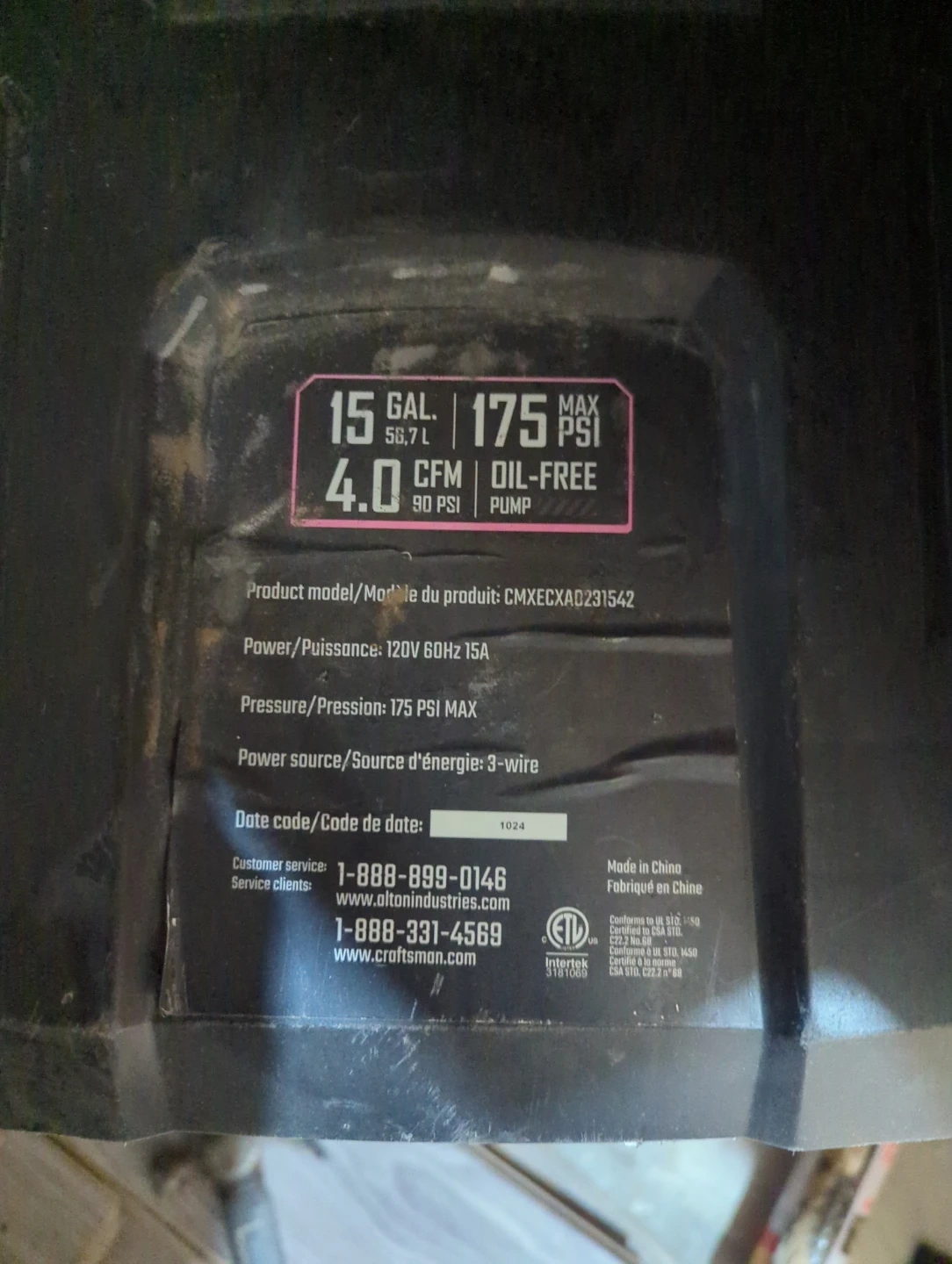 Selling a Craftsman air compressor. It's a 15-gallon tank with a maximum pressure of 175 PSI. It's an oil-free pump and operates at 120V 60Hz 15A. Model number is CMXECXA0231542.