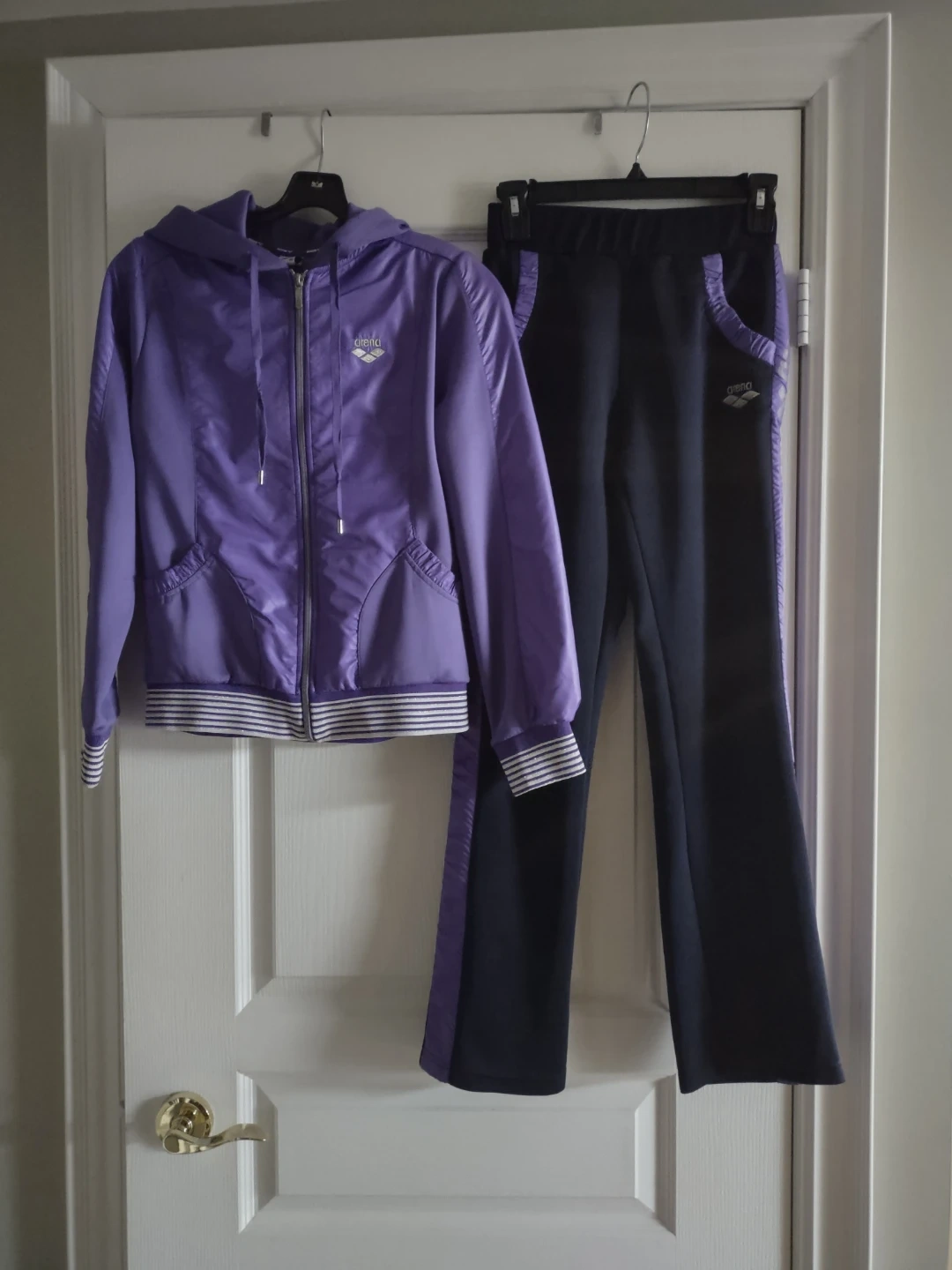 This Arena tracksuit set includes a purple hooded jacket and black track pants. Both pieces feature the Arena logo and purple stripe accents. It's a great combo for active days!