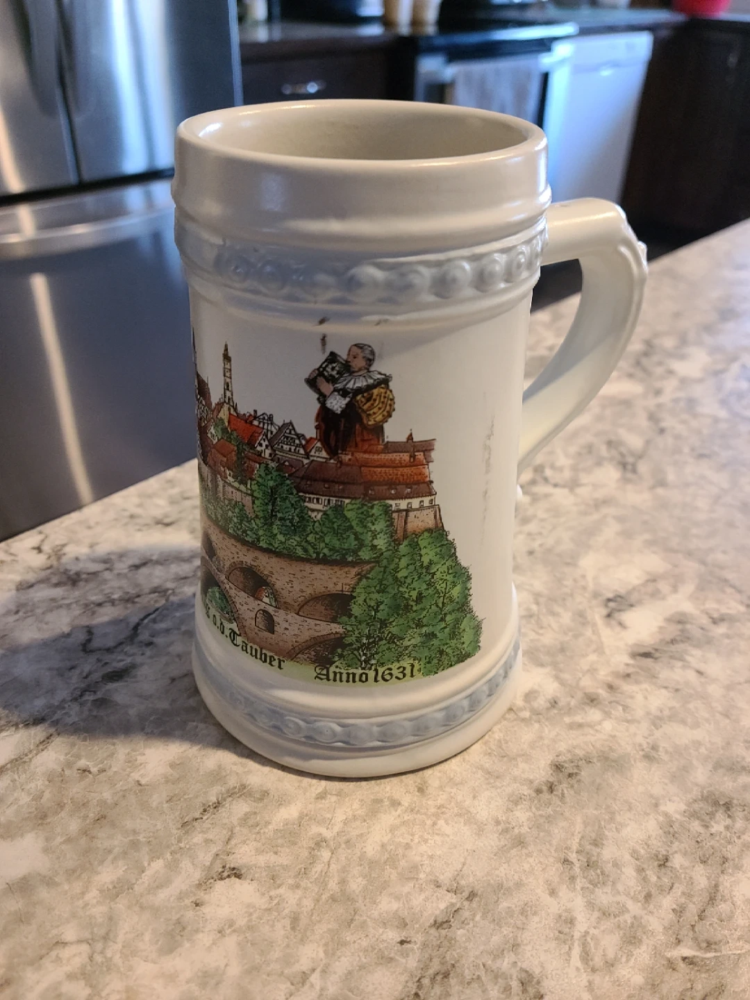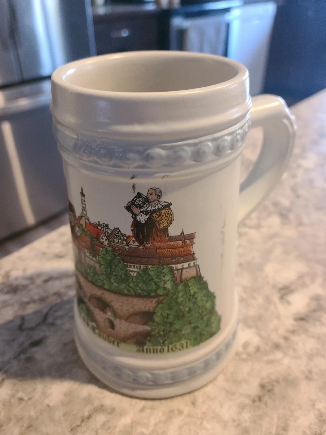 This ceramic mug features a detailed historic town scene with the inscription "Rothenburg ob der Tauber" and "Anno 1631". It's a decorative piece suitable for display or as a unique souvenir. Ceramic construction.