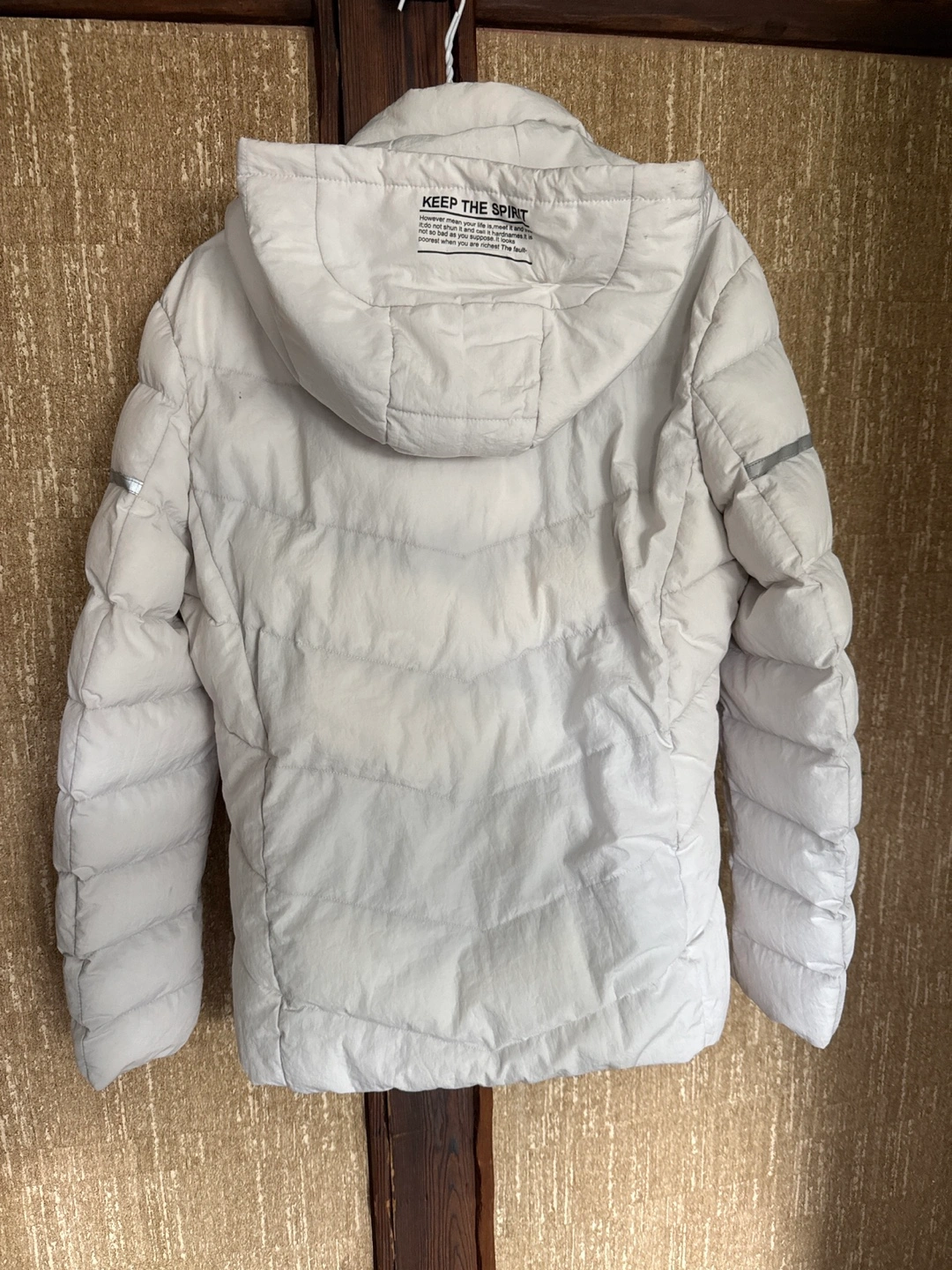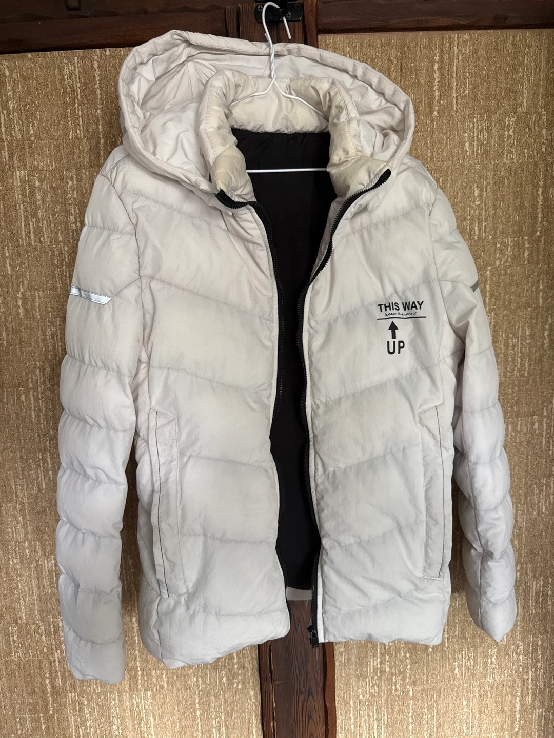 A puffer jacket with a hood. Features a front zipper. Includes pockets. Perfect for those cool evenings when you want to take a quiet walk.