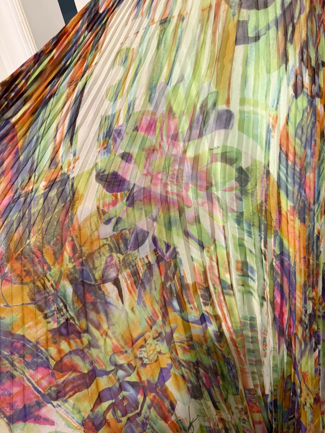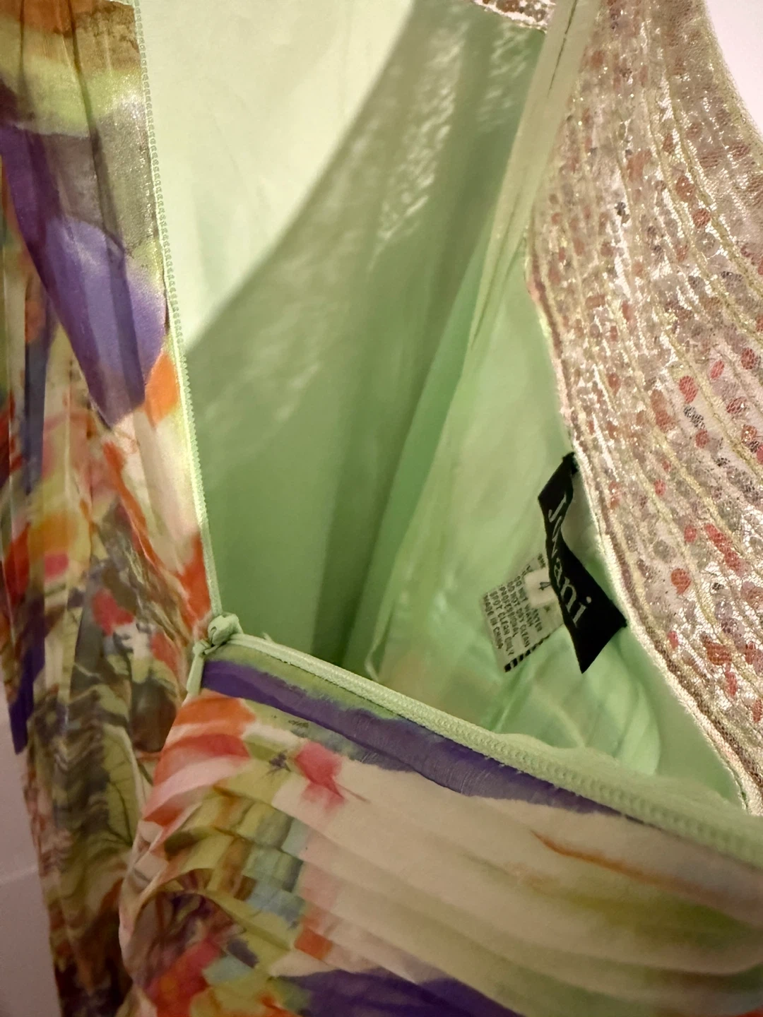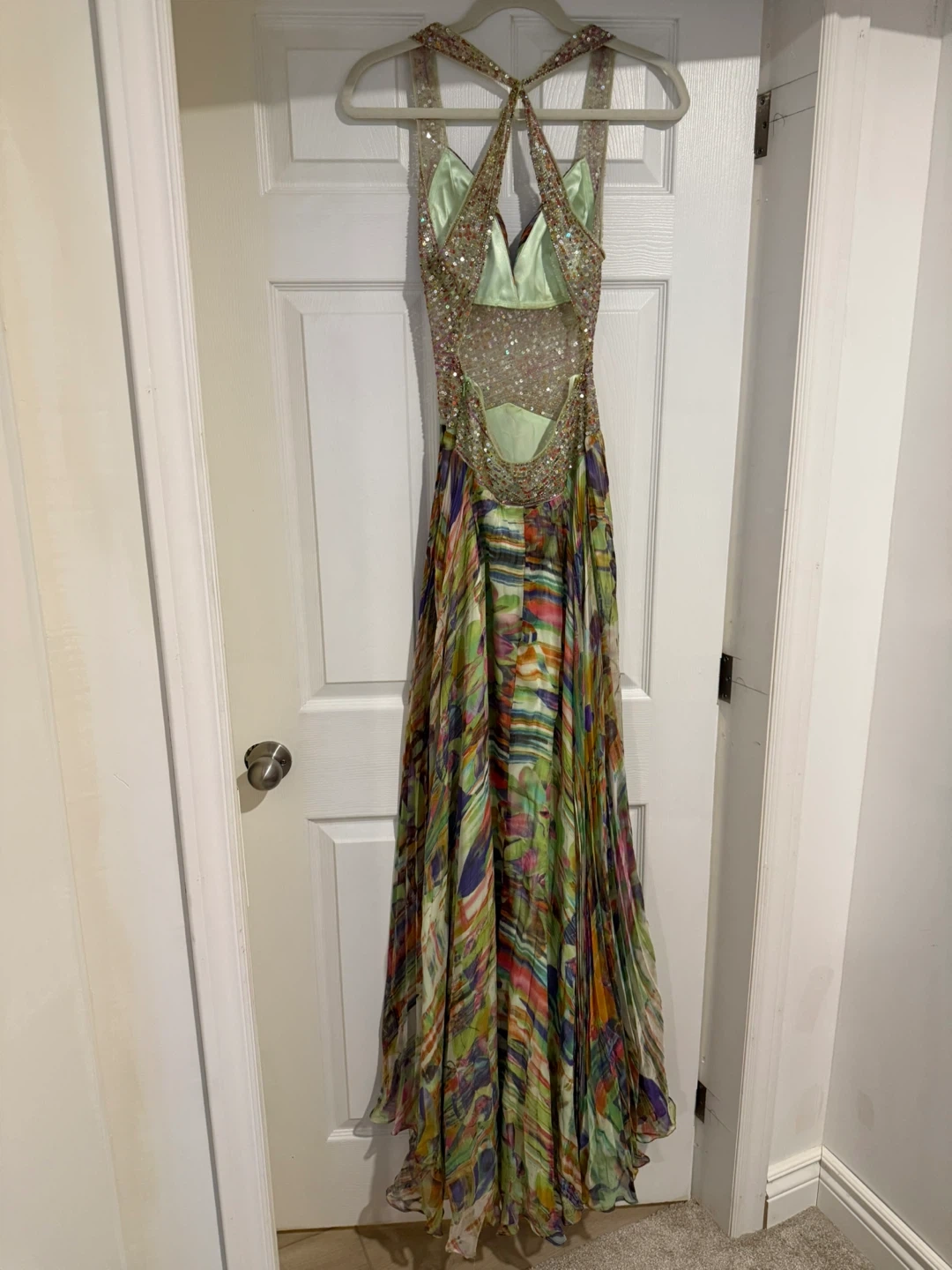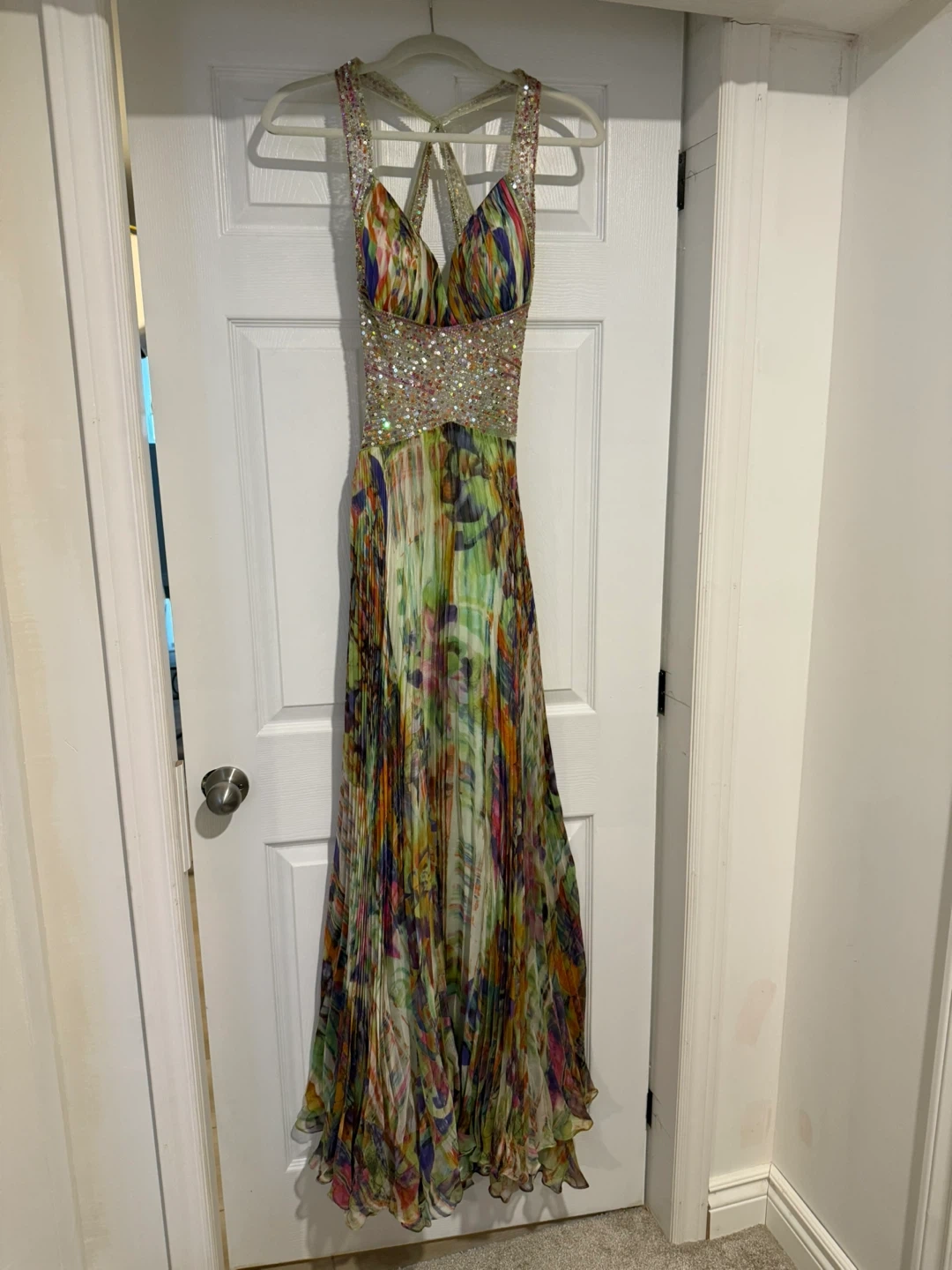 This stunning maxi dress features a vibrant, abstract print with intricate beadwork along the bodice and straps. It has a flattering halter neckline and a flowing, pleated skirt. Perfect for prom or a special occasion.