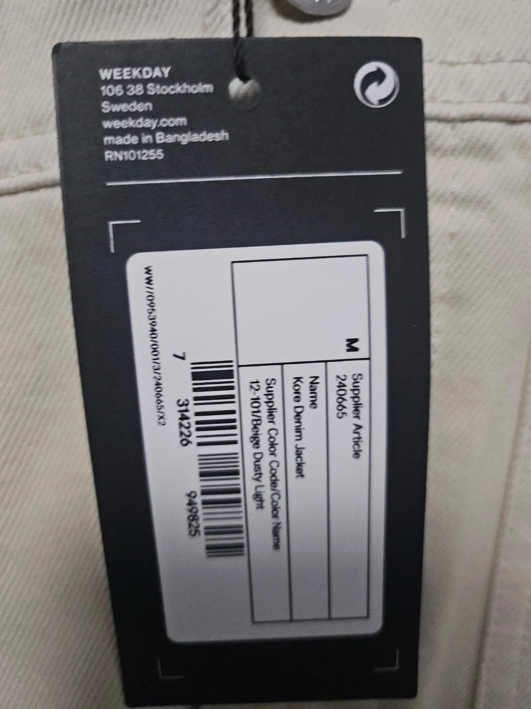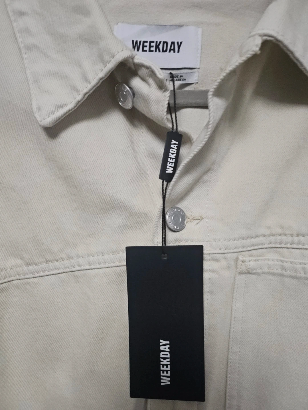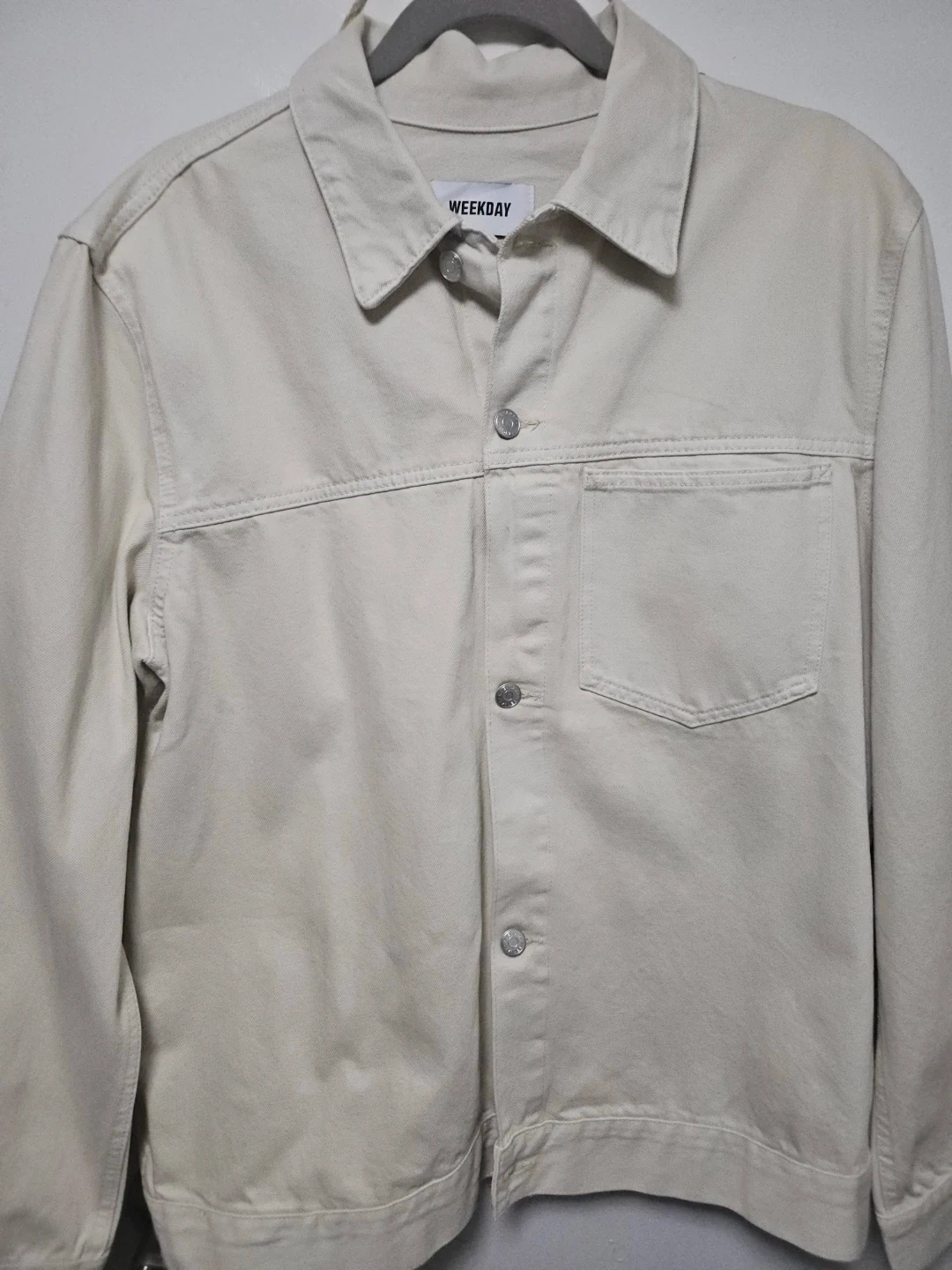 This is a beige denim jacket from Weekday. It features a classic button-up front and chest pockets. The jacket's material appears to be cotton.