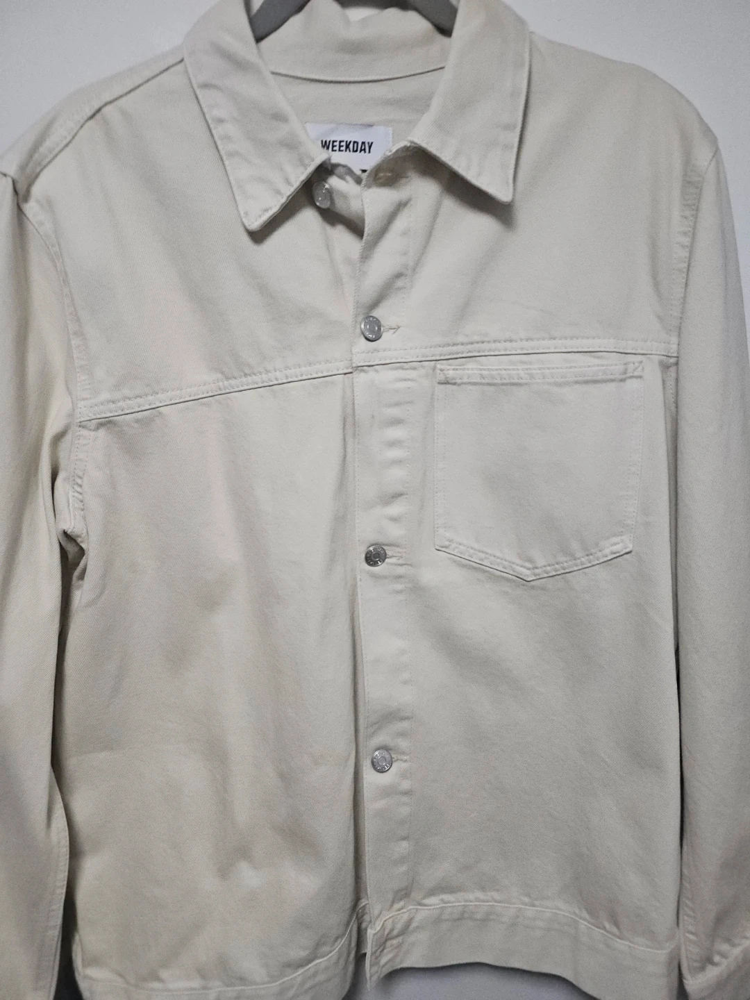 This is a beige denim jacket from Weekday. It features a classic button-up front and chest pockets. The jacket's material appears to be cotton.