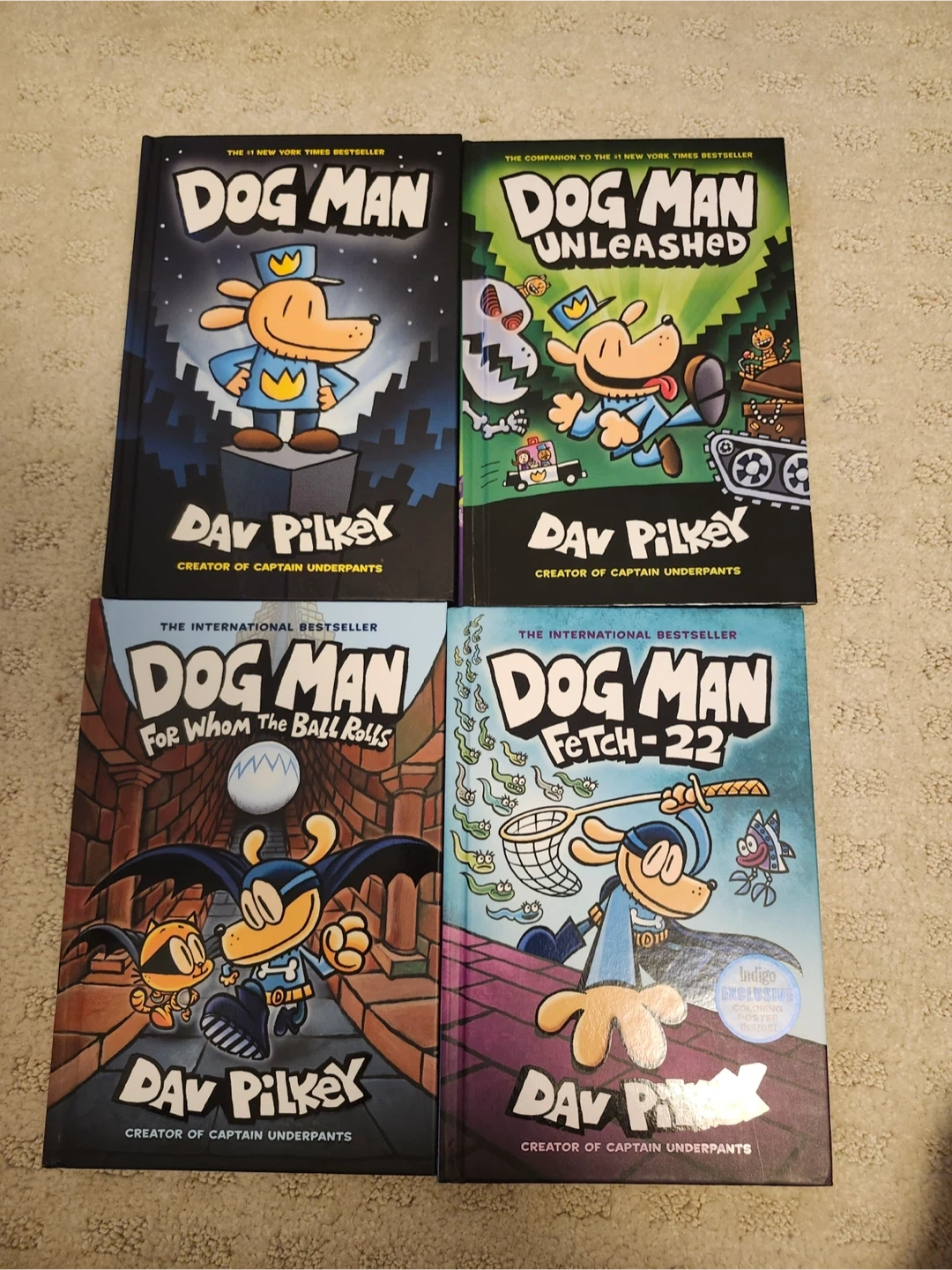 Four Dog Man books by Dav Pilkey. Includes Dog Man, Dog Man Unleashed, Dog Man for Whom the Ball Rolls, and Dog Man Fetch-22. I’m willing to negotiate lower prices or individual copies