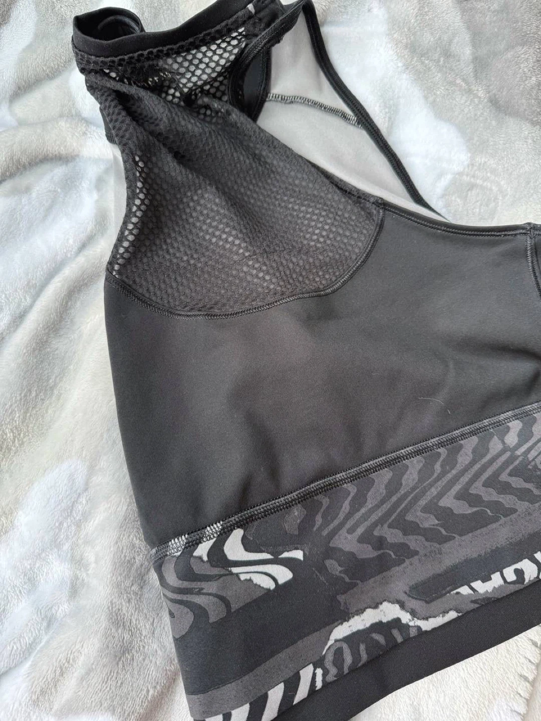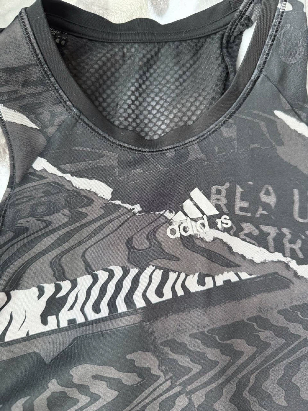 Women's athletic crop top. Black with a grey abstract print. Racerback style. Mesh panel at neckline. Great for workouts. Adidas the logo is a little faded