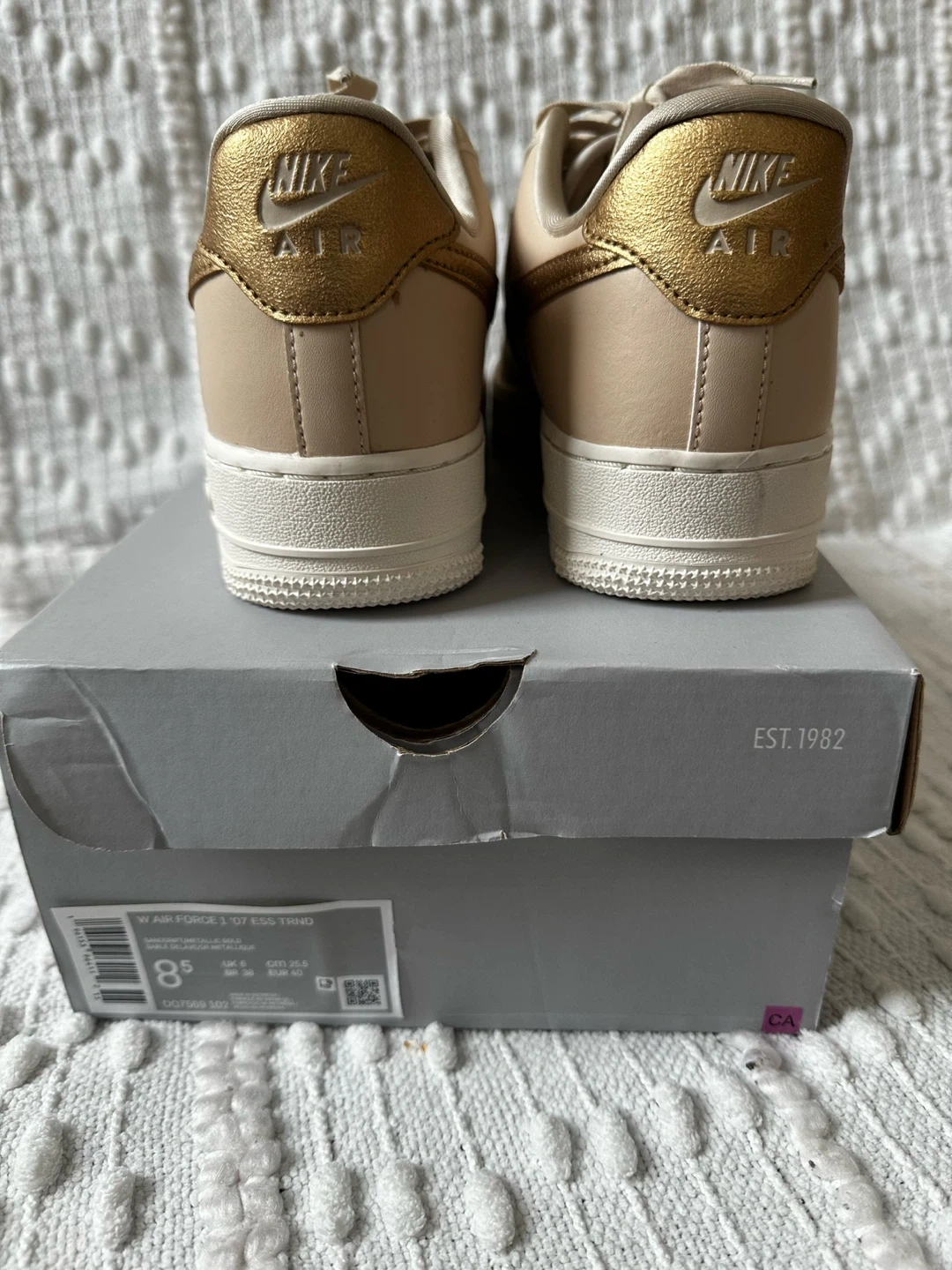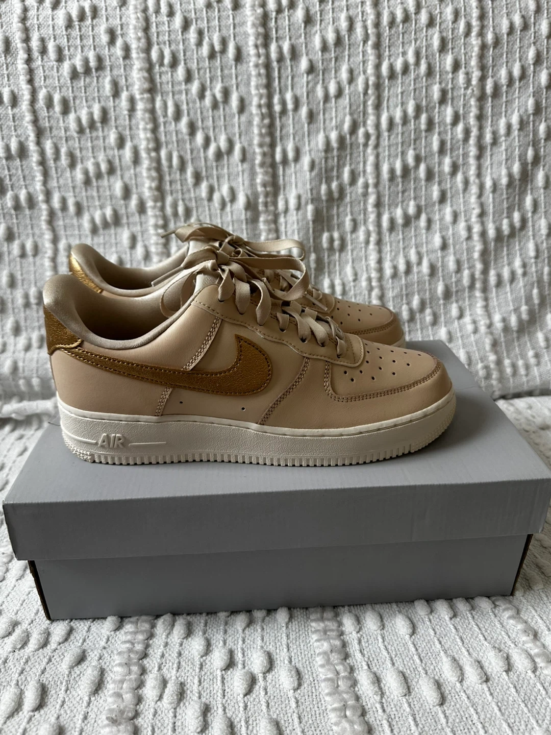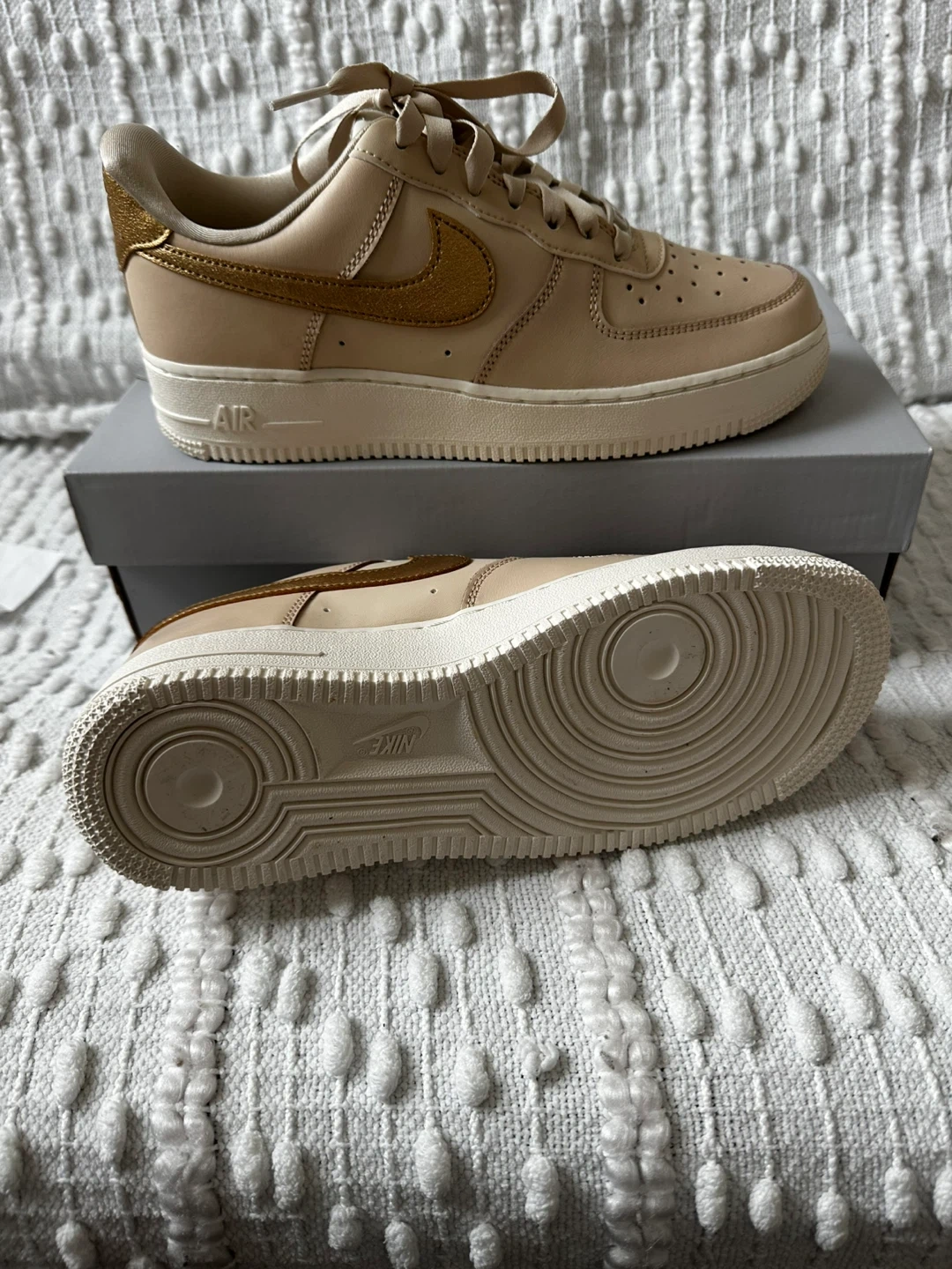 Classic Nike Air Force 1 '07 ESS sneakers in a light beige and gold colourway. These shoes are a timeless staple for any casual wardrobe. They're made with durable leather and feature the iconic Air sole unit for comfort.