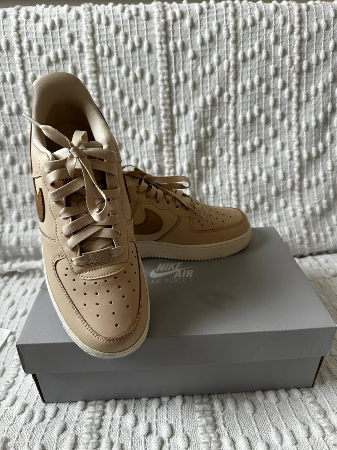 Classic Nike Air Force 1 '07 ESS sneakers in a light beige and gold colourway. These shoes are a timeless staple for any casual wardrobe. They're made with durable leather and feature the iconic Air sole unit for comfort.