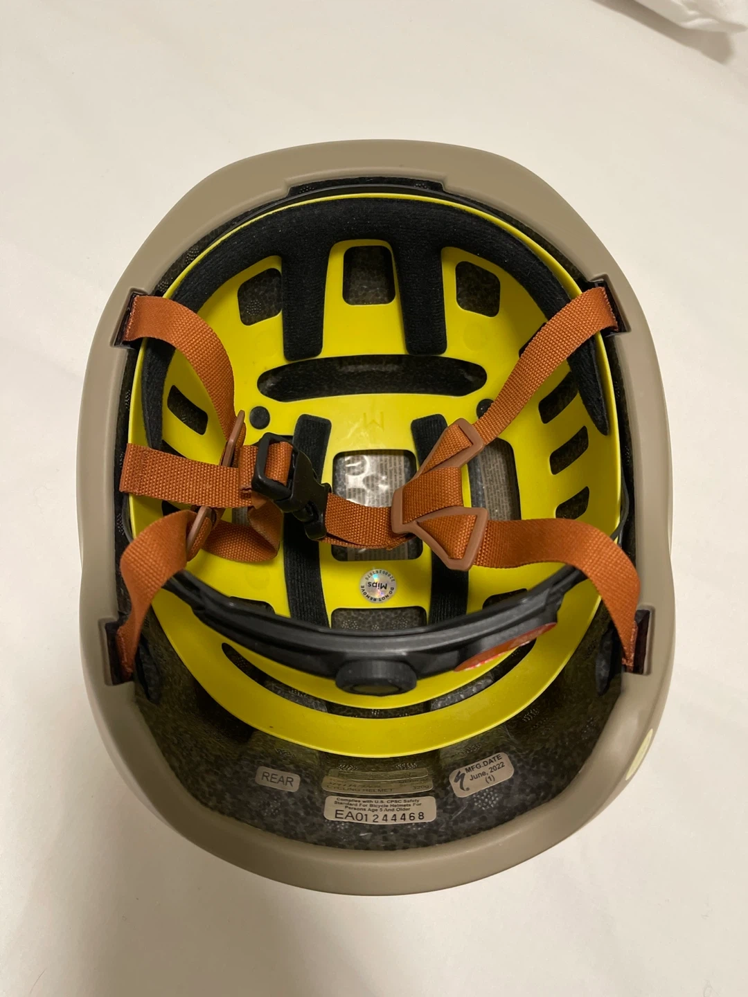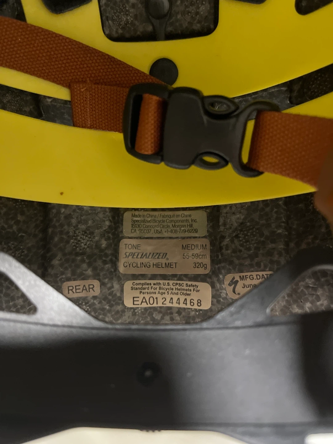 Specialized cycling helmet, model TONE. It's a medium size, fitting 55-59cm. This helmet weighs 320g. Manufactured in June 2022. It complies with U.S. CPSC Safety Standard for Bicycle Helmets.