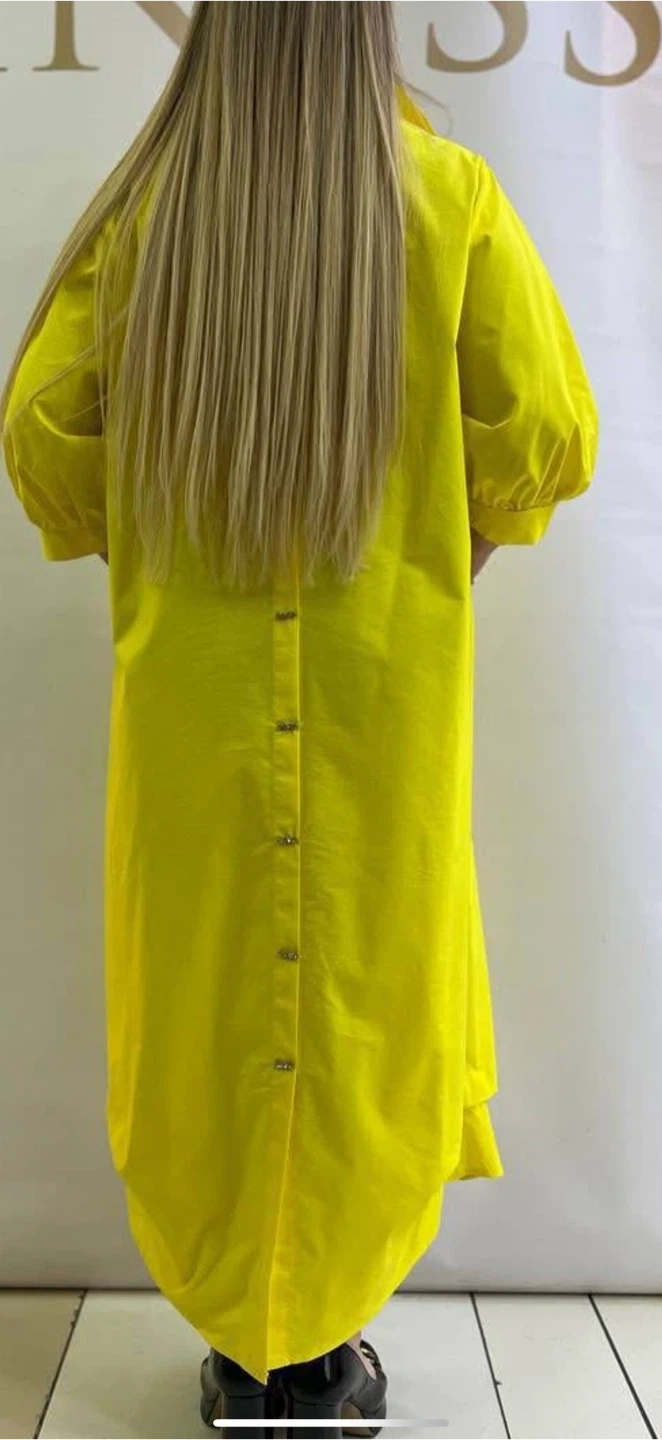 A bright yellow dress, perfect for adding a pop of colour to your wardrobe! It features a unique button