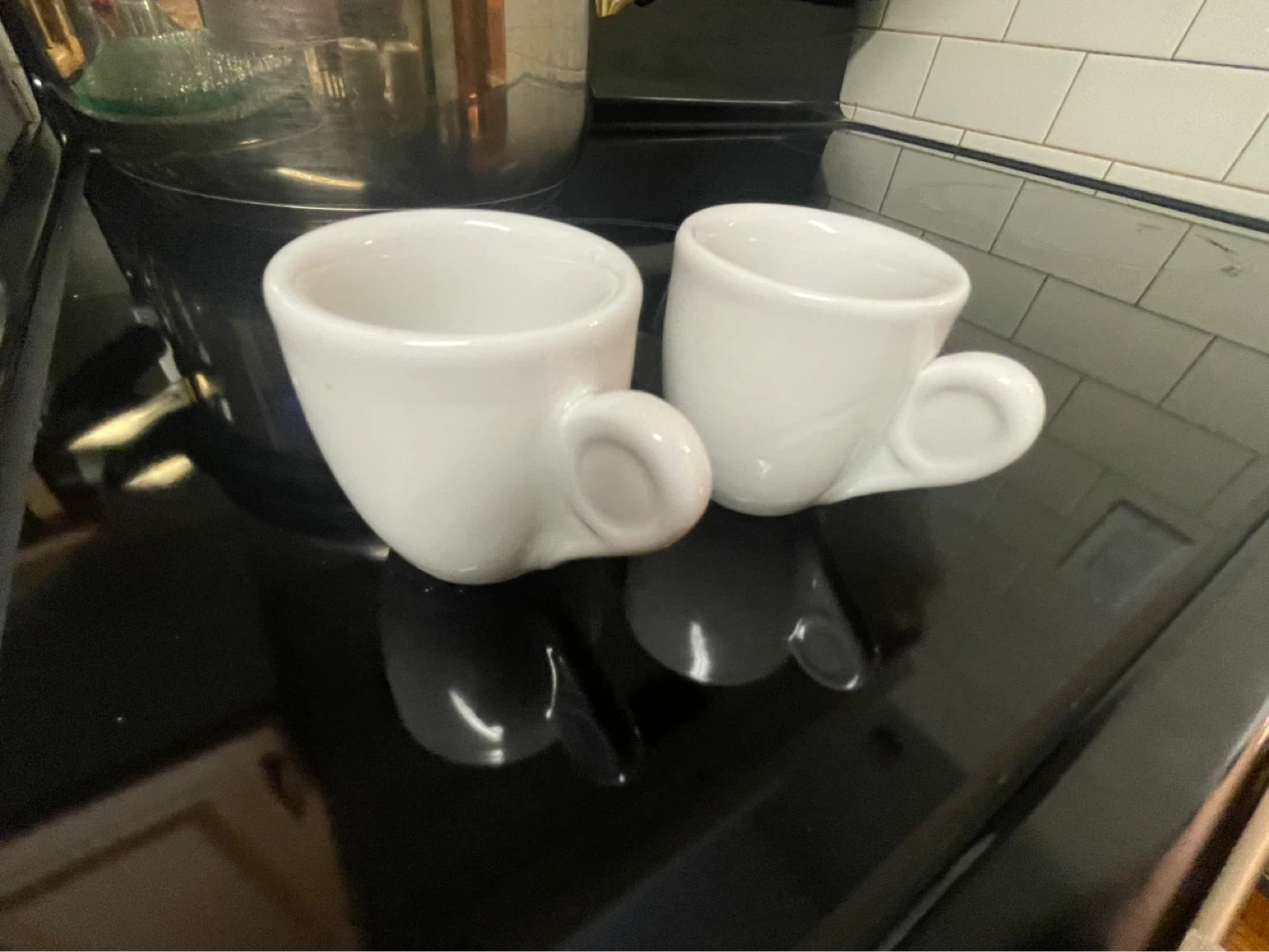 Two small white porcelain espresso cups from Ionia, Greece. These cups are designed for espresso or small drinks. Made of durable porcelain.